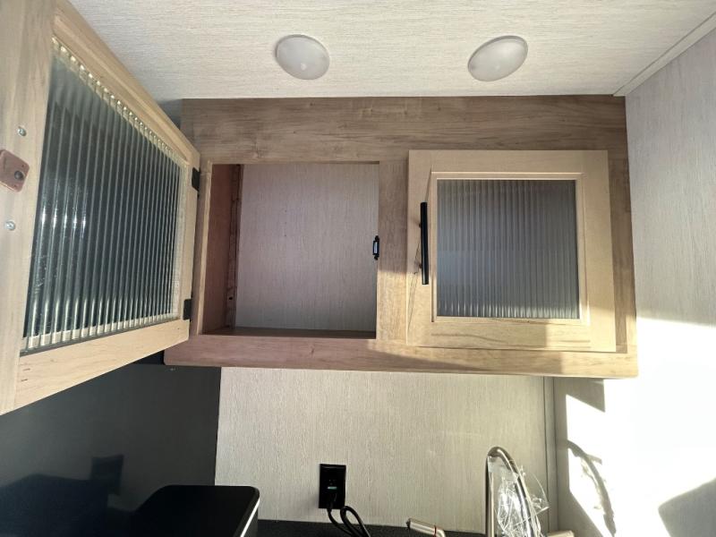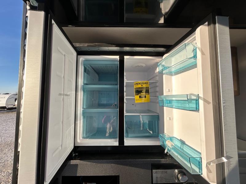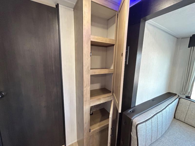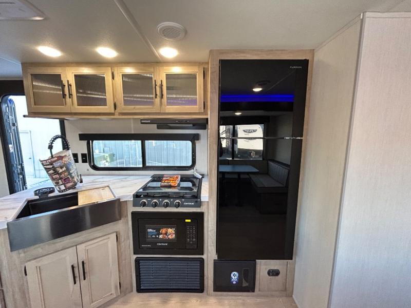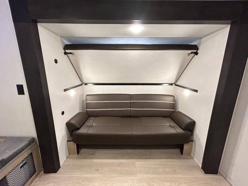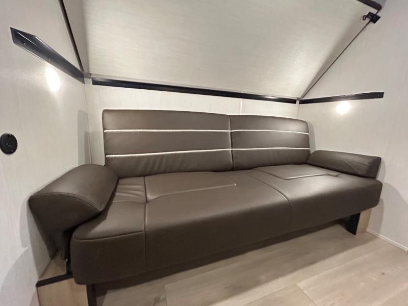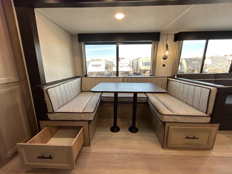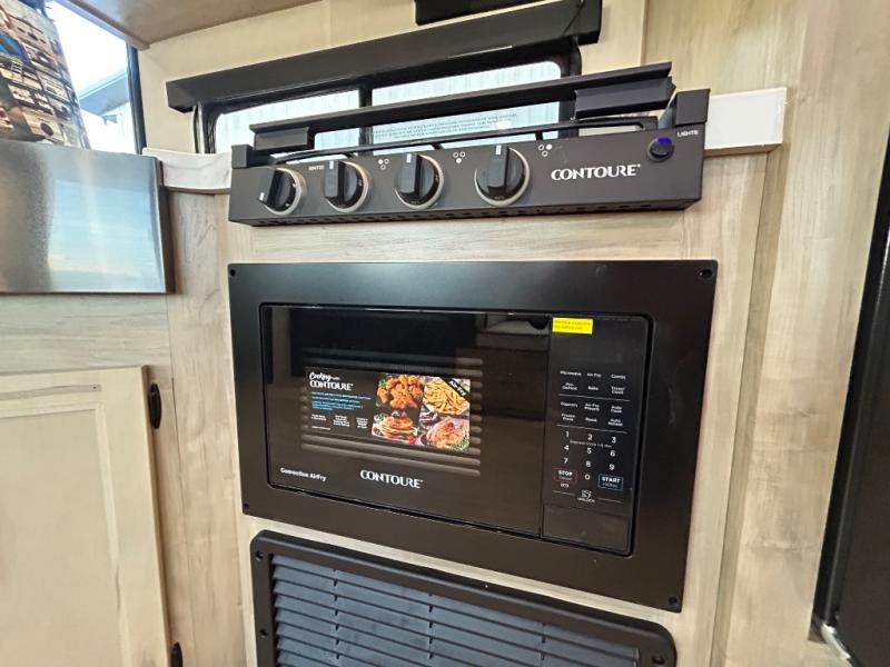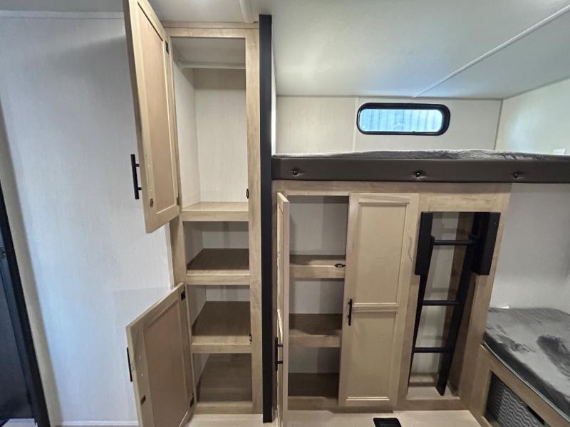 Double slides create spacious living areas in this travel trailer! The chef can prepare their best meals either indoors with the three burner cooktop and air fryer microwave, or at the outdoor kitchen. The kids or guests can sleep in the rear private bunkhouse with a bunk, double bunk, and flip-up bunk above a sofa. The front private bedroom has a walk around RV king bed for a great night's rest plus a wardrobe to keep your things organized. In the morning, everyone can meet in the combined kitchen and living room around the U-shaped dinette and sofa, and the fireplace here will make it feel more like home.