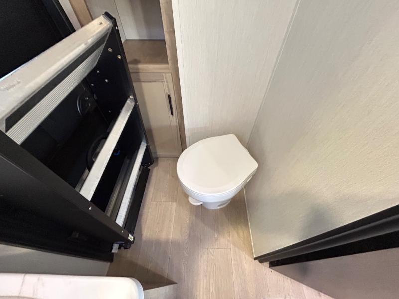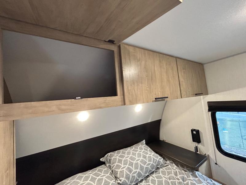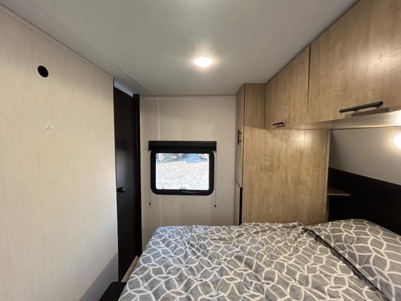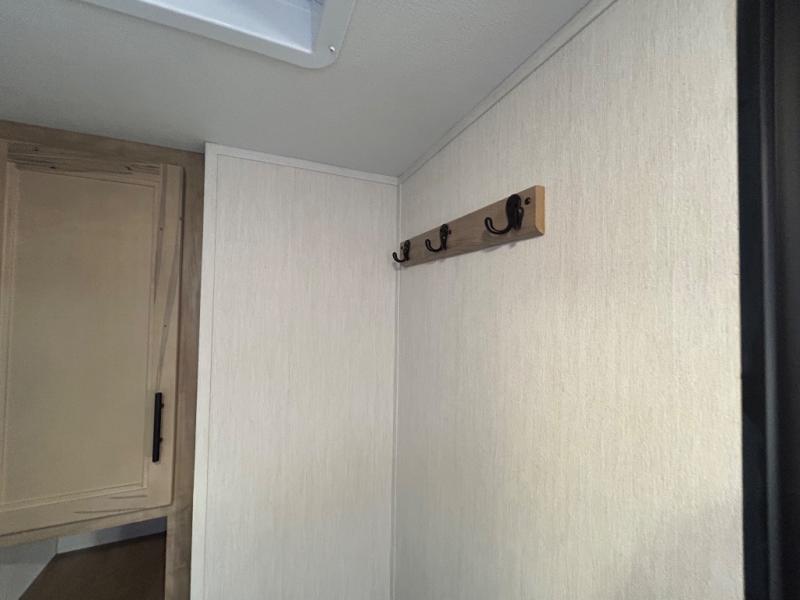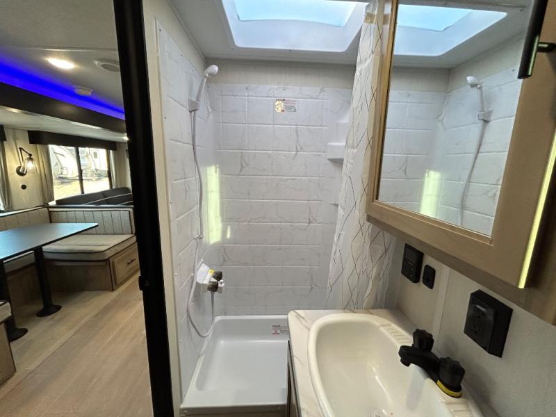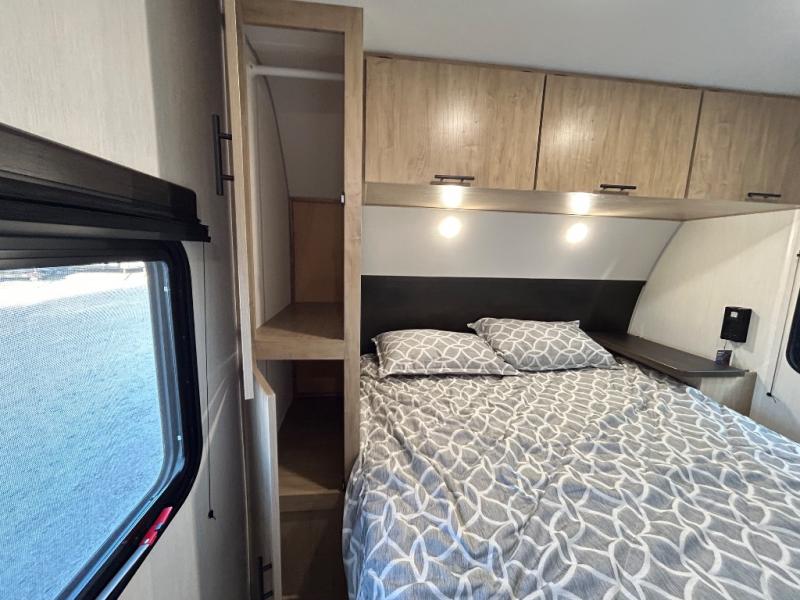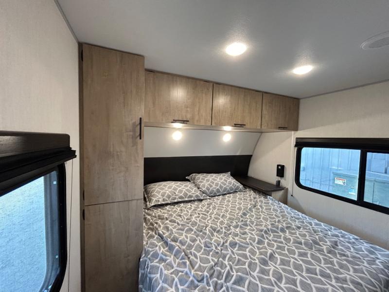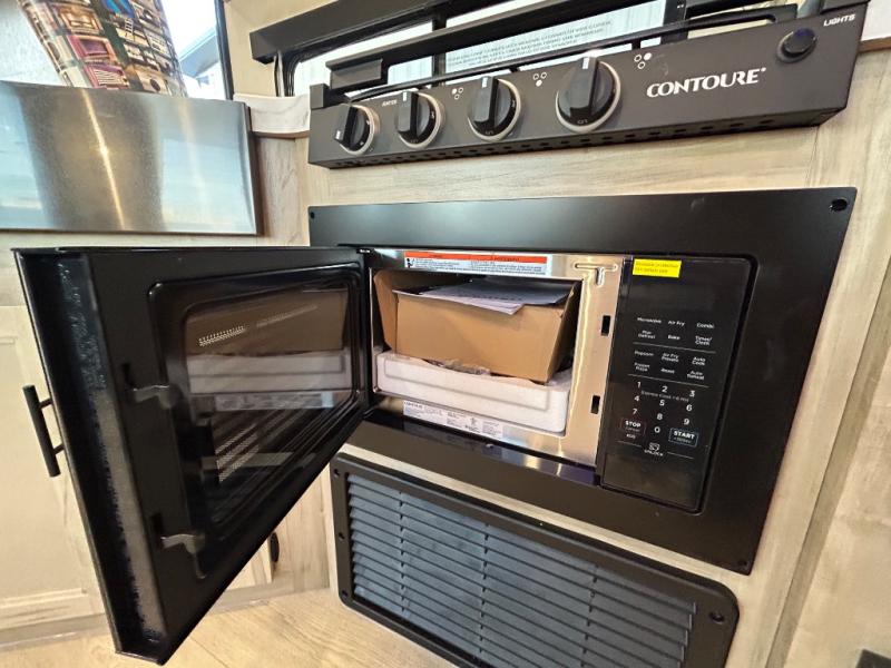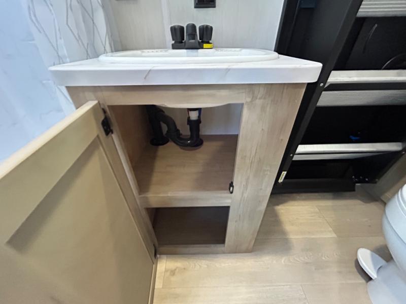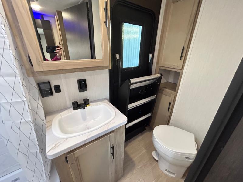 Double slides create spacious living areas in this travel trailer! The chef can prepare their best meals either indoors with the three burner cooktop and air fryer microwave, or at the outdoor kitchen. The kids or guests can sleep in the rear private bunkhouse with a bunk, double bunk, and flip-up bunk above a sofa. The front private bedroom has a walk around RV king bed for a great night's rest plus a wardrobe to keep your things organized. In the morning, everyone can meet in the combined kitchen and living room around the U-shaped dinette and sofa, and the fireplace here will make it feel more like home.