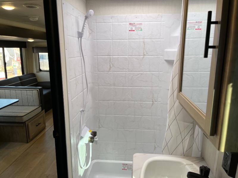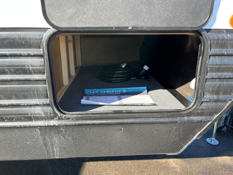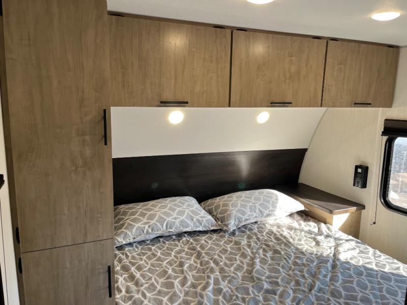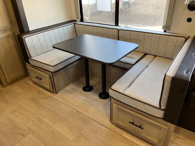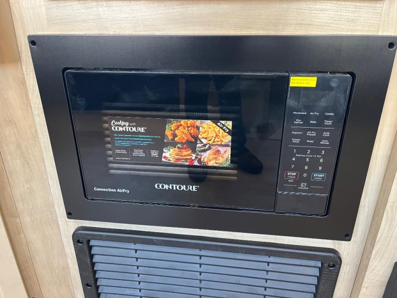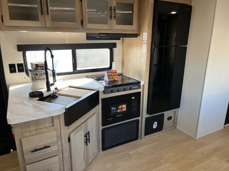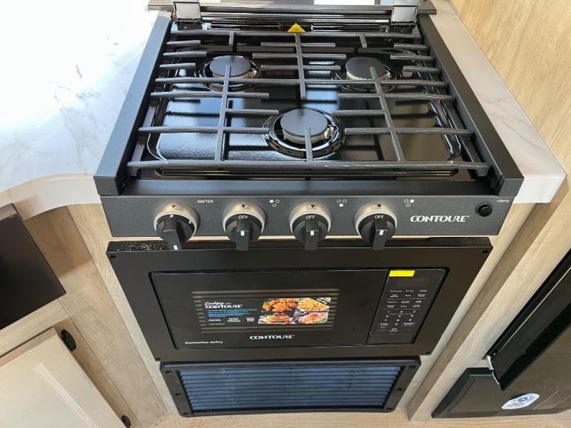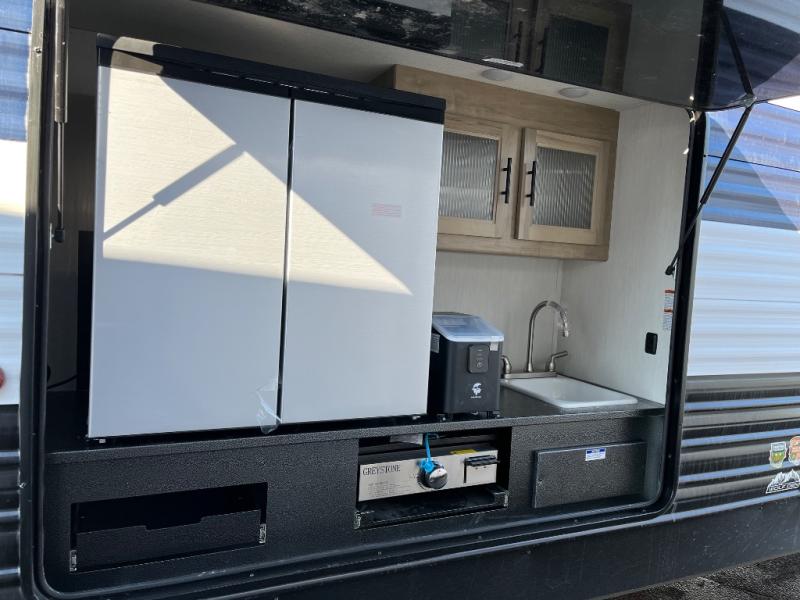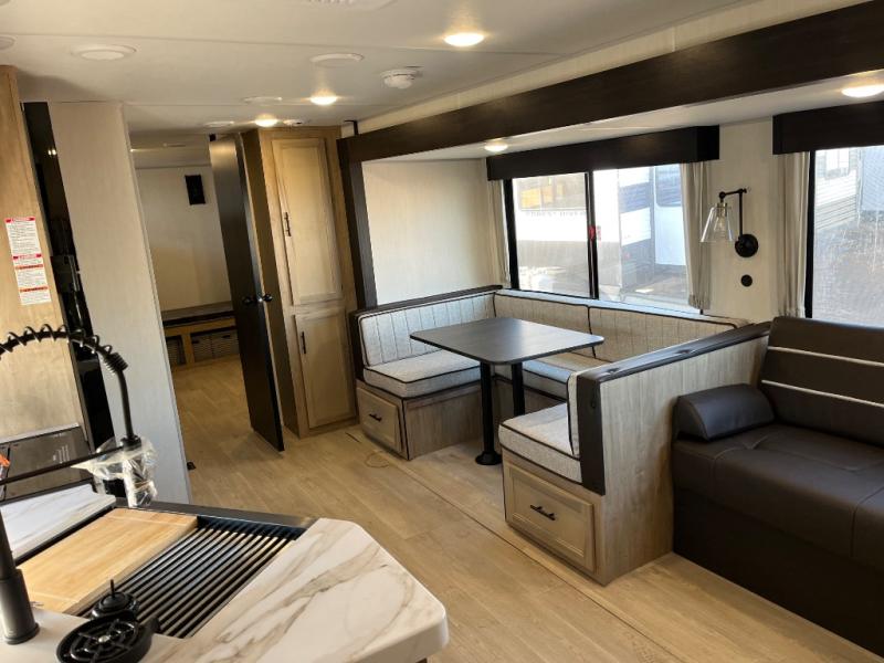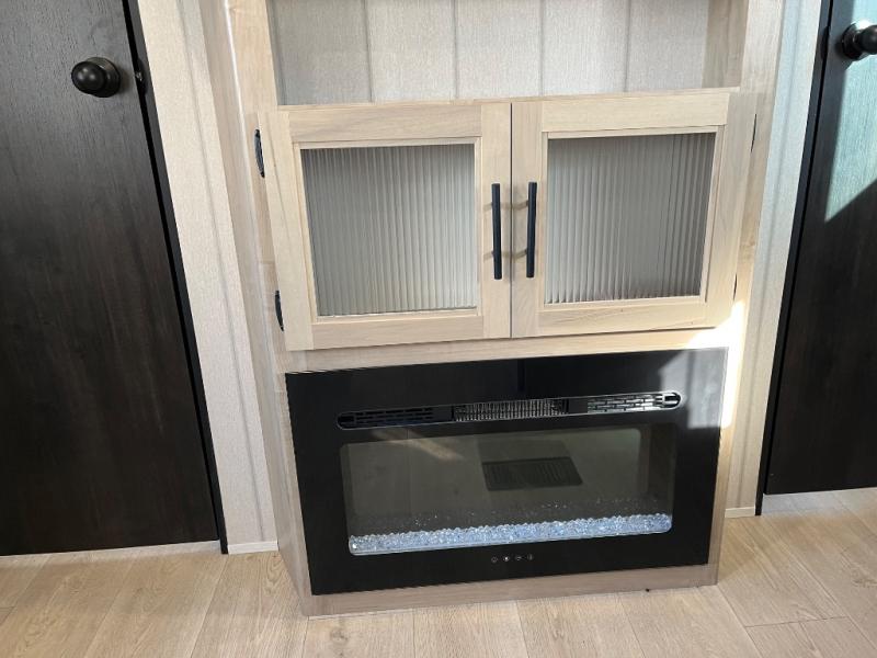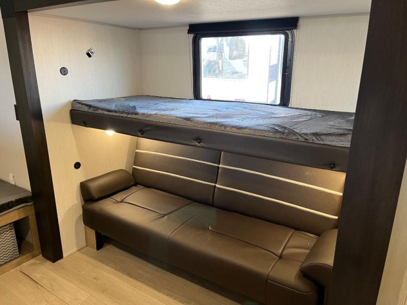 Double slides create spacious living areas in this travel trailer! The chef can prepare their best meals either indoors with the three burner cooktop and air fryer microwave, or at the outdoor kitchen. The kids or guests can sleep in the rear private bunkhouse with a bunk, double bunk, and flip-up bunk above a sofa. The front private bedroom has a walk around RV king bed for a great night's rest plus a wardrobe to keep your things organized. In the morning, everyone can meet in the combined kitchen and living room around the U-shaped dinette and sofa, and the fireplace here will make it feel more like home.