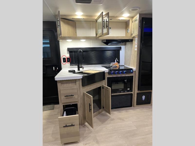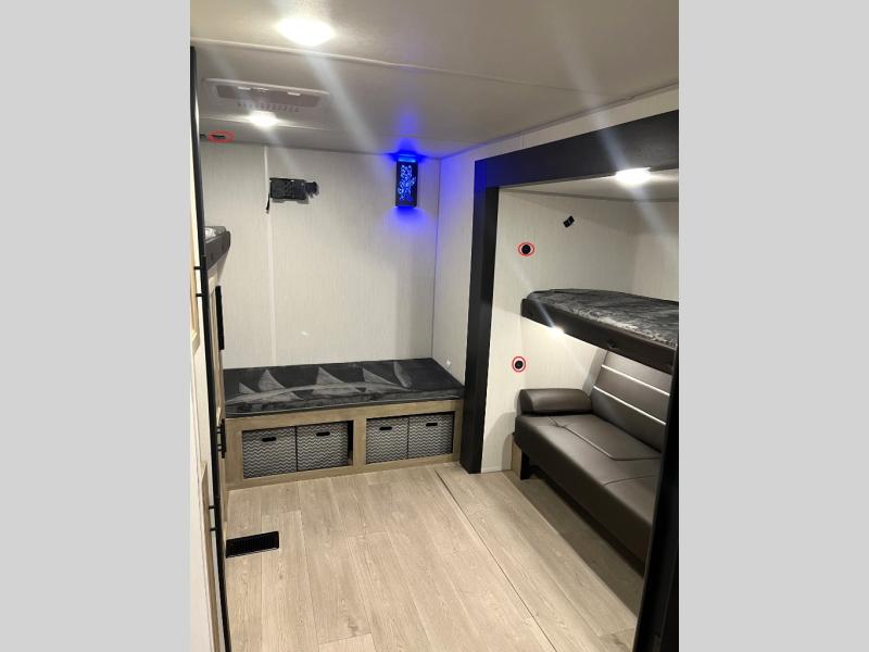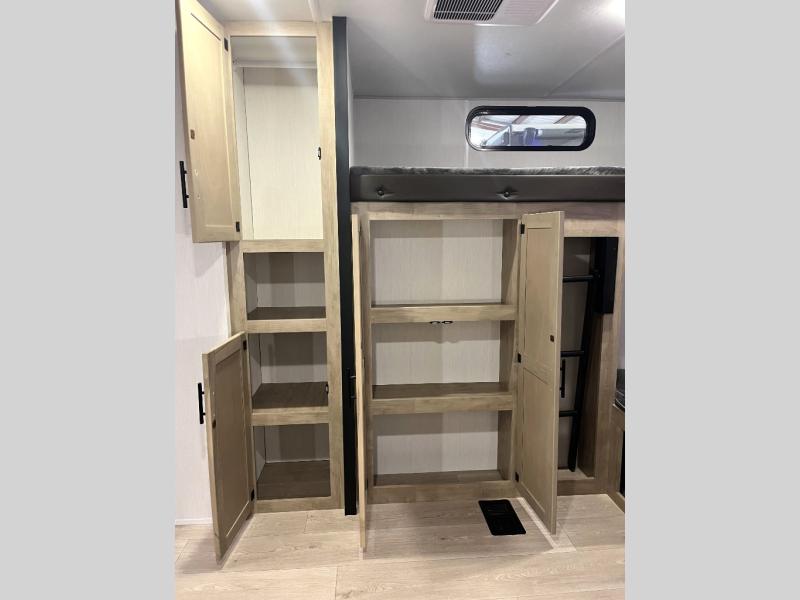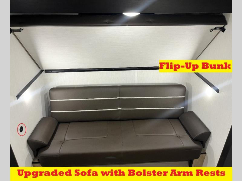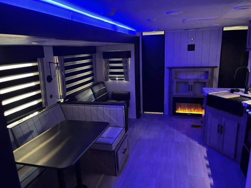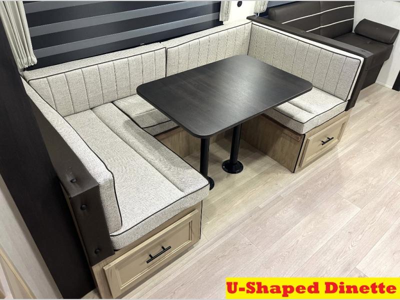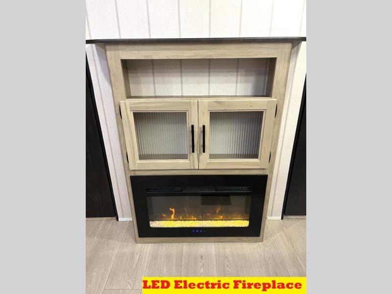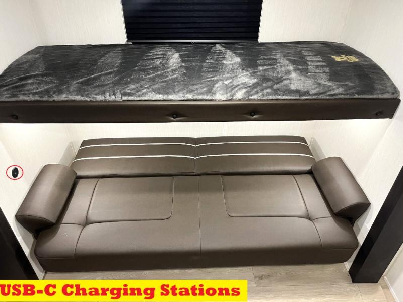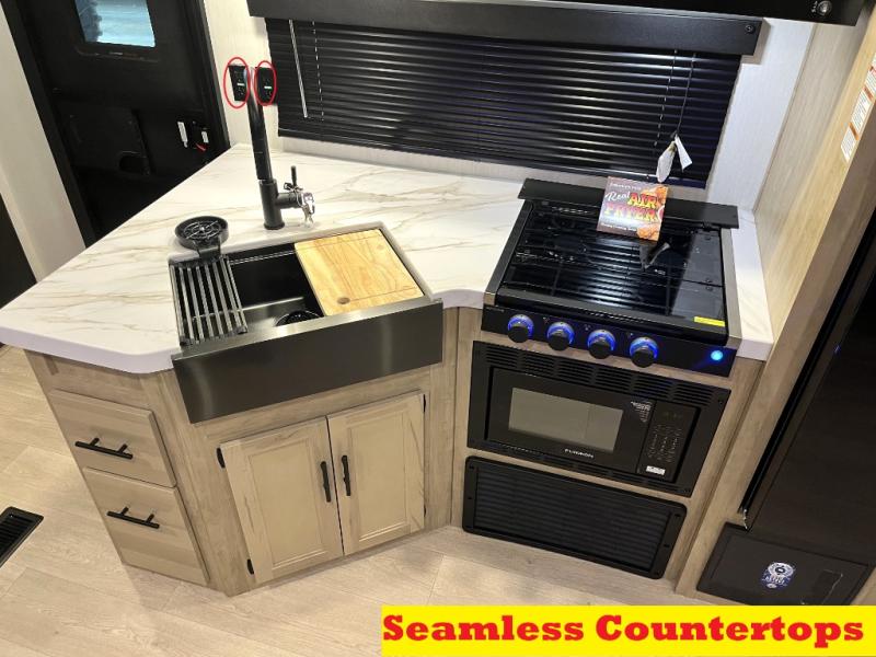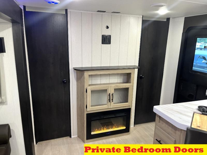 Double slides create spacious living areas in this travel trailer! The chef can prepare their best meals either indoors with the three burner cooktop and air fryer microwave, or at the outdoor kitchen. The kids or guests can sleep in the rear private bunkhouse with a bunk, double bunk, and flip-up bunk above a sofa. The front private bedroom has a walk around RV king bed for a great night's rest plus a wardrobe to keep your things organized. In the morning, everyone can meet in the combined kitchen and living room around the U-shaped dinette and sofa, and the fireplace here will make it feel more like home.