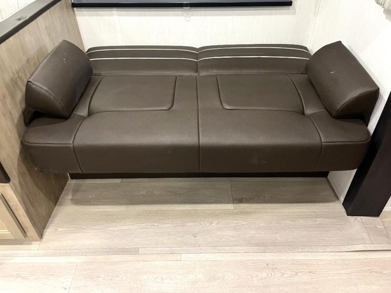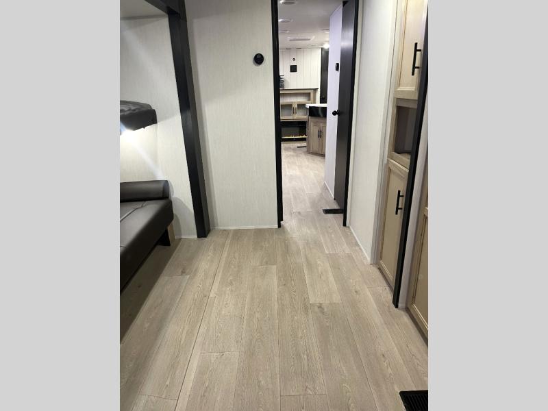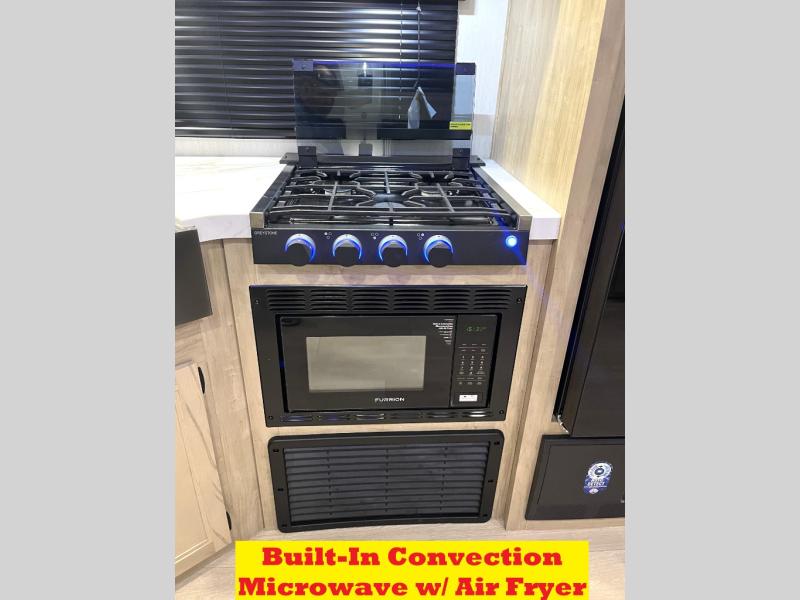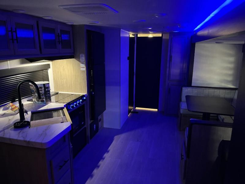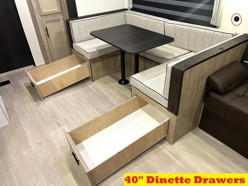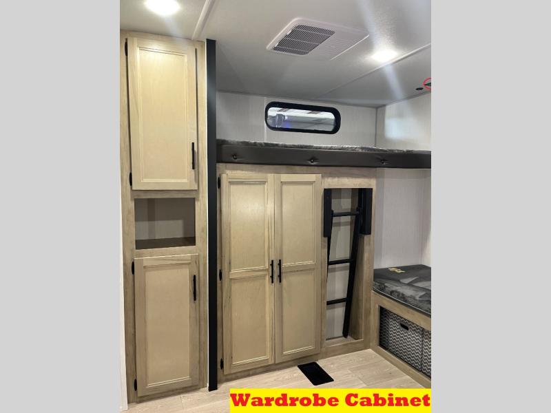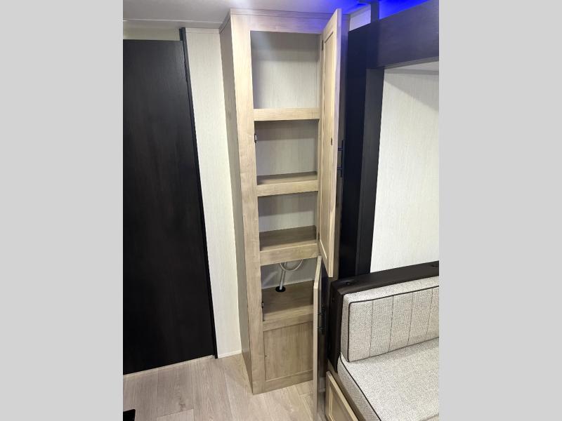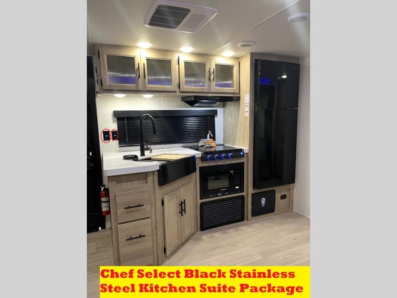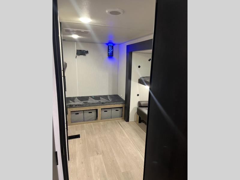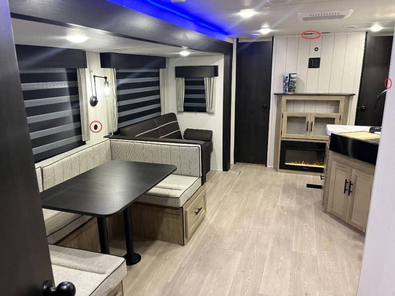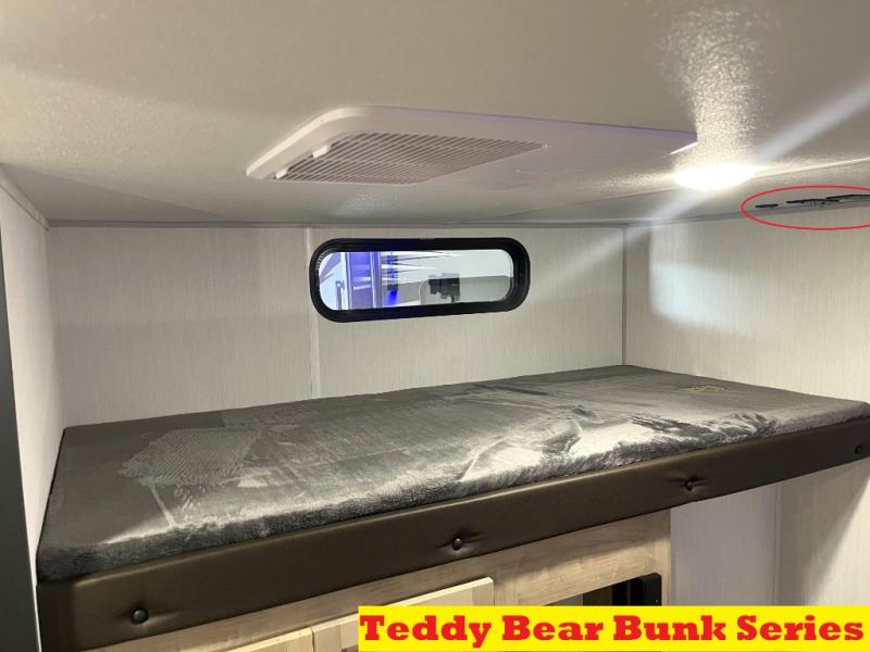 Double slides create spacious living areas in this travel trailer! The chef can prepare their best meals either indoors with the three burner cooktop and air fryer microwave, or at the outdoor kitchen. The kids or guests can sleep in the rear private bunkhouse with a bunk, double bunk, and flip-up bunk above a sofa. The front private bedroom has a walk around RV king bed for a great night's rest plus a wardrobe to keep your things organized. In the morning, everyone can meet in the combined kitchen and living room around the U-shaped dinette and sofa, and the fireplace here will make it feel more like home.