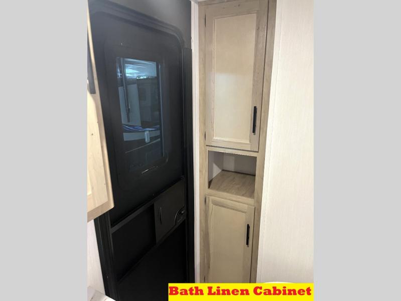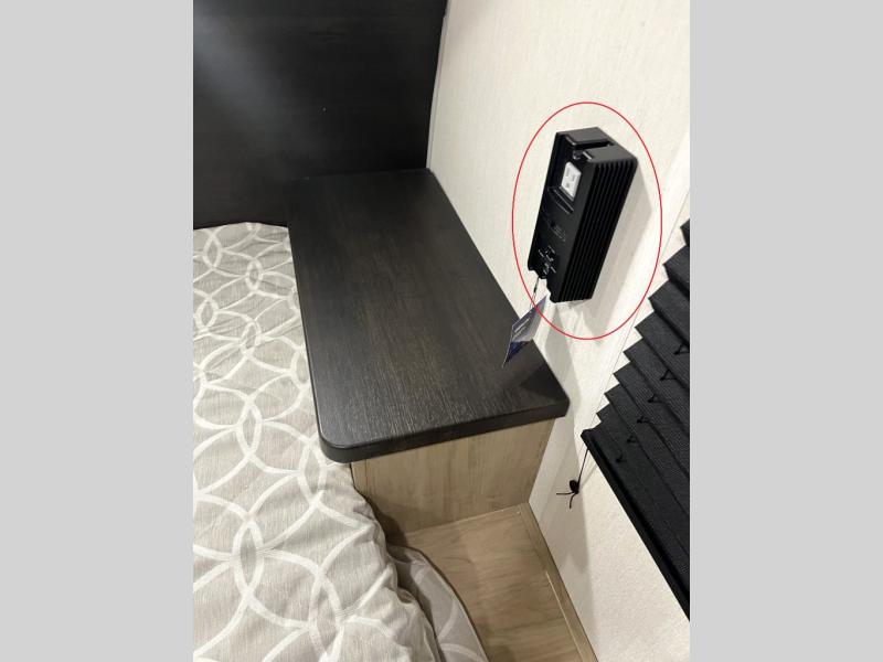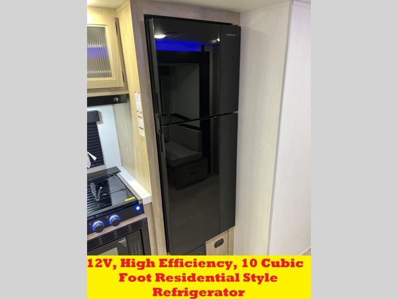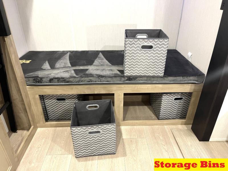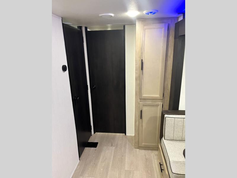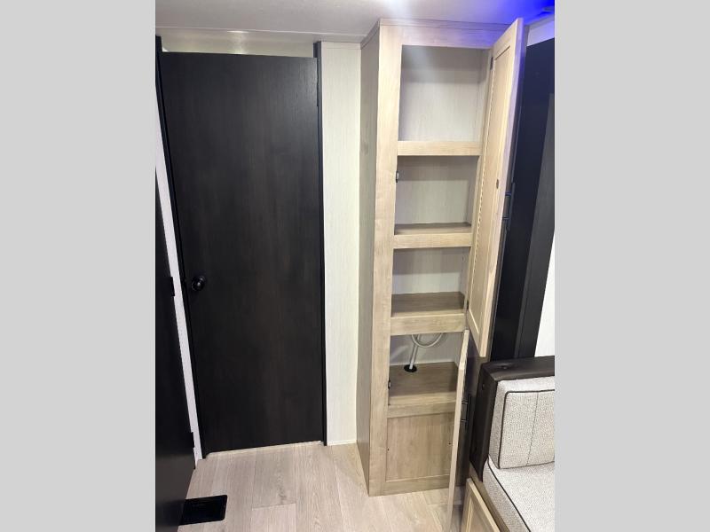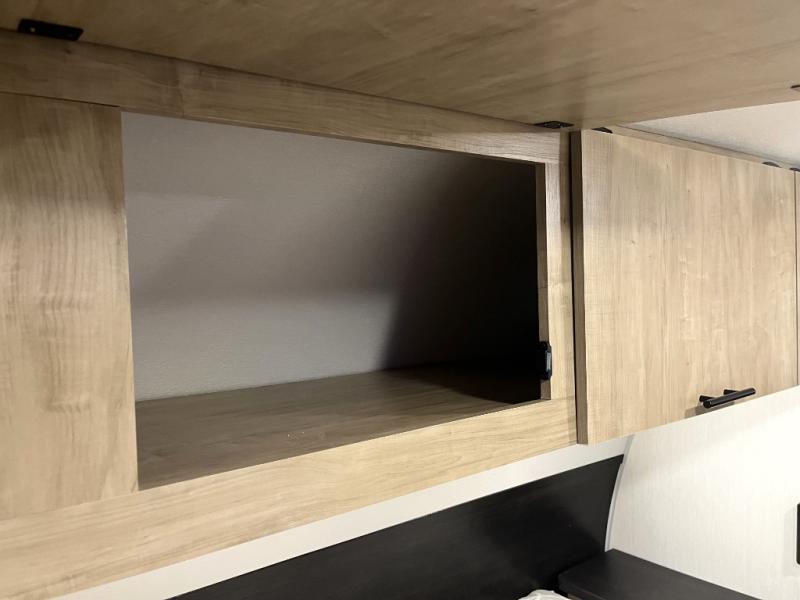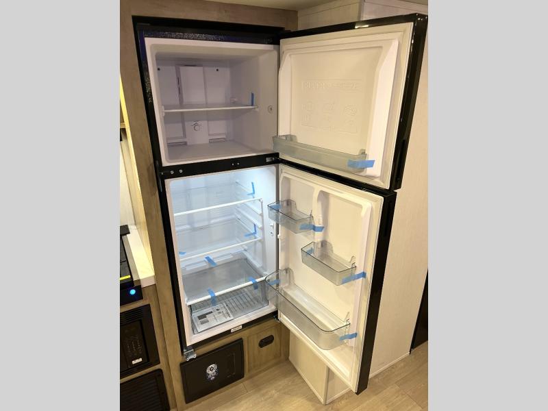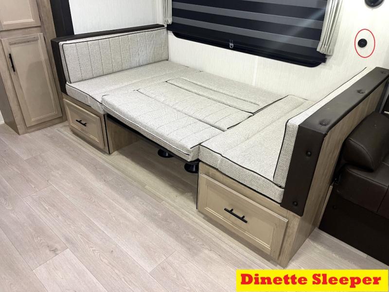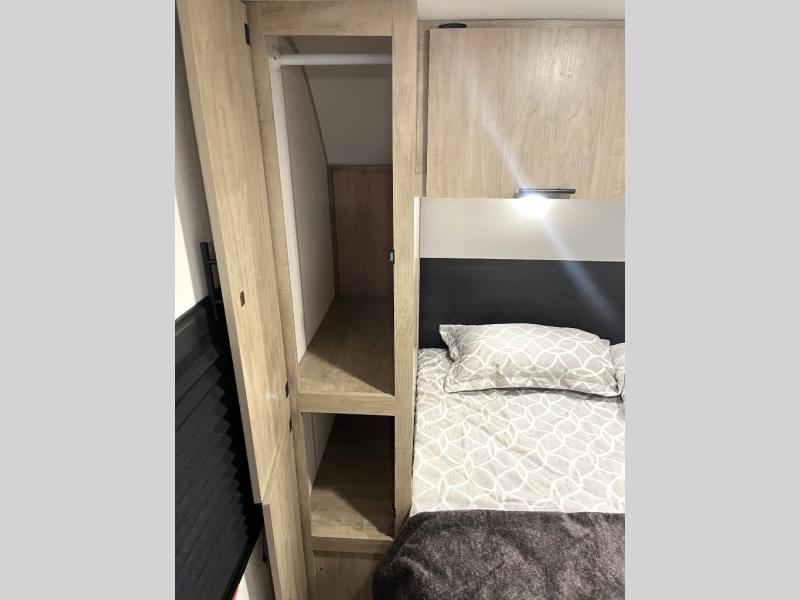 Double slides create spacious living areas in this travel trailer! The chef can prepare their best meals either indoors with the three burner cooktop and air fryer microwave, or at the outdoor kitchen. The kids or guests can sleep in the rear private bunkhouse with a bunk, double bunk, and flip-up bunk above a sofa. The front private bedroom has a walk around RV king bed for a great night's rest plus a wardrobe to keep your things organized. In the morning, everyone can meet in the combined kitchen and living room around the U-shaped dinette and sofa, and the fireplace here will make it feel more like home.