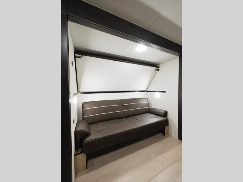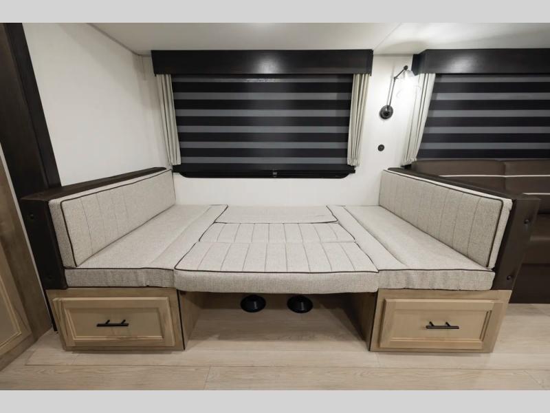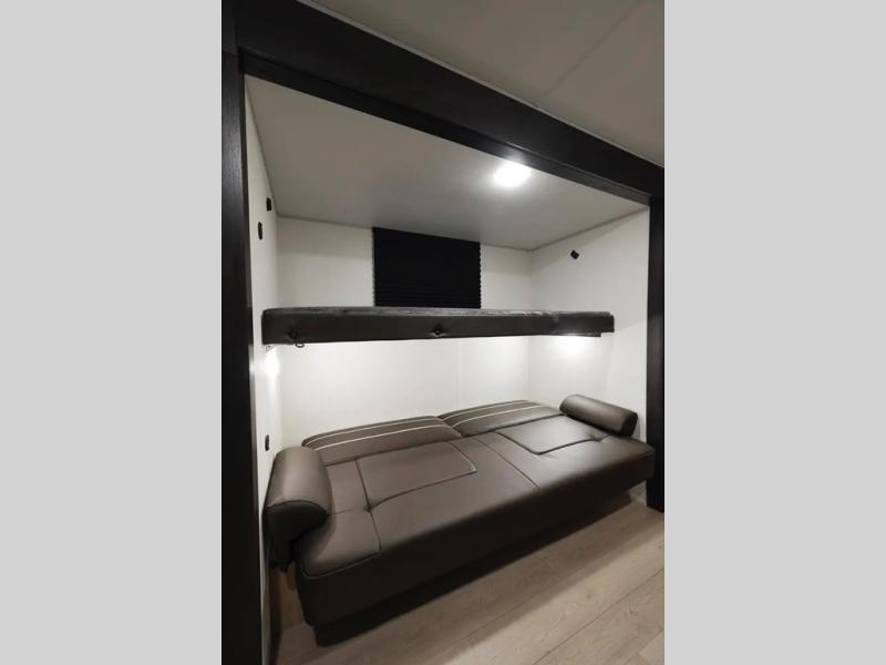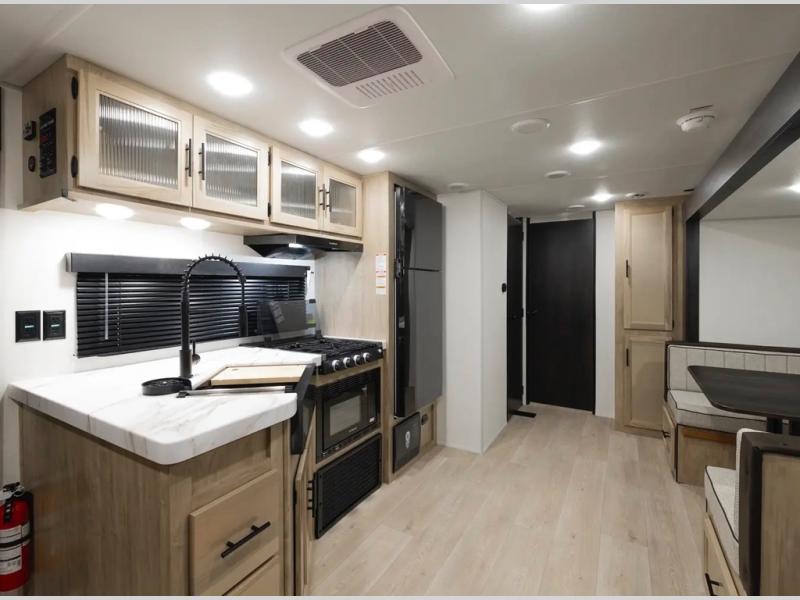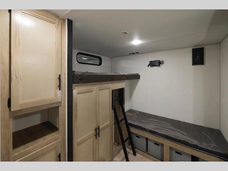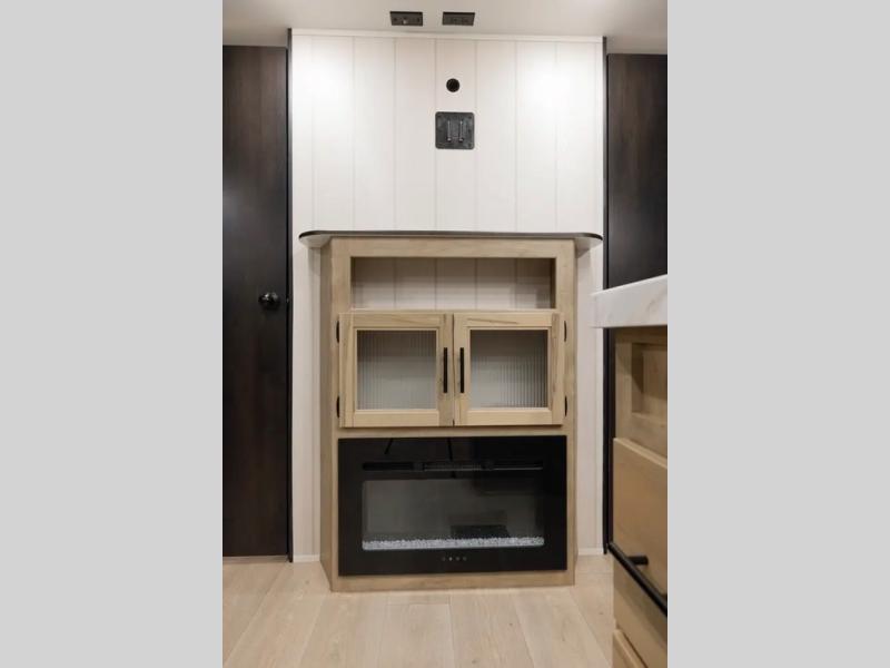 Double slides create spacious living areas in this travel trailer! The chef can prepare their best meals either indoors with the three burner cooktop and air fryer microwave, or at the outdoor kitchen. The kids or guests can sleep in the rear private bunkhouse with a bunk, double bunk, and flip-up bunk above a sofa. The front private bedroom has a walk around RV king bed for a great night's rest plus a wardrobe to keep your things organized. In the morning, everyone can meet in the combined kitchen and living room around the U-shaped dinette and sofa, and the fireplace here will make it feel more like home.