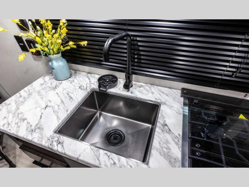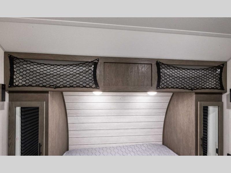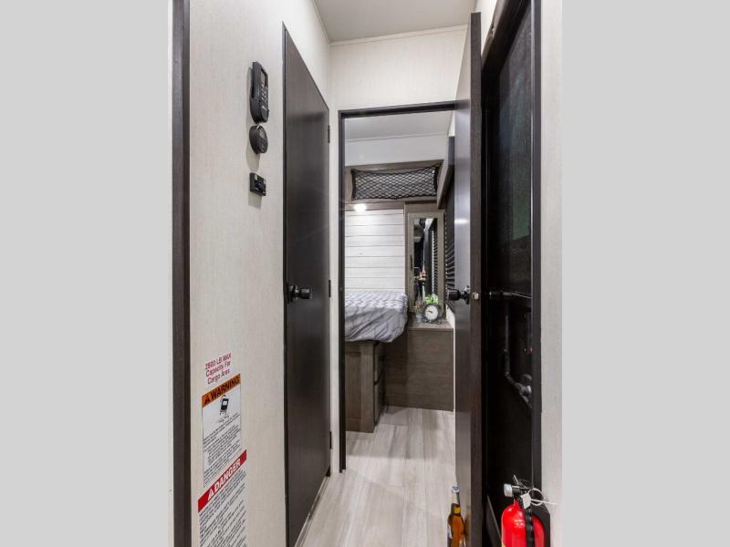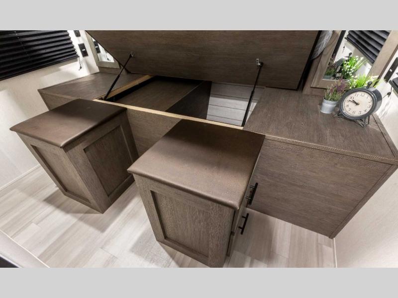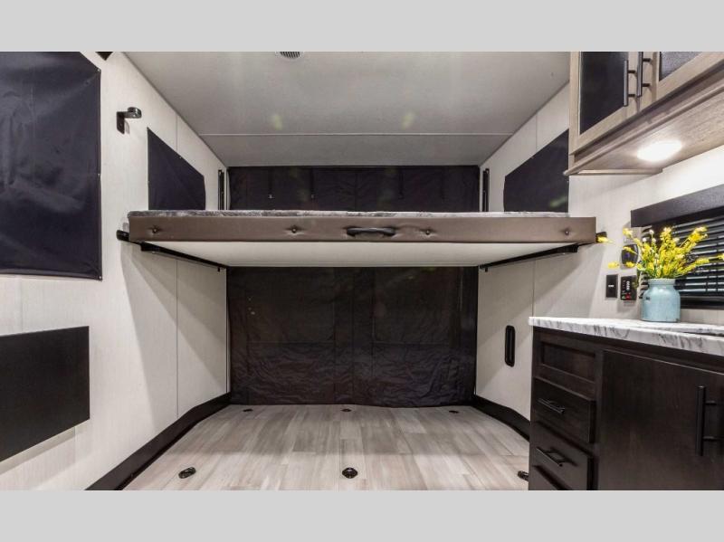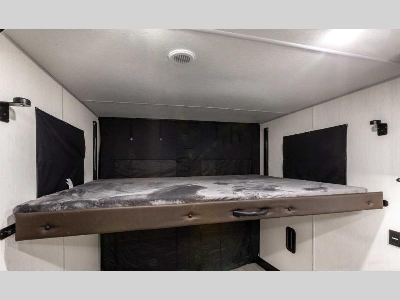 You can't go wrong when you have this toy hauler in tow! There is 14' 6" of cargo space for your toys, and an optional ramp door patio deck railing can be added if you want to turn the door into a patio. The three burner cooktop will allow you to make meals each day, and the flip-up counter with stools provides a place to dine at. You could also take your plate outdoors to eat under the 18' power awning with LED accent lighting. You'll sleep great each night on the RV king bed in the front bedroom, while your guests take the quick set bed system in the garage!