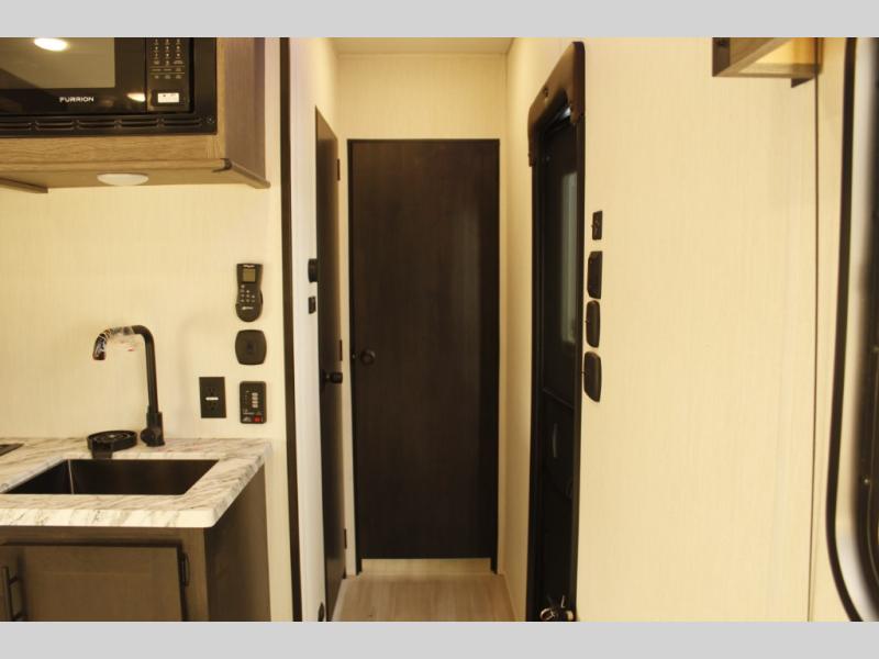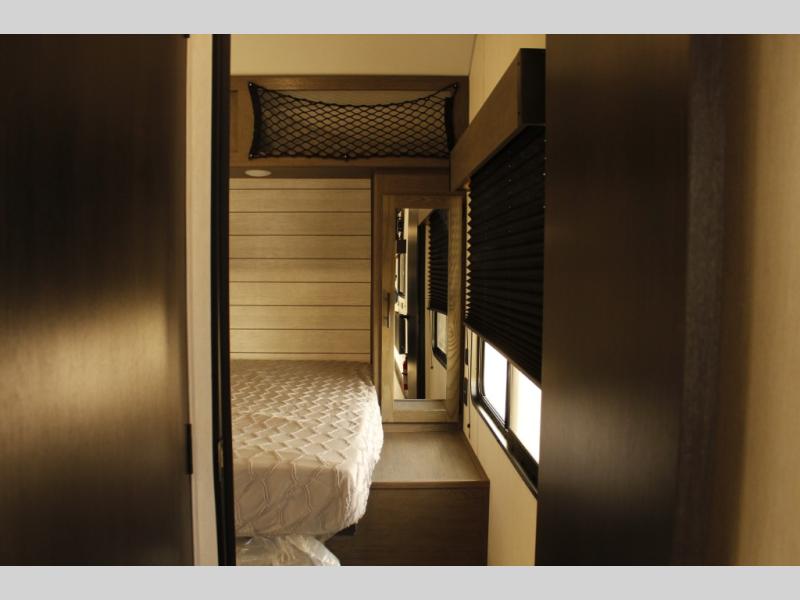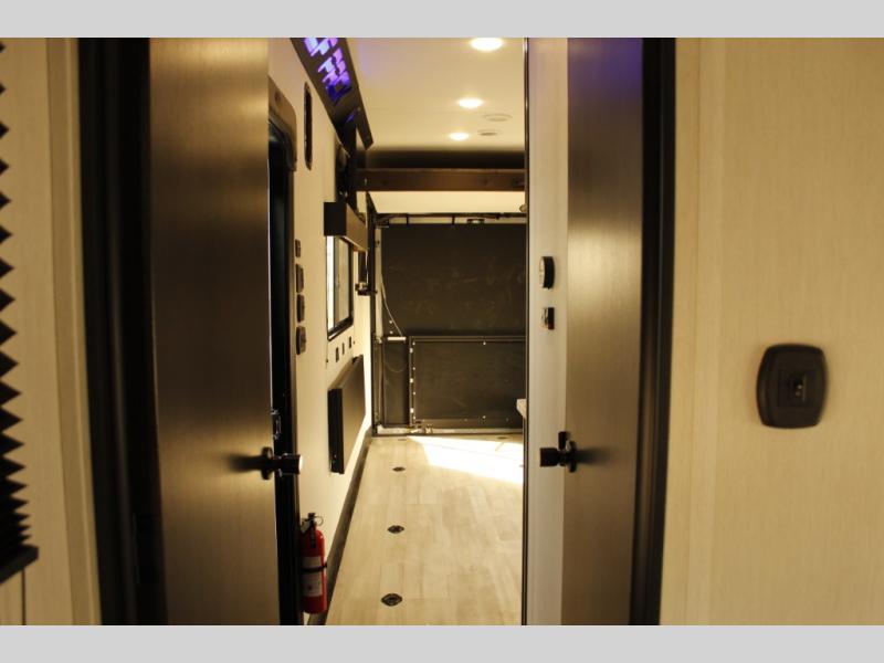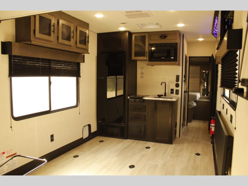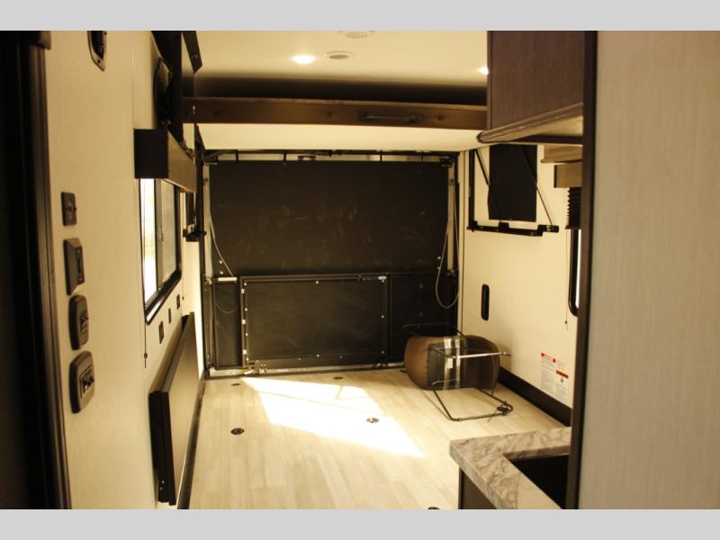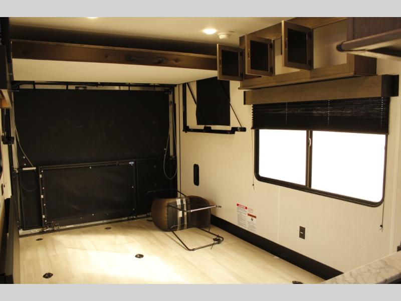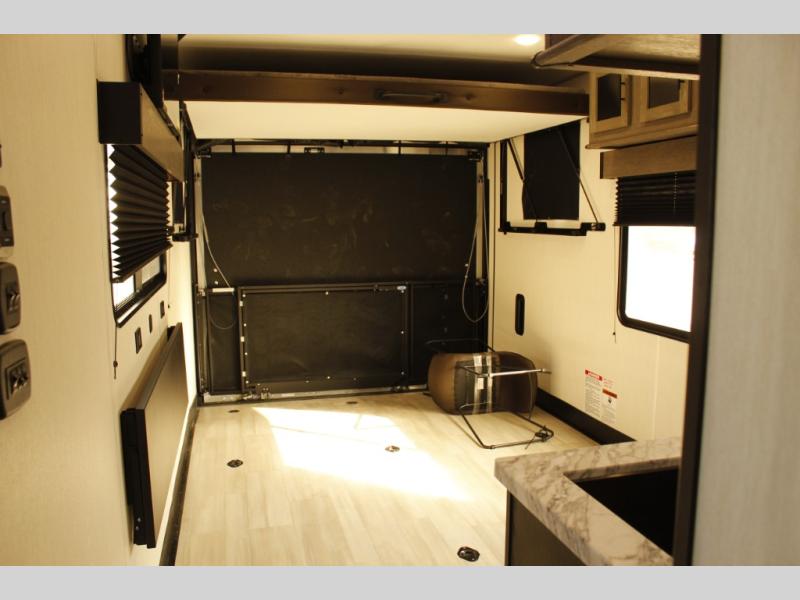 You'll love every minute spent in this spacious toy hauler! Since there is 14' of total garage space, you can plan to bring along kayaks, bikes, and hiking gear galore. This model includes a flip-up counter with stools and full kitchen amenities so you can whip up your best meals each day. The full bath will let you freshen up at night, and the RV king bed in the front bedroom is sure to bring comfort, while your guests take the quick set bed system in the garage!