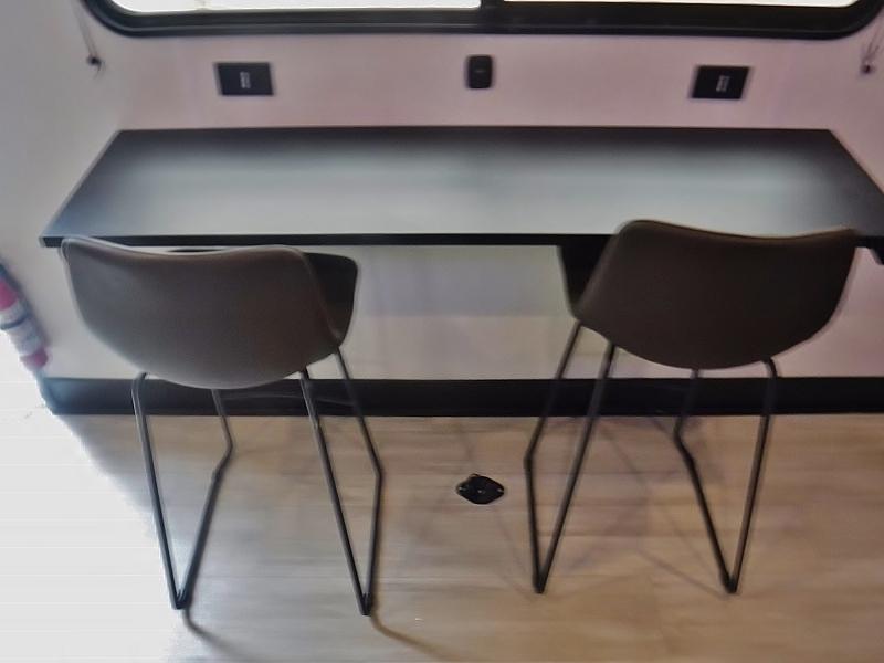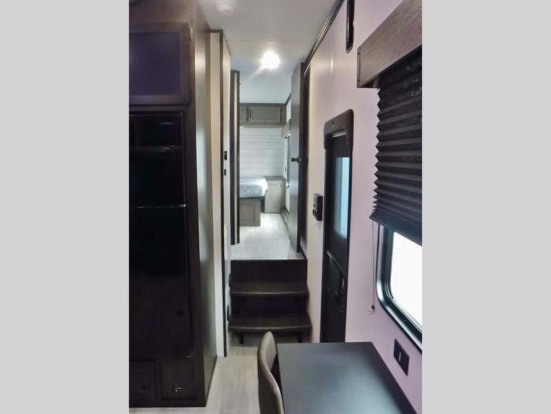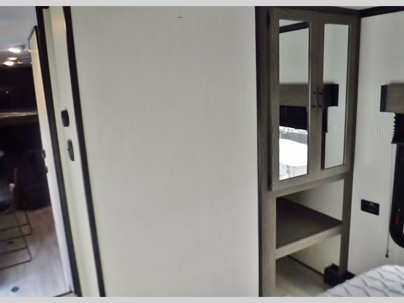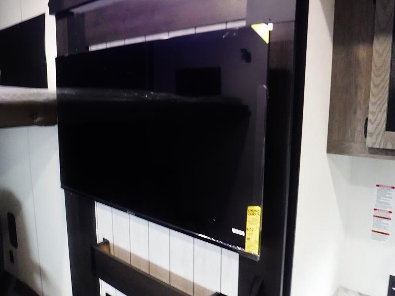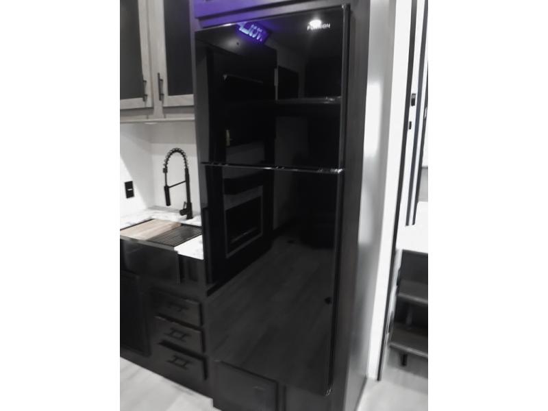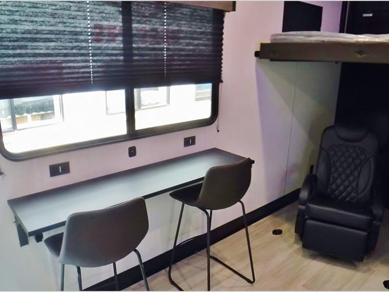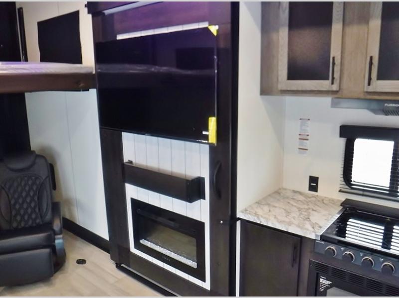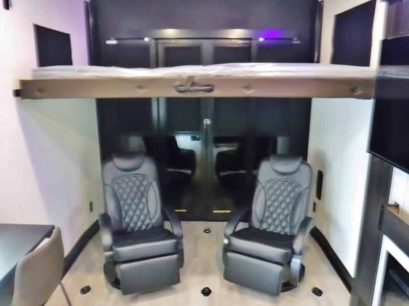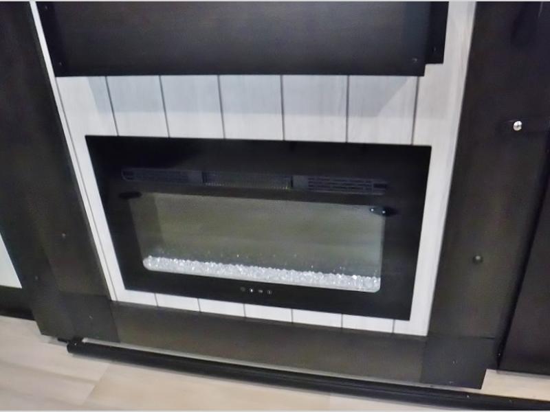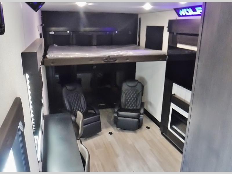 This toy hauler has everything you and your partner need to have a fantastic experience on the road! Unwind in the front bedroom, fitted with a large RV king bed, overhead cabinets, and nightstands on each side of the bed, perfect for keeping all your clothes organized. There is also a wardrobe with washer and dryer prep if you choose to add these appliances. In the kitchen area, you will find a 12V refrigerator, overhead cabinets, an XL pantry, a microwave, and a swinging entertainment center with a fireplace. There is also a flip-up table with stools where you can dine together. And your guests can sleep on the quick set bed system in the garage!