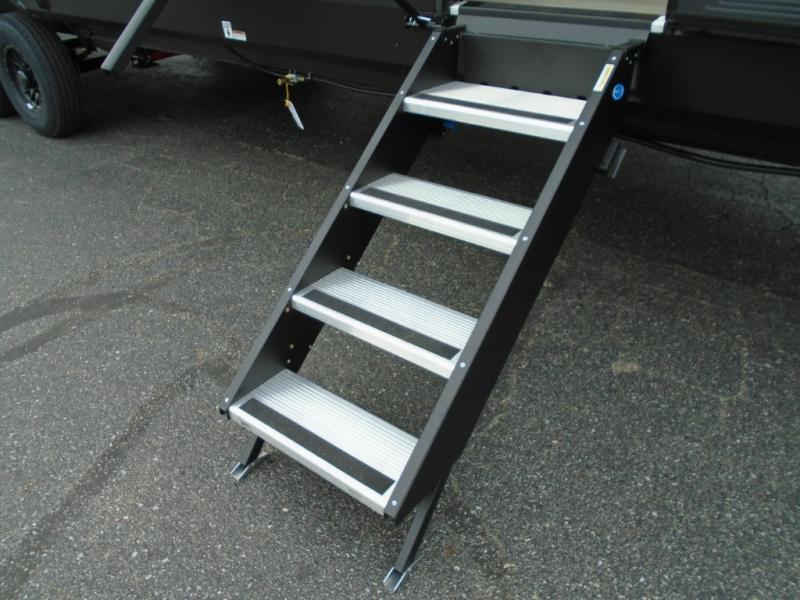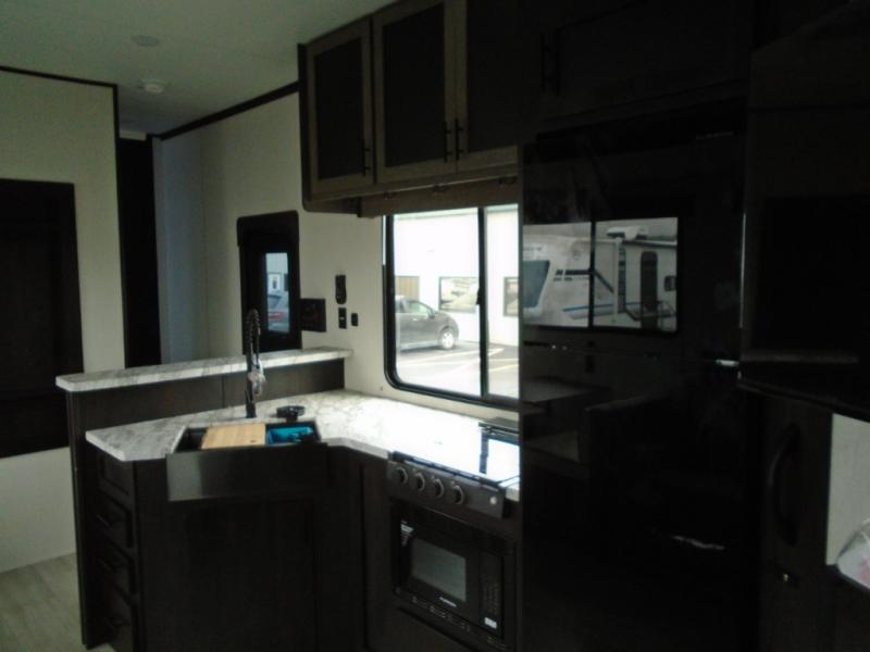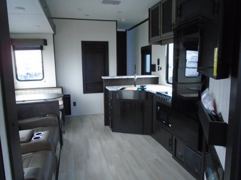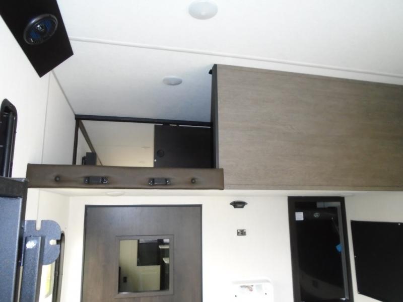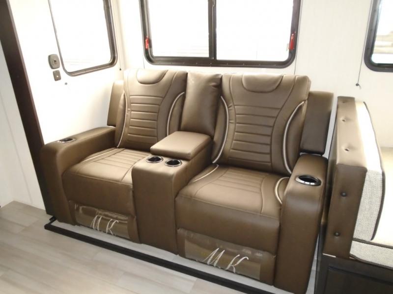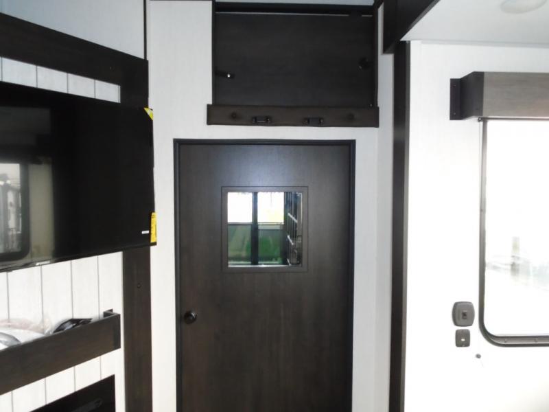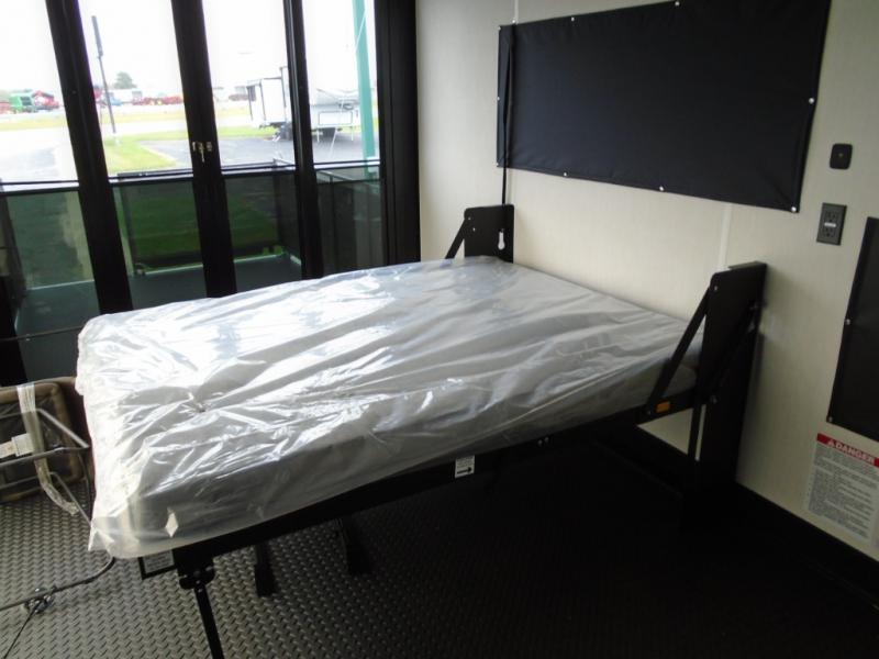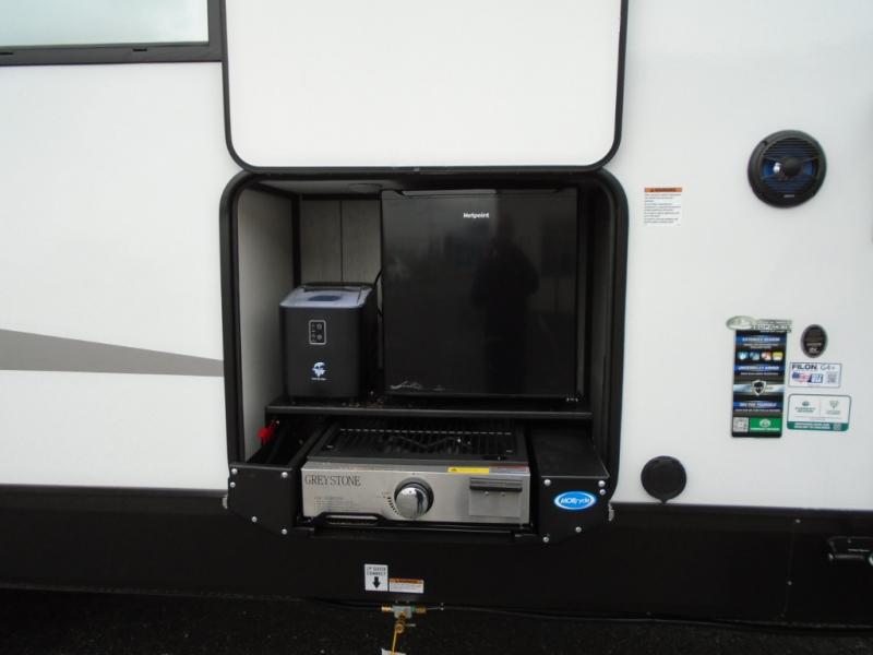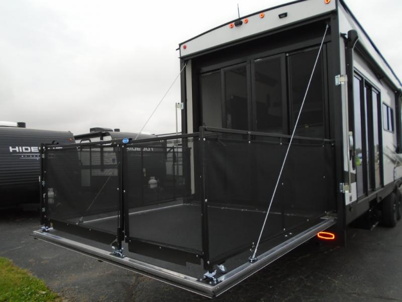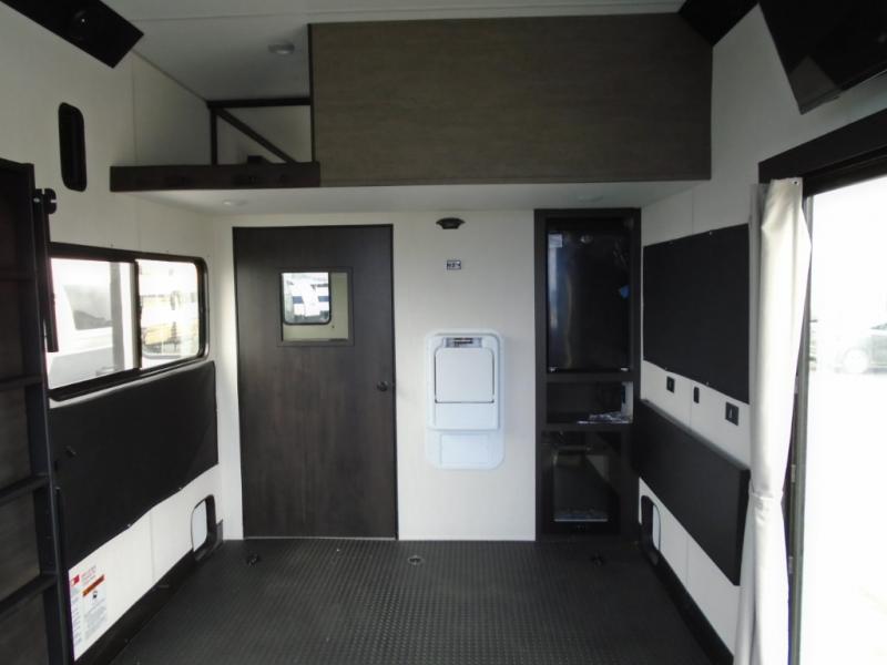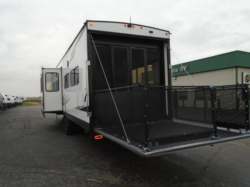 Fun at the campground begins with this dual entry toy hauler in tow! There is a 15' separate garage, a loft above for guests, plus a patio deck to entertain guests. There is also an optional Murphy bed system in the garage if you need additional sleeping space! Your crew can get comfy on the theater seating or booth dinette, and there is an entertainment center with a fireplace and a hidden XL pantry for snacks. The chef of your group will love the full interior kitchen, along with an outdoor mini kitchen when the weather is nice. A full bath lets you freshen up after a trail ride, and the front private bedroom gives you your own space at night. This unit also features washer and dryer prep in the bedroom so you can add those appliances if you wish!