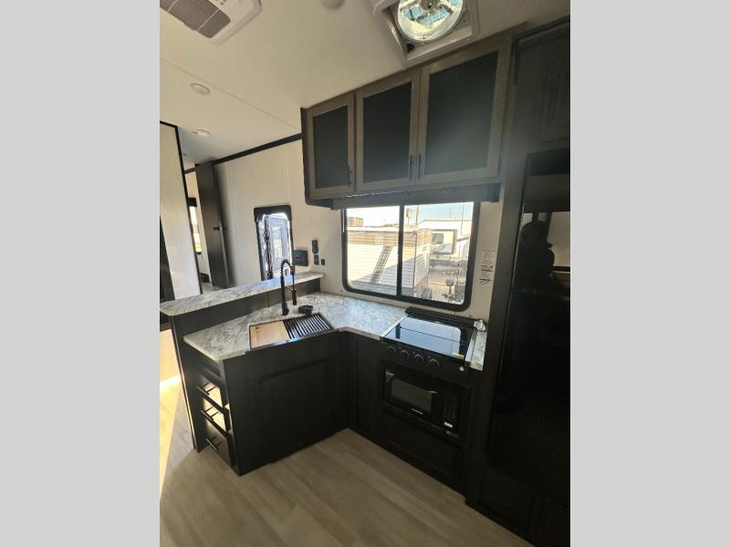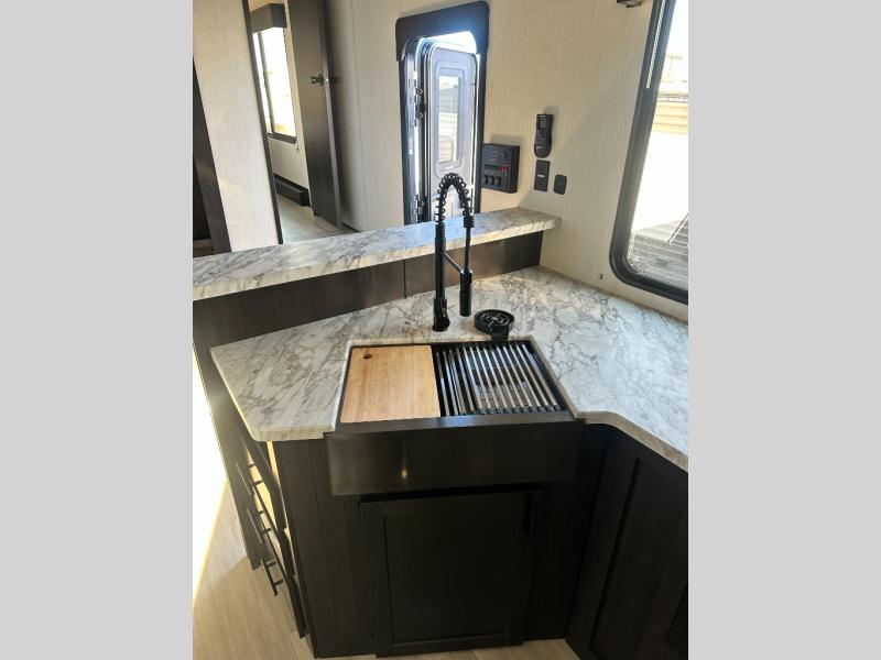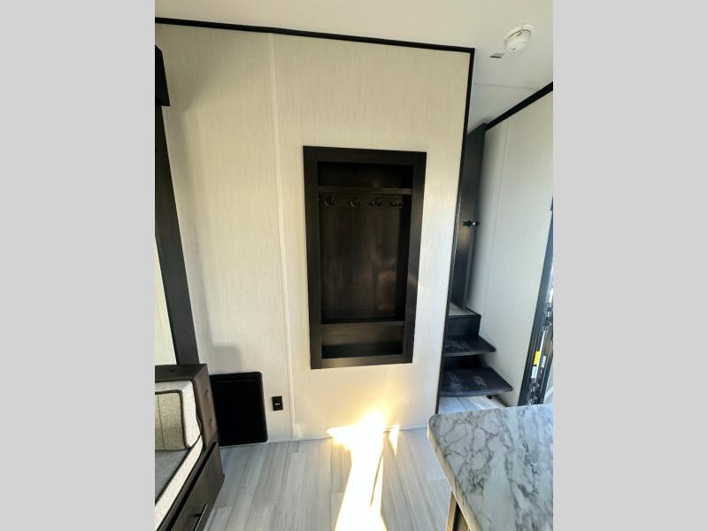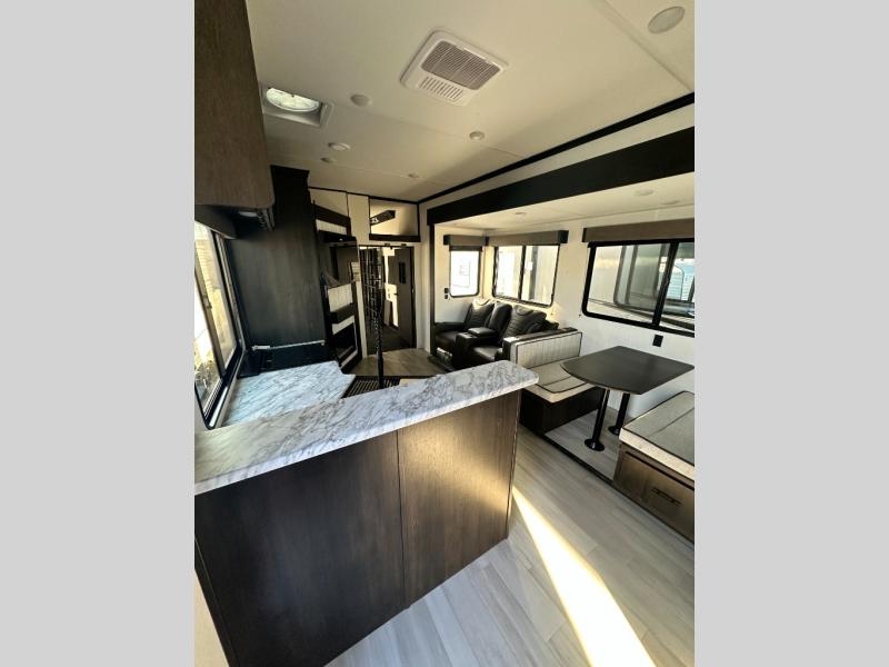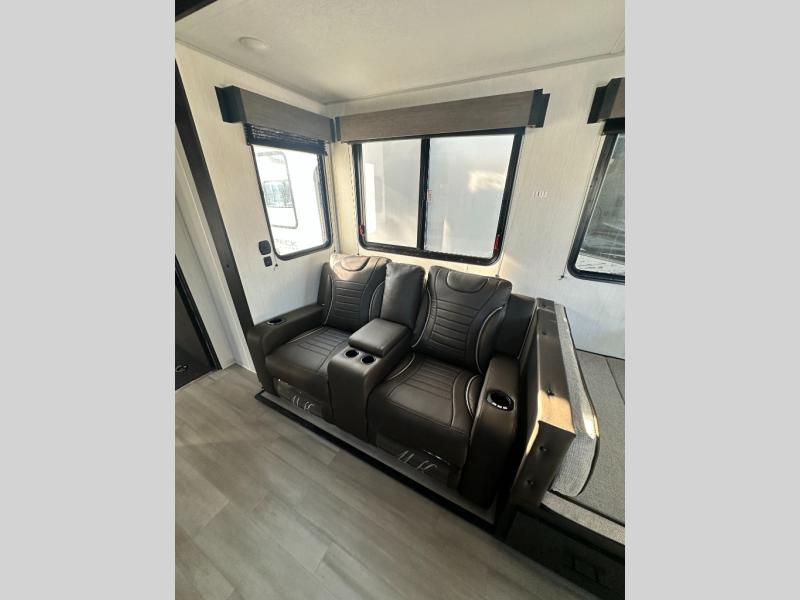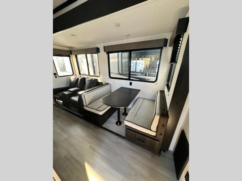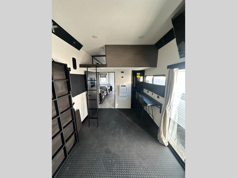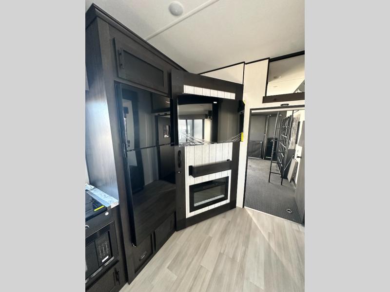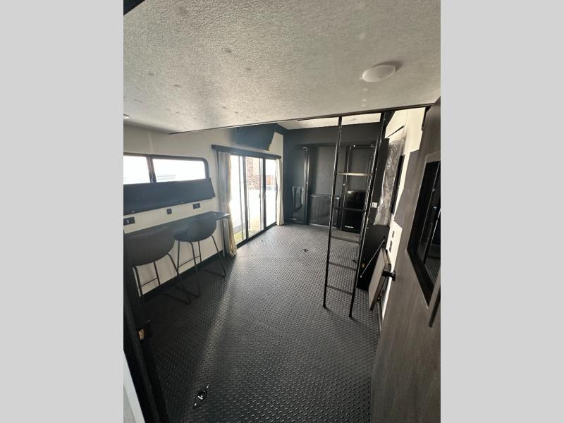 Fun at the campground begins with this dual entry toy hauler in tow! There is a 15' separate garage, a loft above for guests, plus a patio deck to entertain guests. There is also an optional Murphy bed system in the garage if you need additional sleeping space! Your crew can get comfy on the theater seating or booth dinette, and there is an entertainment center with a fireplace and a hidden XL pantry for snacks. The chef of your group will love the full interior kitchen, along with an outdoor mini kitchen when the weather is nice. A full bath lets you freshen up after a trail ride, and the front private bedroom gives you your own space at night. This unit also features washer and dryer prep in the bedroom so you can add those appliances if you wish!