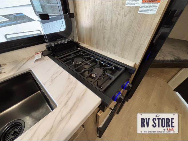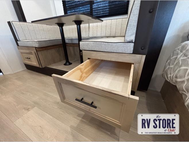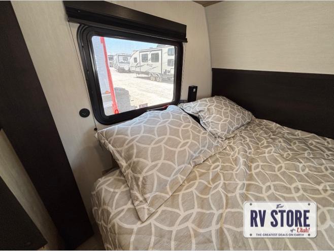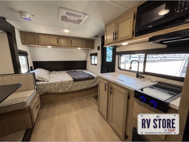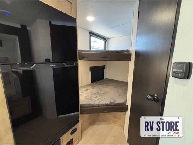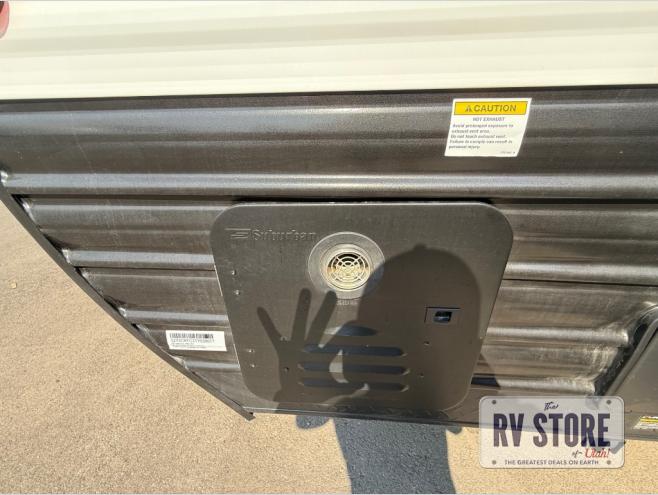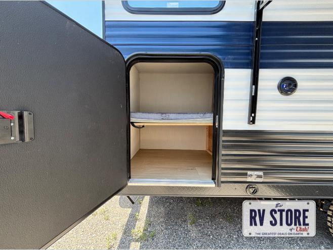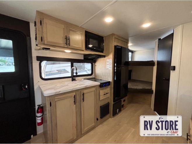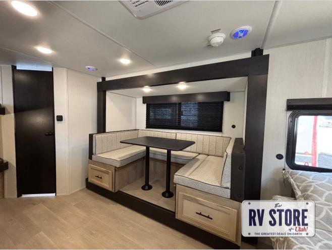 This family travel trailer is ready to head to the campground whenever you are! The kiddos can sleep on the set of double-size bed bunks and you can sleep on the front queen bed, plus the U-shaped dinette slide can also transform into an extra sleeping space when you aren't using it to enjoy a meal prepared with the high output cooktop. You can also prepare your delicious meals at the outside mini kitchen and stay protected by the power awning. The exterior not only has outside storage and an outside TV mount, but also features an outside storage plus door for access to the storage space underneath the bottom bunk bed. The rear corner bath allows everyone to stay clean and refreshed while you camp.
