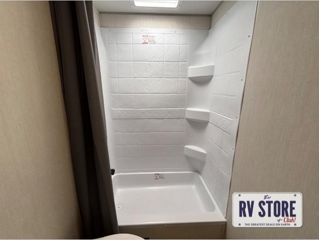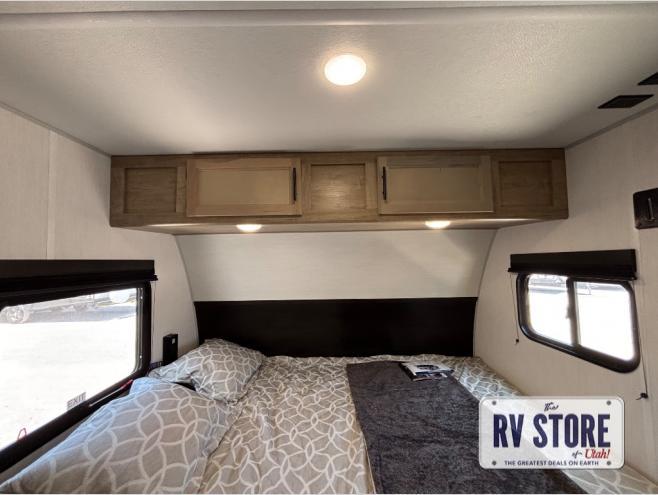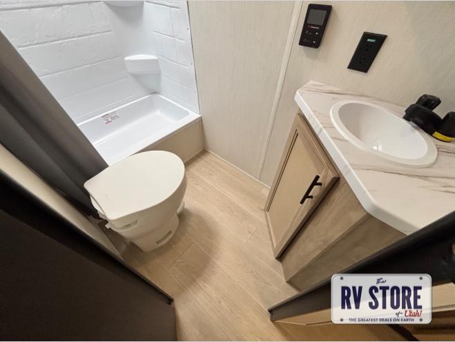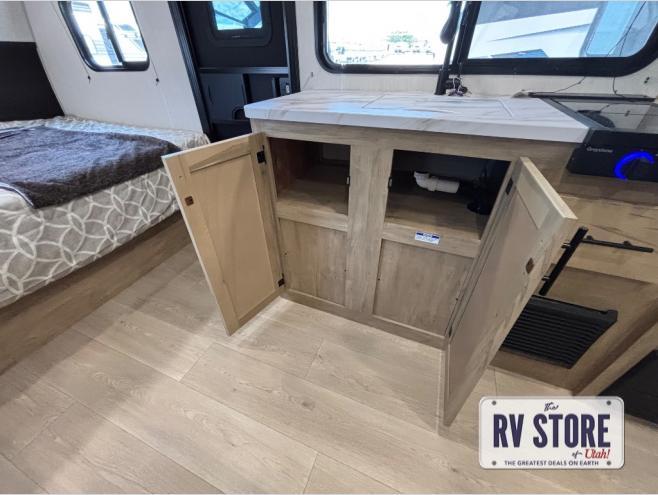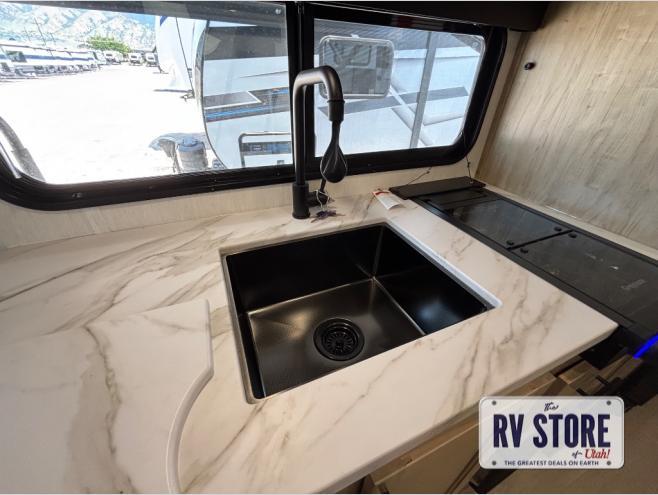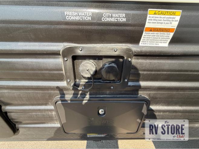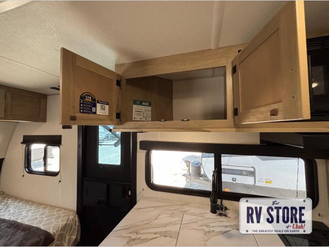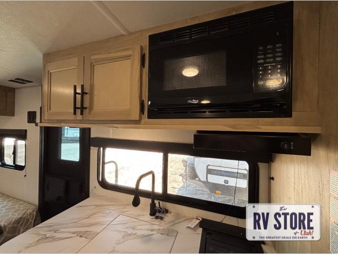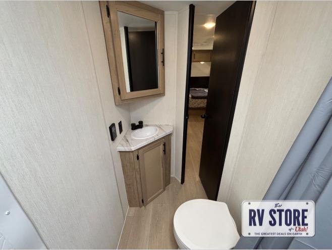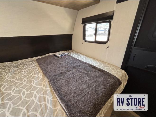 This family travel trailer is ready to head to the campground whenever you are! The kiddos can sleep on the set of double-size bed bunks and you can sleep on the front queen bed, plus the U-shaped dinette slide can also transform into an extra sleeping space when you aren't using it to enjoy a meal prepared with the high output cooktop. You can also prepare your delicious meals at the outside mini kitchen and stay protected by the power awning. The exterior not only has outside storage and an outside TV mount, but also features an outside storage plus door for access to the storage space underneath the bottom bunk bed. The rear corner bath allows everyone to stay clean and refreshed while you camp.