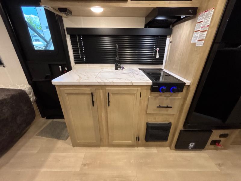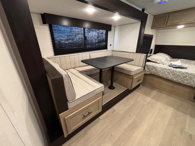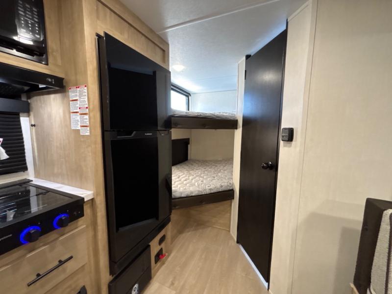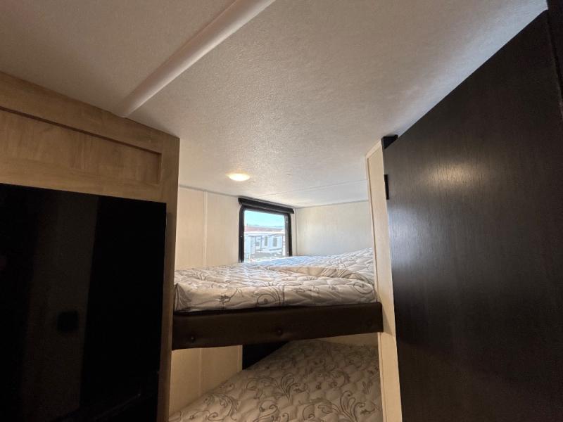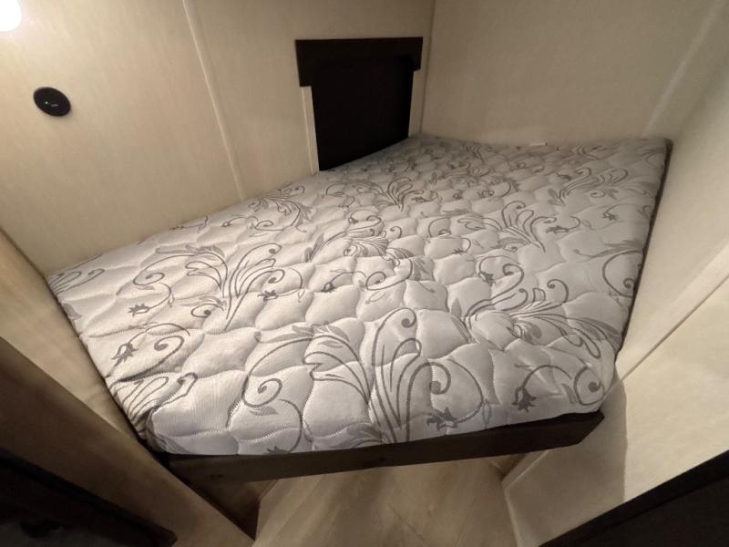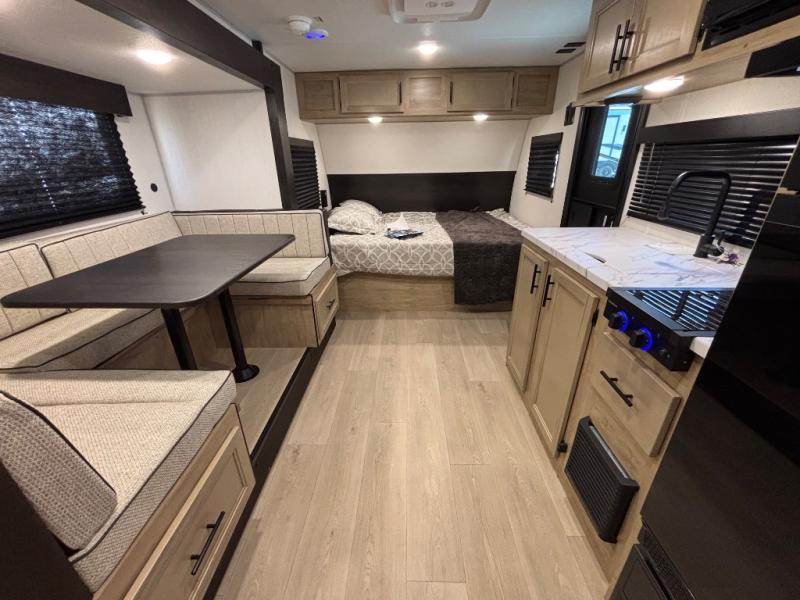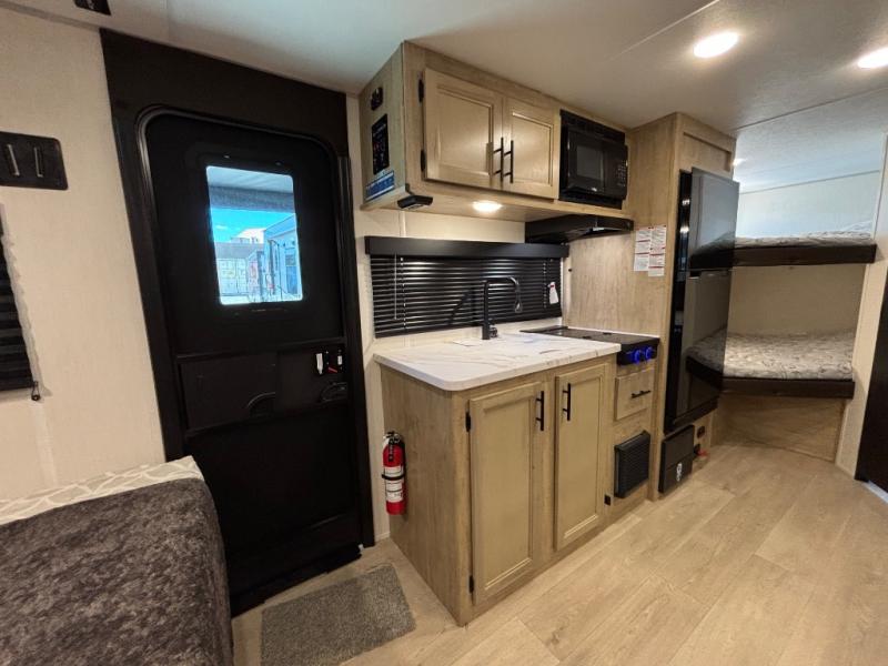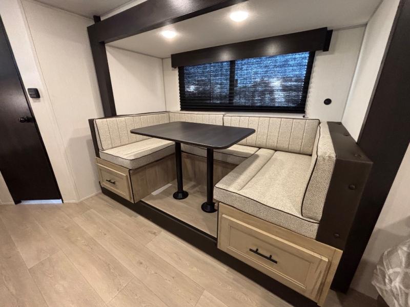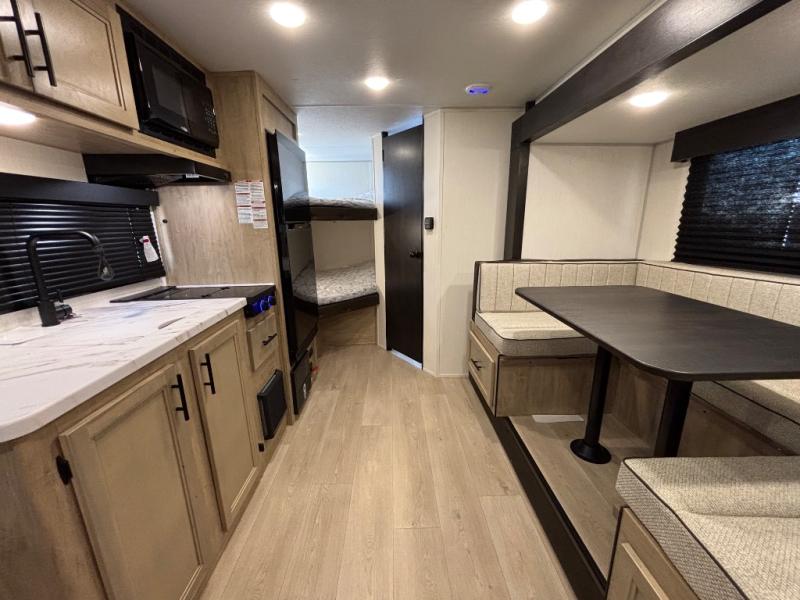 This family travel trailer is ready to head to the campground whenever you are! The kiddos can sleep on the set of double-size bed bunks and you can sleep on the front queen bed, plus the U-shaped dinette slide can also transform into an extra sleeping space when you aren't using it to enjoy a meal prepared with the high output cooktop. You can also prepare your delicious meals at the outside mini kitchen and stay protected by the power awning. The exterior not only has outside storage and an outside TV mount, but also features an outside storage plus door for access to the storage space underneath the bottom bunk bed. The rear corner bath allows everyone to stay clean and refreshed while you camp.