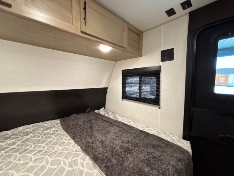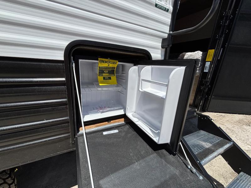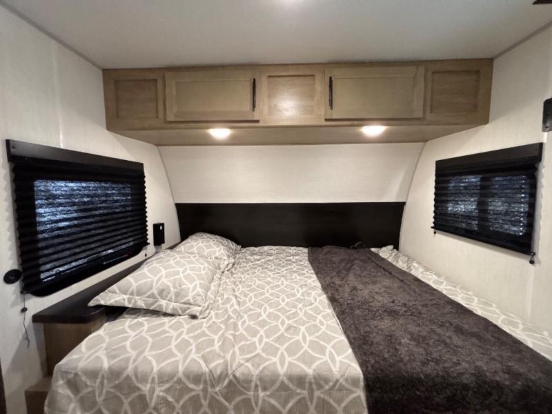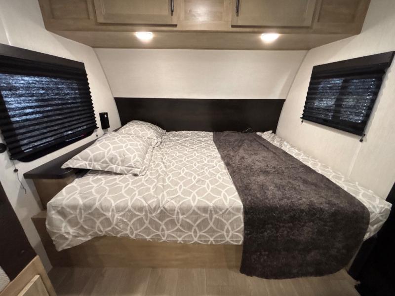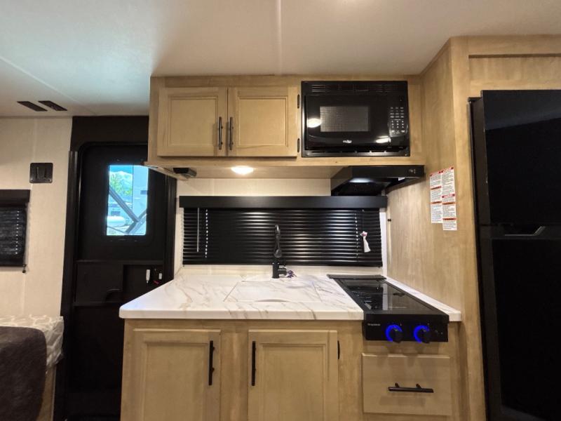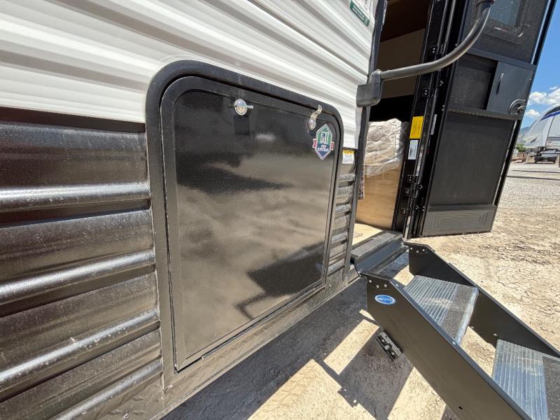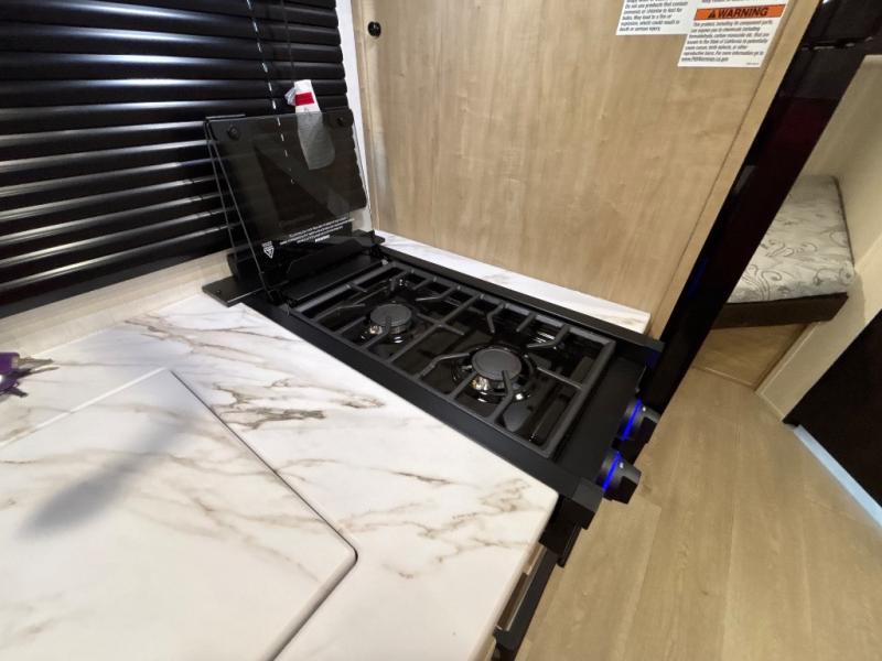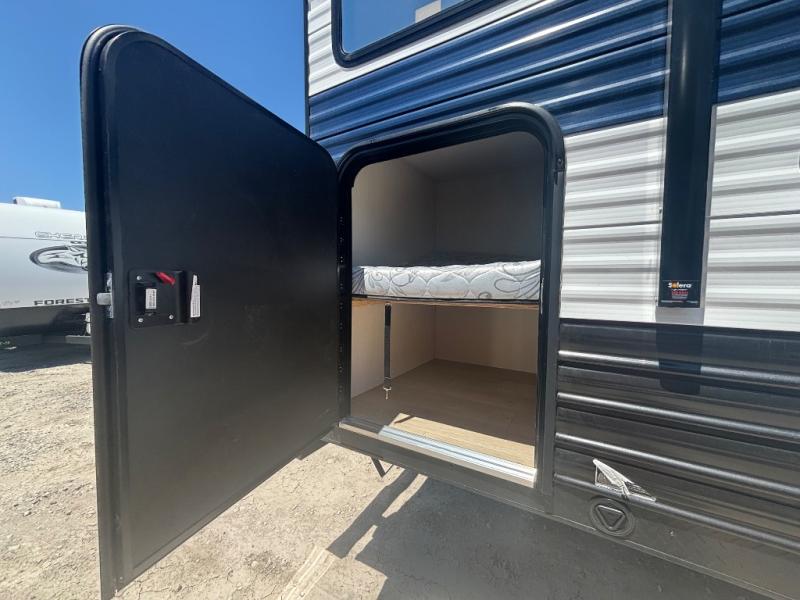 This family travel trailer is ready to head to the campground whenever you are! The kiddos can sleep on the set of double-size bed bunks and you can sleep on the front queen bed, plus the U-shaped dinette slide can also transform into an extra sleeping space when you aren't using it to enjoy a meal prepared with the high output cooktop. You can also prepare your delicious meals at the outside mini kitchen and stay protected by the power awning. The exterior not only has outside storage and an outside TV mount, but also features an outside storage plus door for access to the storage space underneath the bottom bunk bed. The rear corner bath allows everyone to stay clean and refreshed while you camp.