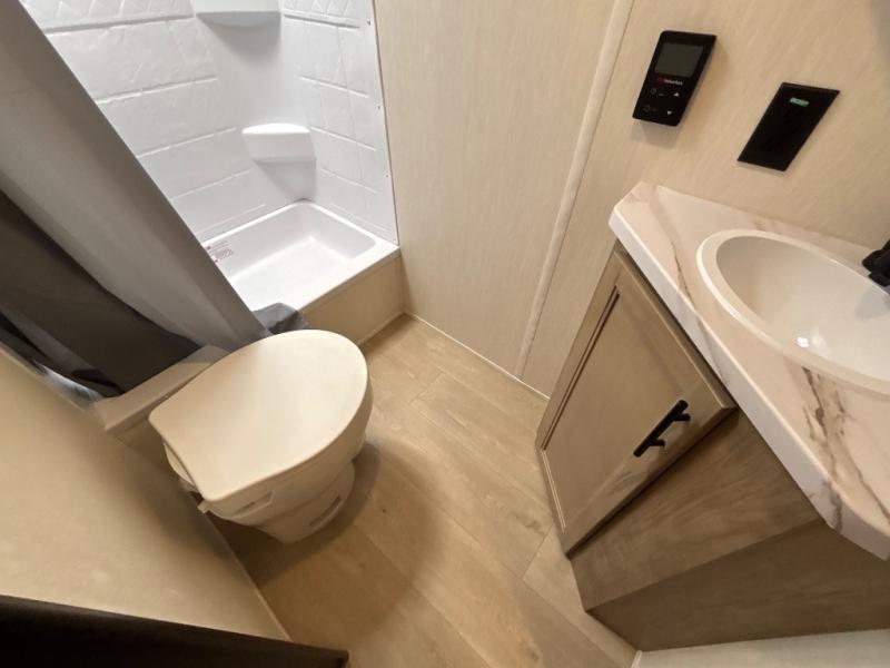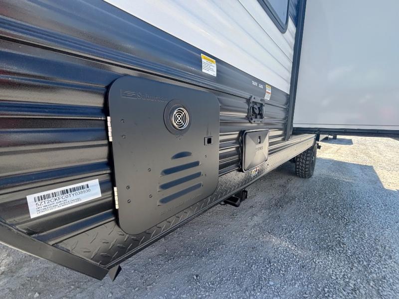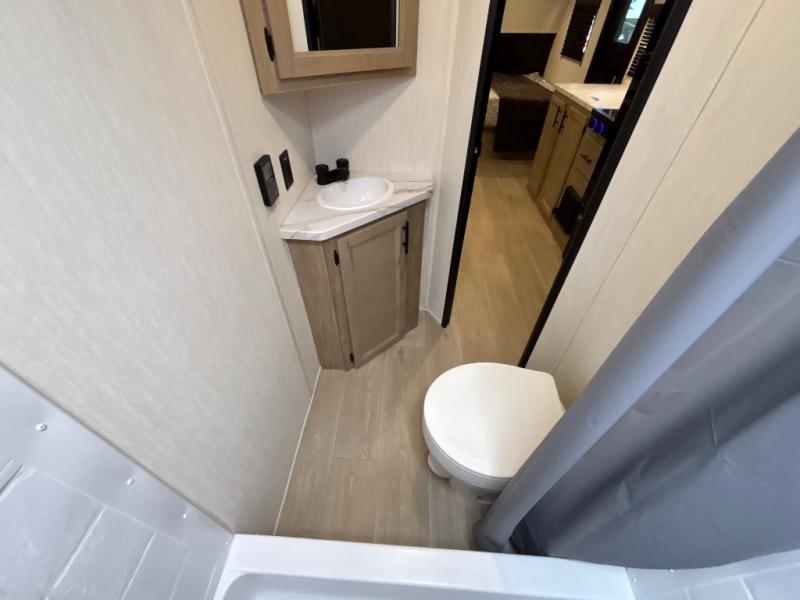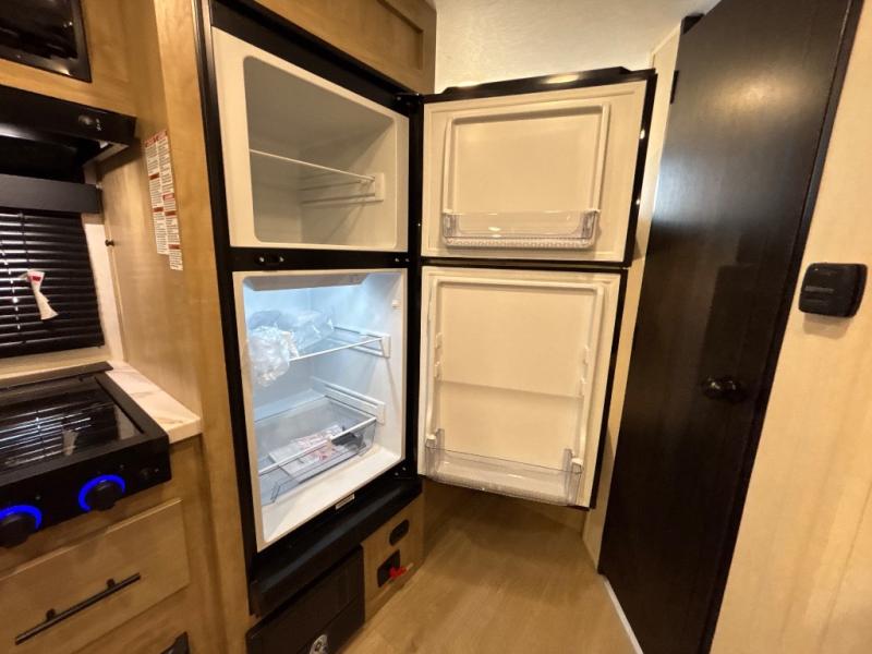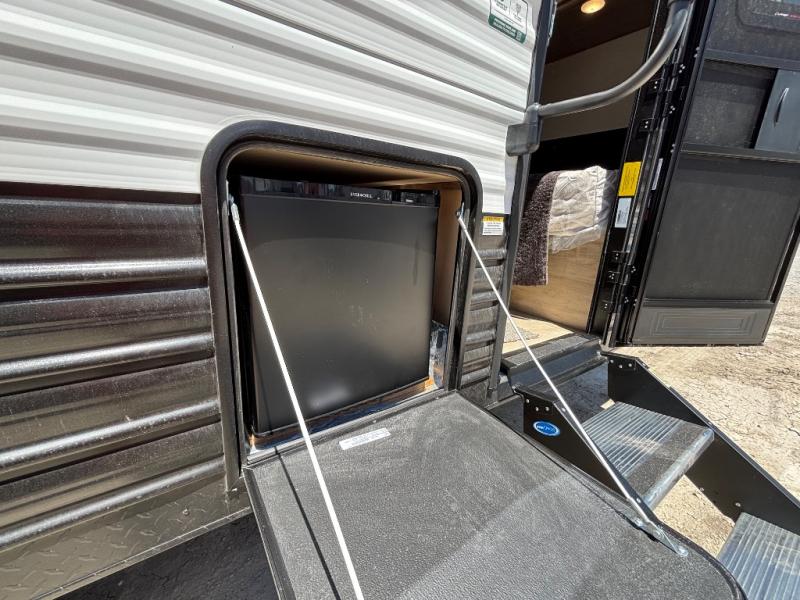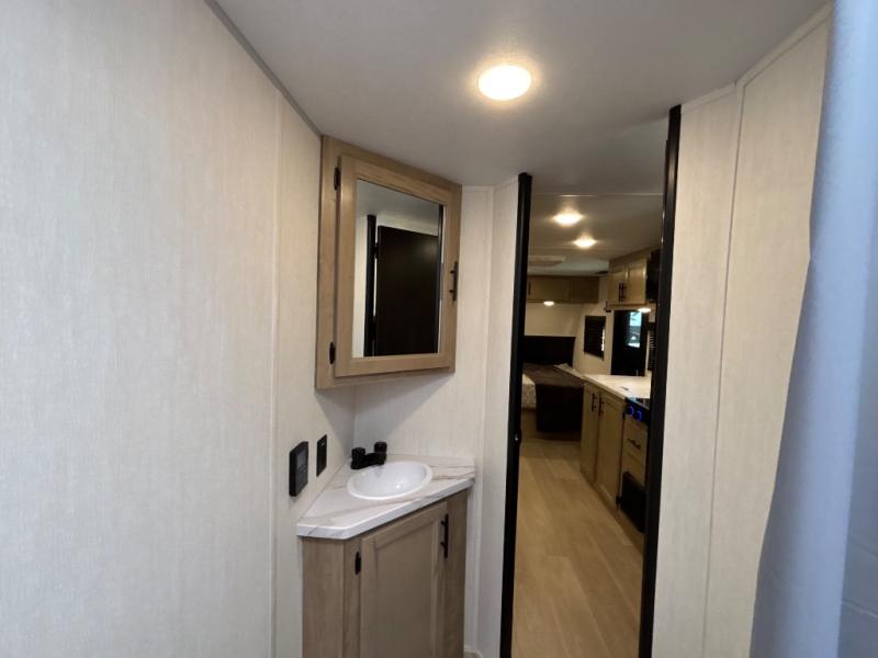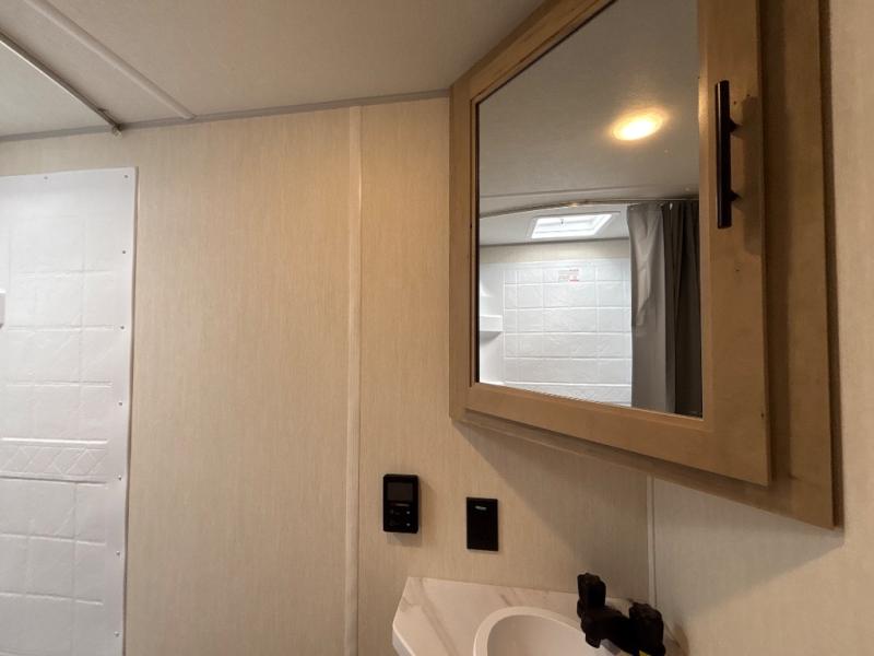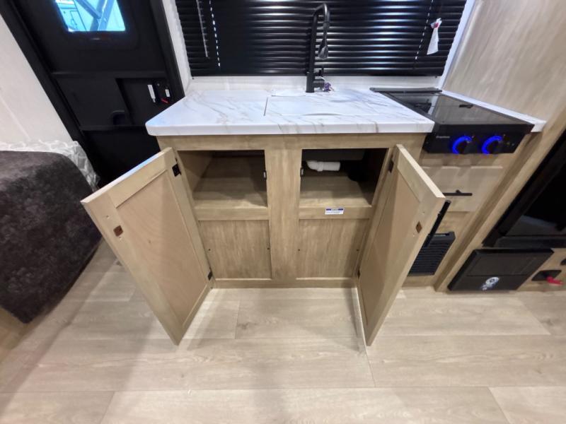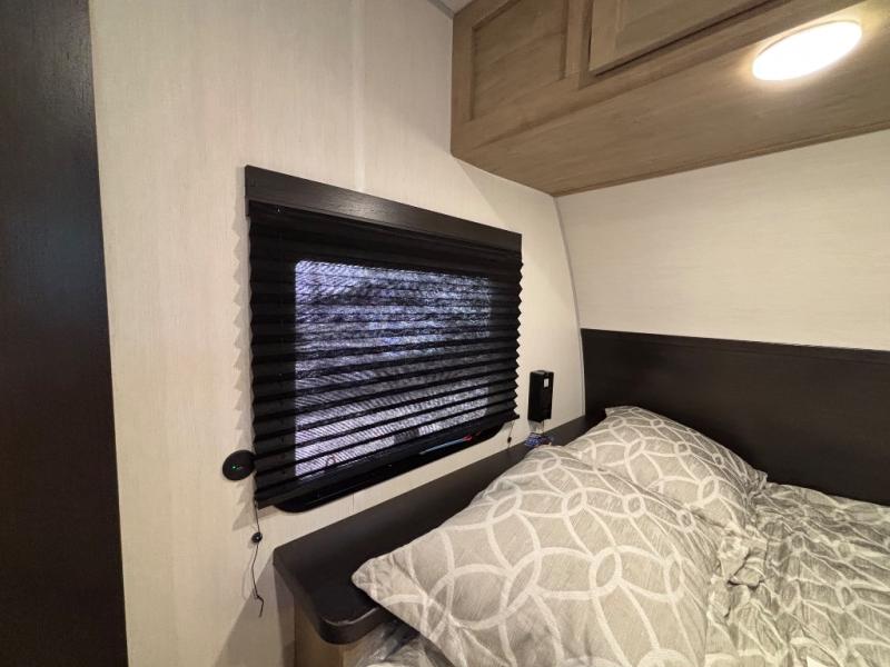 This family travel trailer is ready to head to the campground whenever you are! The kiddos can sleep on the set of double-size bed bunks and you can sleep on the front queen bed, plus the U-shaped dinette slide can also transform into an extra sleeping space when you aren't using it to enjoy a meal prepared with the high output cooktop. You can also prepare your delicious meals at the outside mini kitchen and stay protected by the power awning. The exterior not only has outside storage and an outside TV mount, but also features an outside storage plus door for access to the storage space underneath the bottom bunk bed. The rear corner bath allows everyone to stay clean and refreshed while you camp.