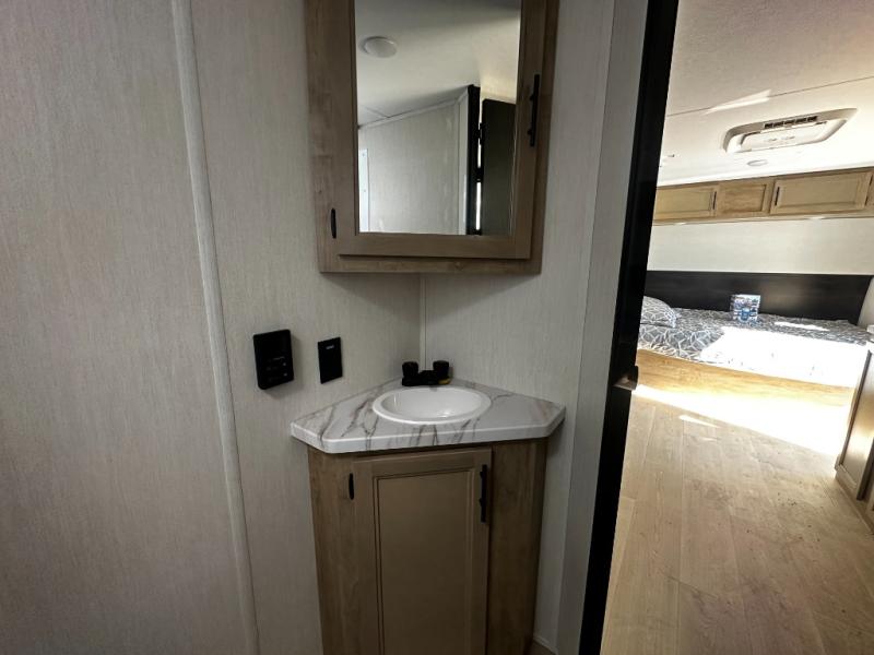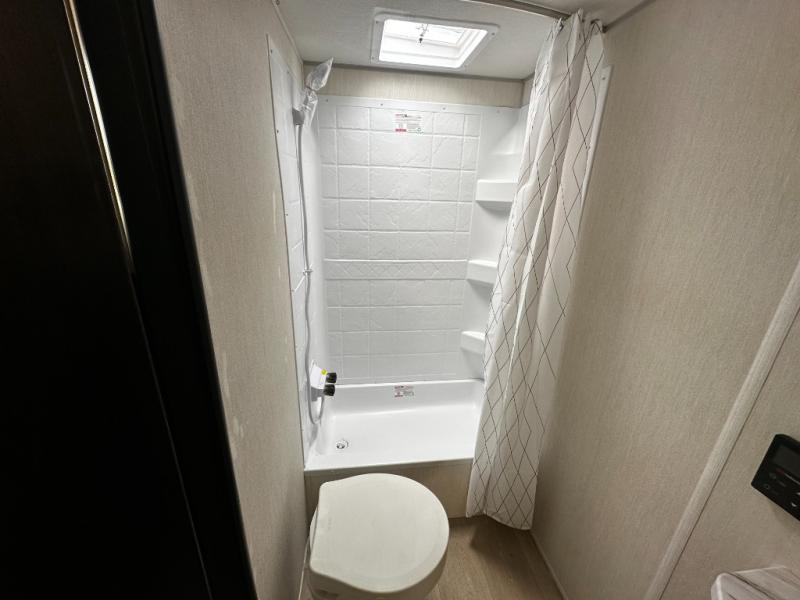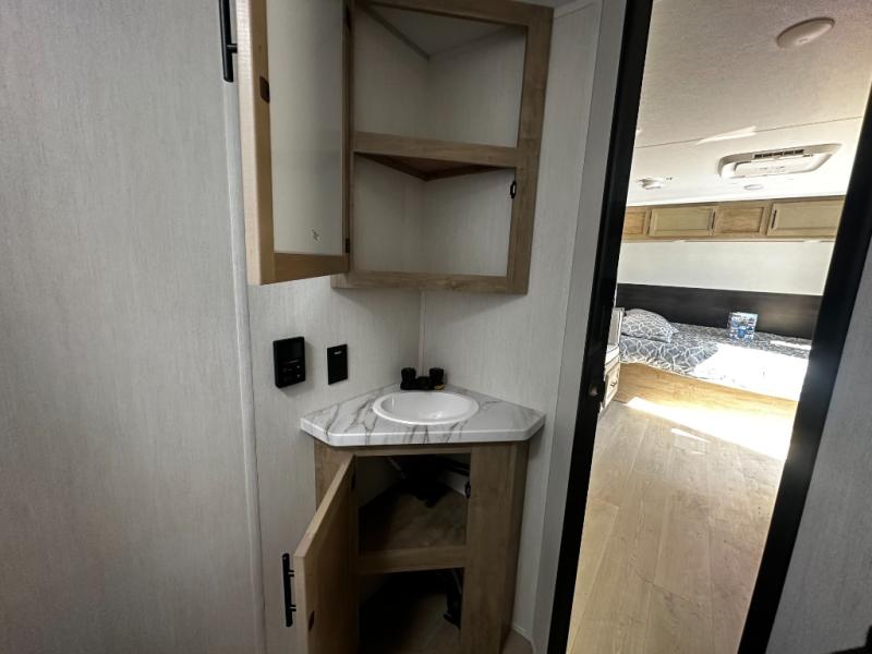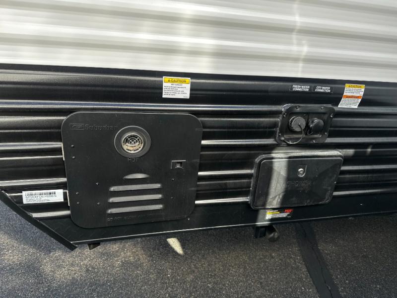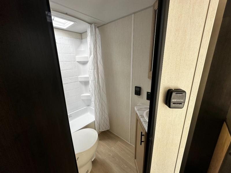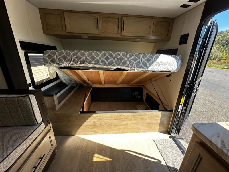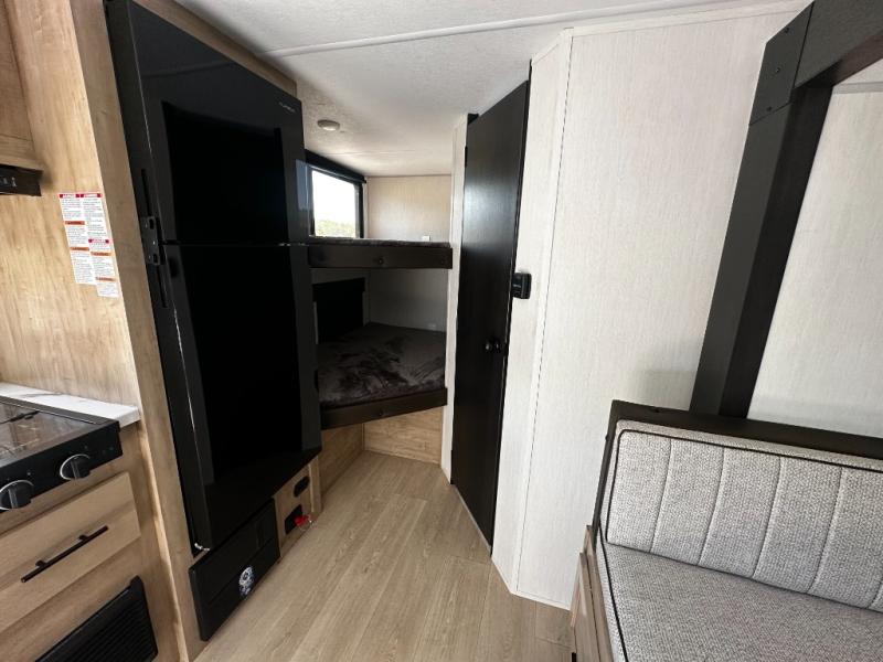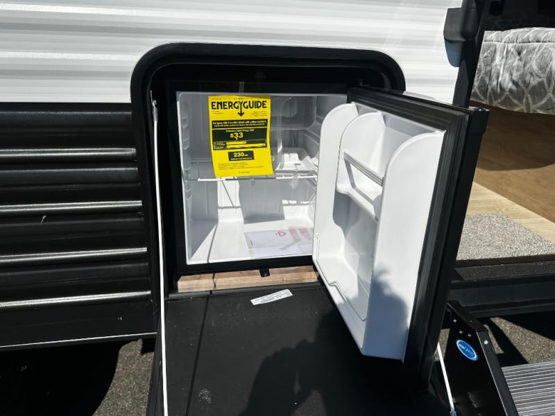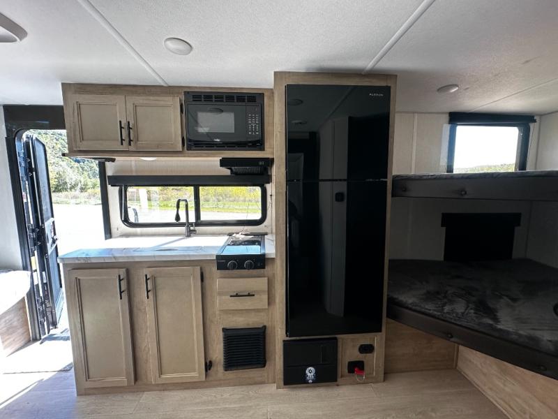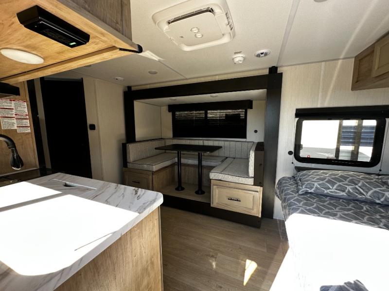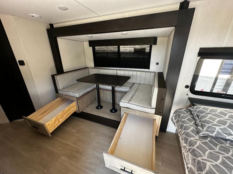 This family travel trailer is ready to head to the campground whenever you are! The kiddos can sleep on the set of double-size bed bunks, and you can sleep on the front queen bed, plus the U-shaped dinette slide can also transform into an extra sleeping space when you aren't using it to enjoy a meal prepared with the cooktop. You can also prepare your delicious meals at the outside mini kitchen and stay protected by the power awning. The exterior not only has outside storage and an outside TV mount but also features an outside storage plus door for access to the storage space underneath the bottom bunk bed. The rear corner bath allows everyone to stay clean and refreshed while you camp.
