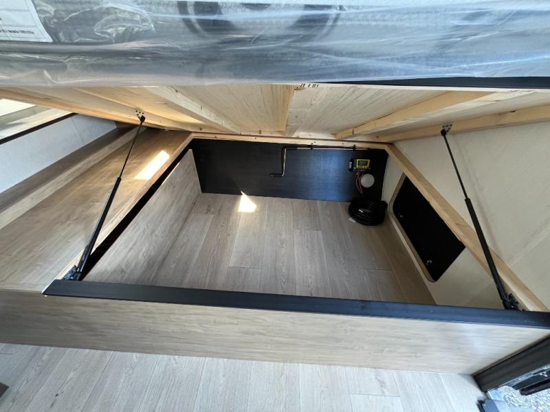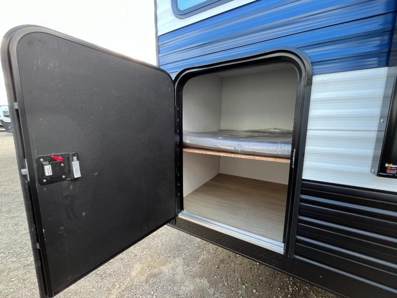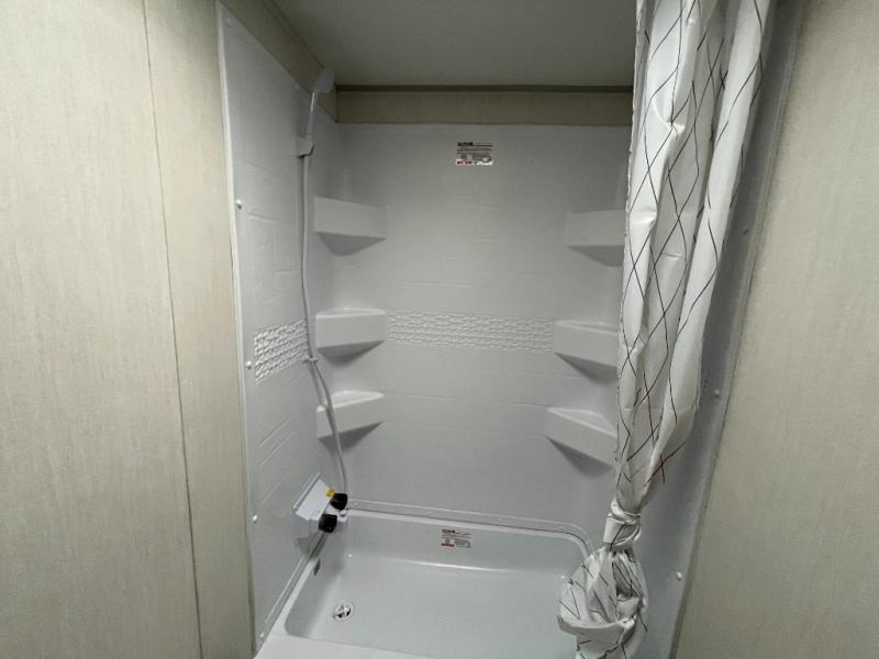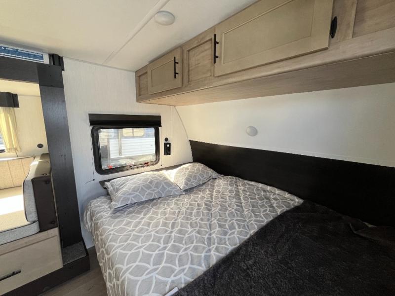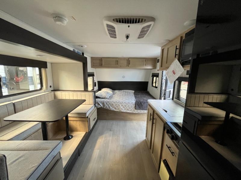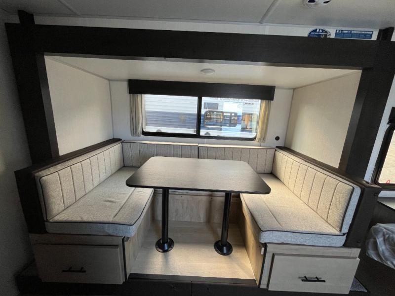 This family travel trailer is ready to head to the campground whenever you are! The kiddos can sleep on the set of double-size bed bunks, and you can sleep on the front queen bed, plus the U-shaped dinette slide can also transform into an extra sleeping space when you aren't using it to enjoy a meal prepared with the cooktop. You can also prepare your delicious meals at the outside mini kitchen and stay protected by the power awning. The exterior not only has outside storage and an outside TV mount but also features an outside storage plus door for access to the storage space underneath the bottom bunk bed. The rear corner bath allows everyone to stay clean and refreshed while you camp.