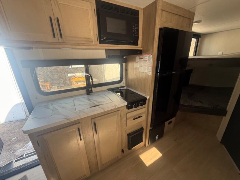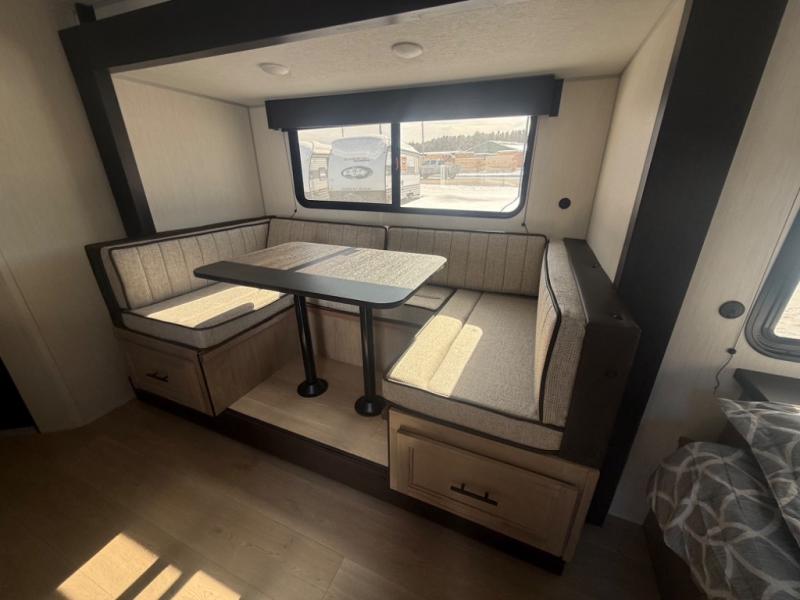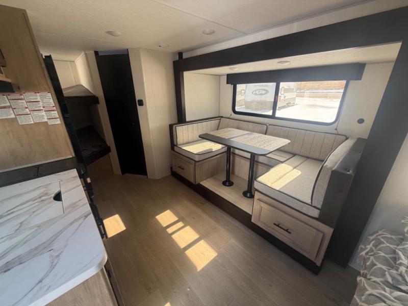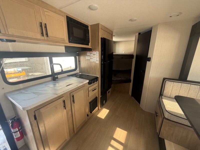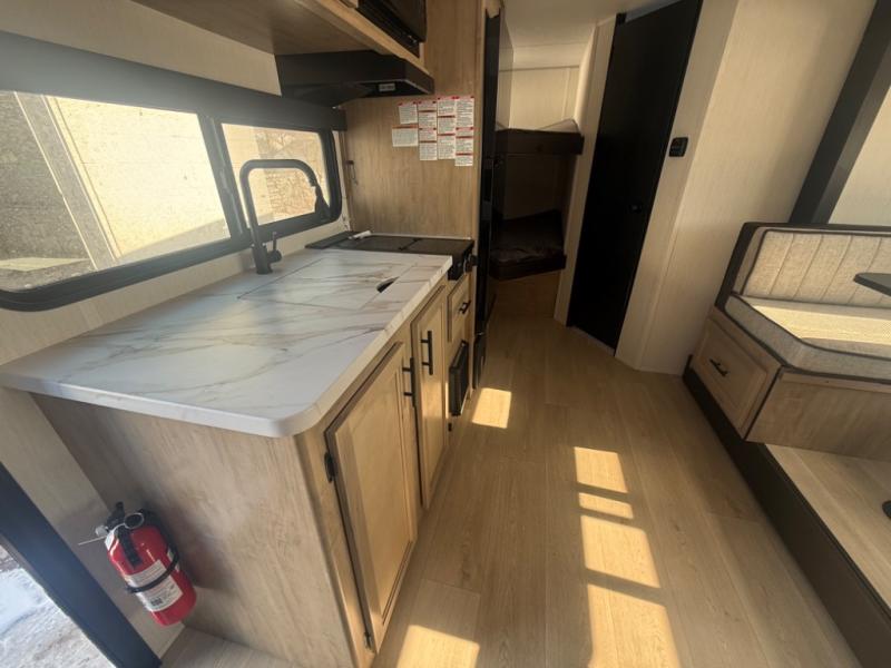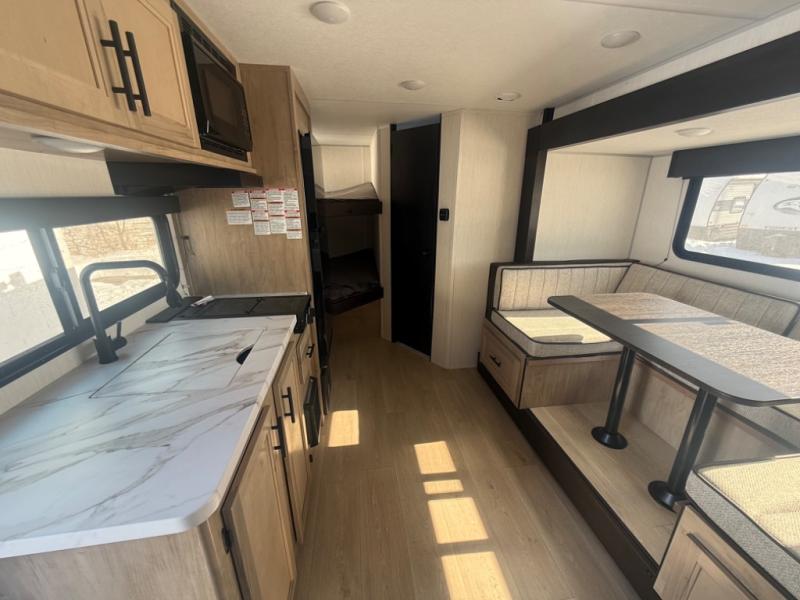 This family travel trailer is ready to head to the campground whenever you are! The kiddos can sleep on the set of double-size bed bunks and you can sleep on the front queen bed, plus the U-shaped dinette slide can also transform into an extra sleeping space when you aren't using it to enjoy a meal prepared with the high output cooktop. You can also prepare your delicious meals at the outside mini kitchen and stay protected by the power awning. The exterior not only has outside storage and an outside TV mount, but also features an outside storage plus door for access to the storage space underneath the bottom bunk bed. The rear corner bath allows everyone to stay clean and refreshed while you camp.