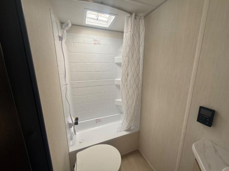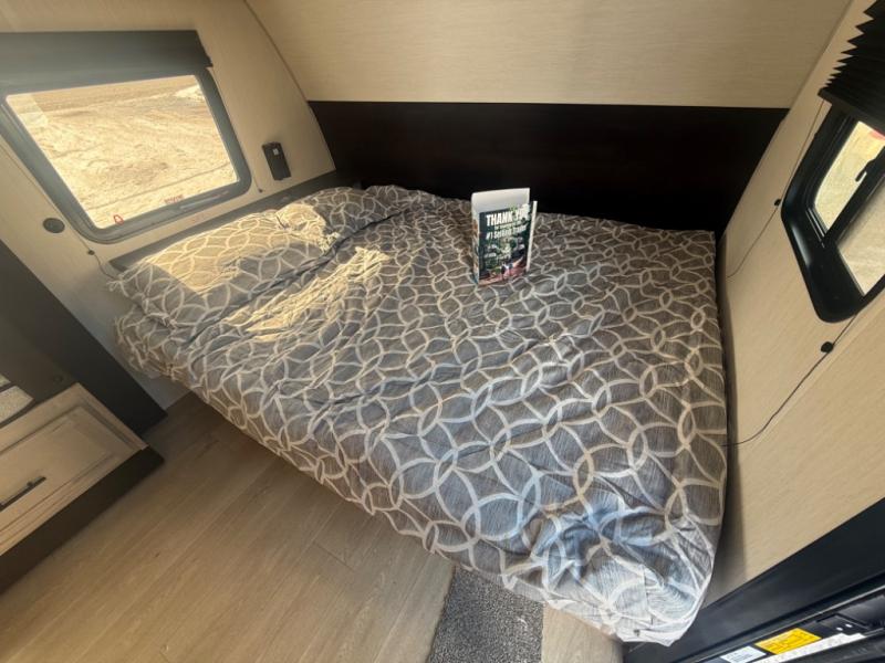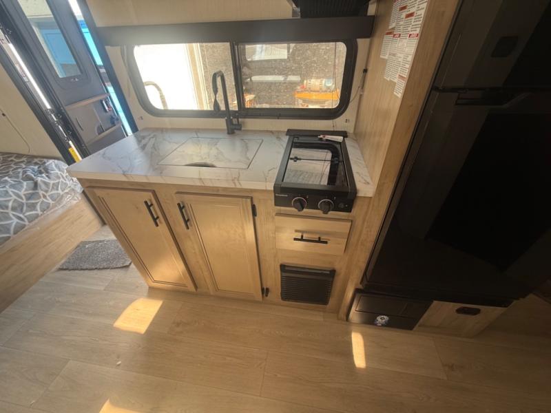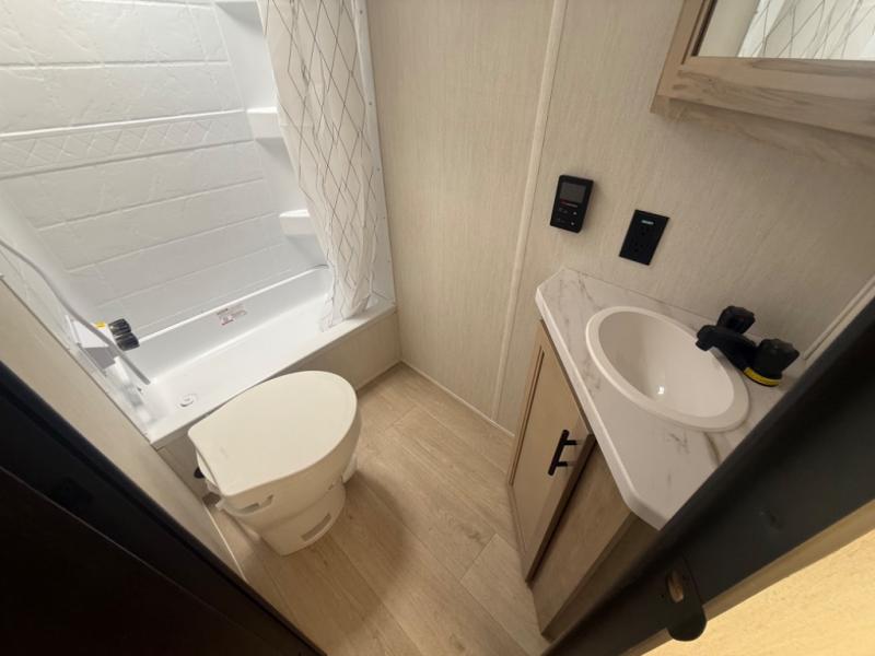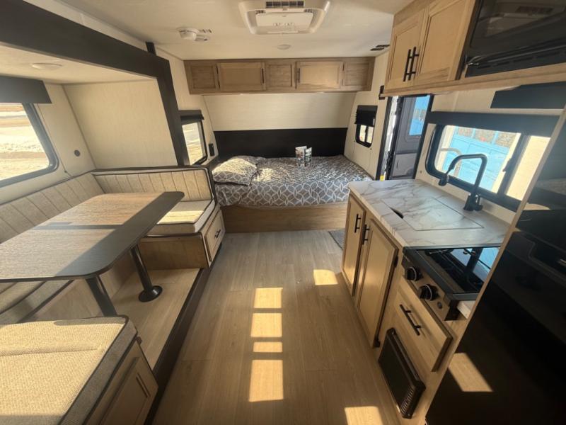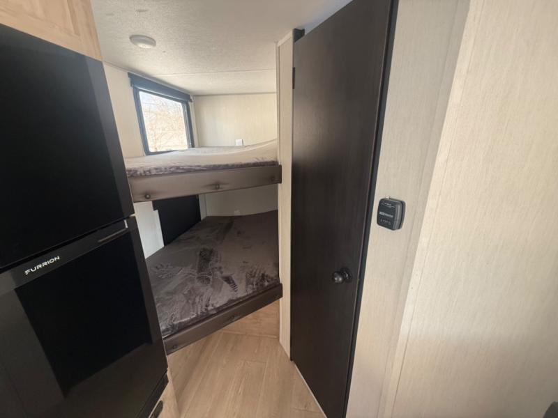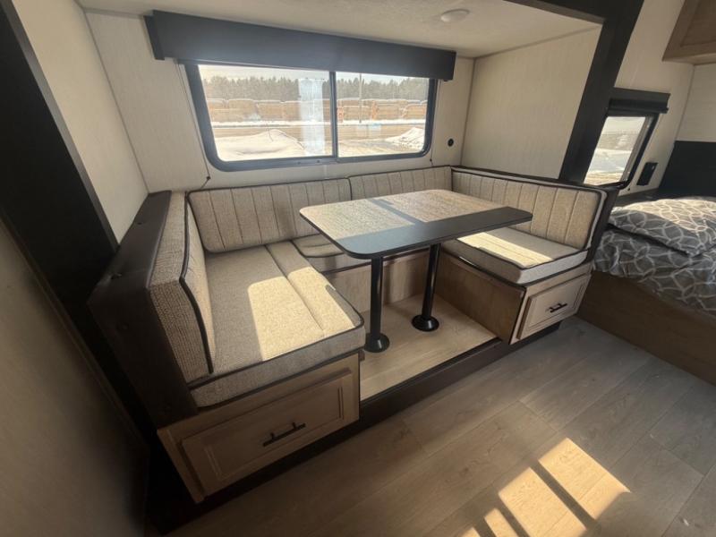 This family travel trailer is ready to head to the campground whenever you are! The kiddos can sleep on the set of double-size bed bunks and you can sleep on the front queen bed, plus the U-shaped dinette slide can also transform into an extra sleeping space when you aren't using it to enjoy a meal prepared with the high output cooktop. You can also prepare your delicious meals at the outside mini kitchen and stay protected by the power awning. The exterior not only has outside storage and an outside TV mount, but also features an outside storage plus door for access to the storage space underneath the bottom bunk bed. The rear corner bath allows everyone to stay clean and refreshed while you camp.