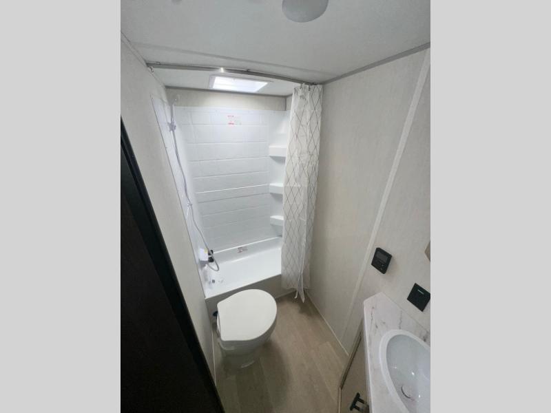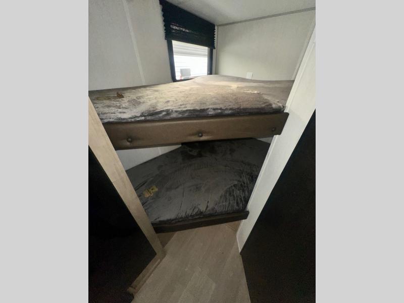 This family travel trailer is ready to head to the campground whenever you are! The kiddos can sleep on the set of double-size bed bunks, and you can sleep on the front queen bed, plus the U-shaped dinette slide can also transform into an extra sleeping space when you aren't using it to enjoy a meal prepared with the cooktop. You can also prepare your delicious meals at the outside mini kitchen and stay protected by the power awning. The exterior not only has outside storage and an outside TV mount but also features an outside storage plus door for access to the storage space underneath the bottom bunk bed. The rear corner bath allows everyone to stay clean and refreshed while you camp.