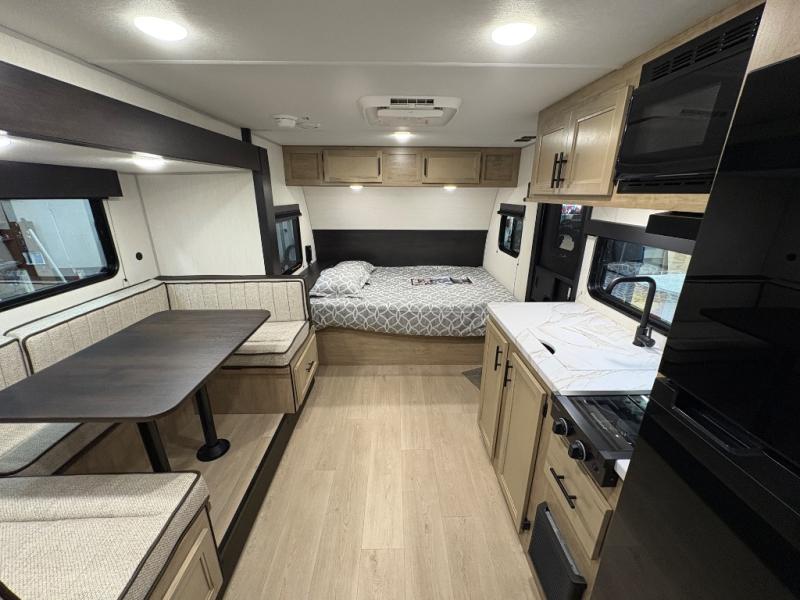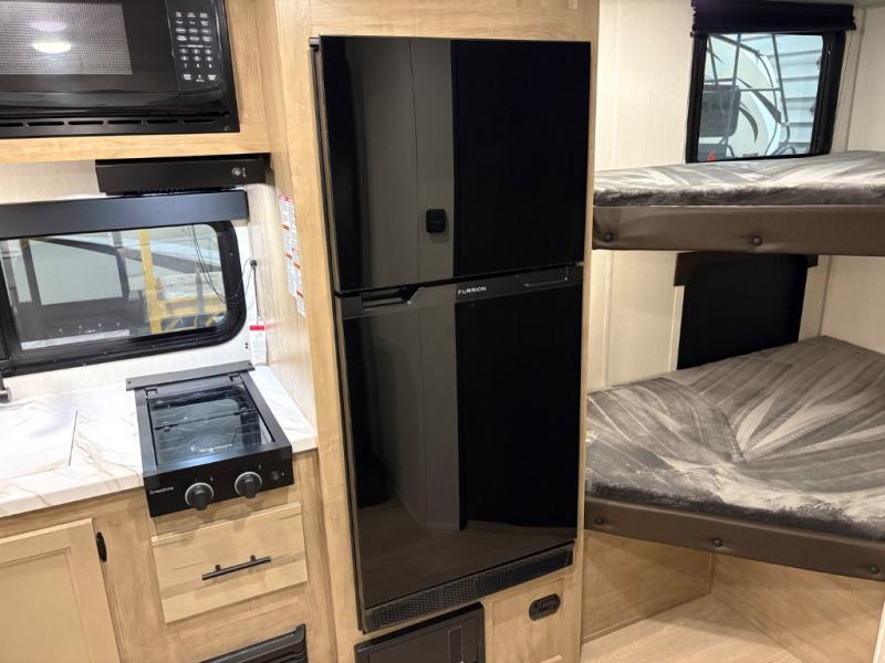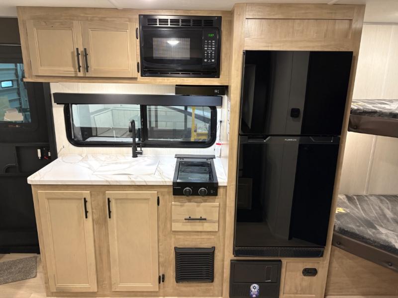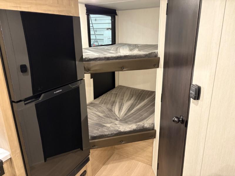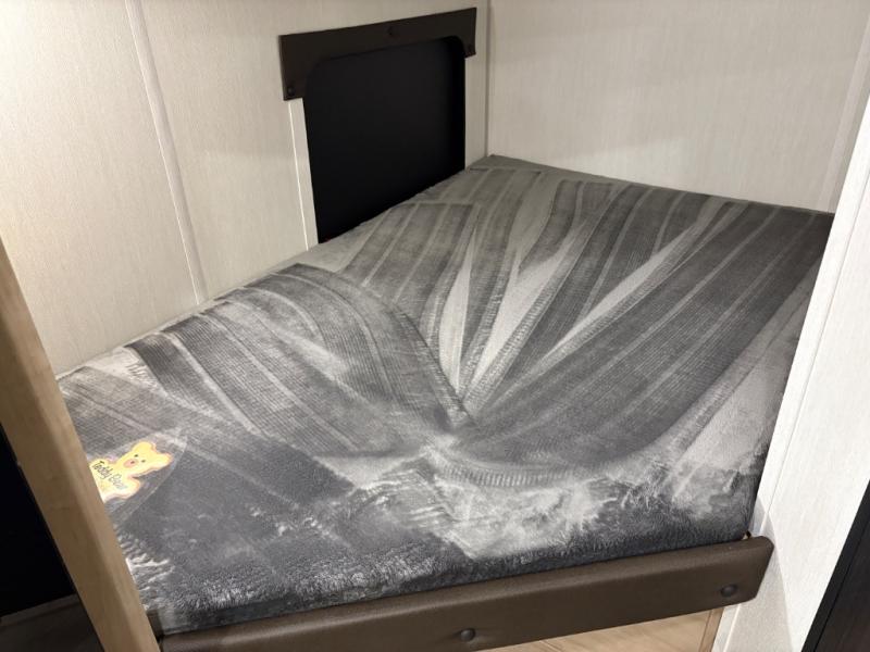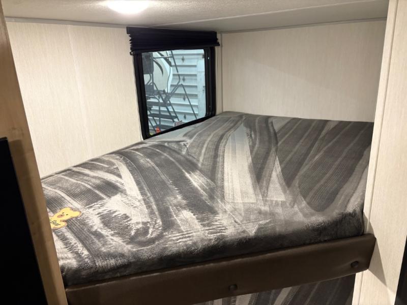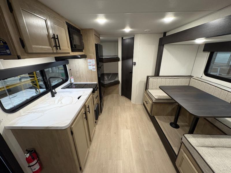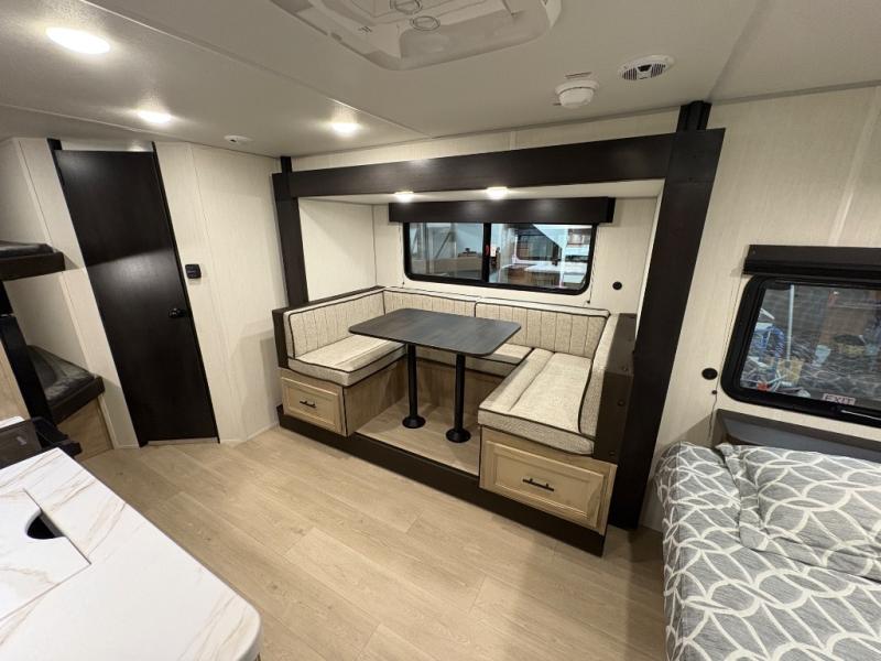 This family travel trailer is ready to head to the campground whenever you are! The kiddos can sleep on the set of double-size bed bunks, and you can sleep on the front queen bed, plus the U-shaped dinette slide can also transform into an extra sleeping space when you aren't using it to enjoy a meal prepared with the cooktop. You can also prepare your delicious meals at the outside mini kitchen and stay protected by the power awning. The exterior not only has outside storage and an outside TV mount but also features an outside storage plus door for access to the storage space underneath the bottom bunk bed. The rear corner bath allows everyone to stay clean and refreshed while you camp.