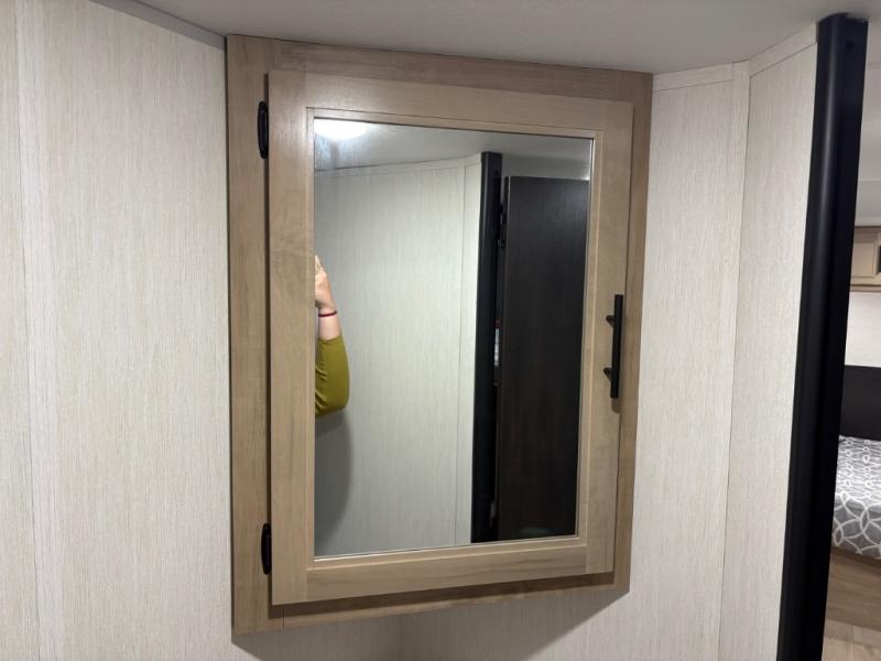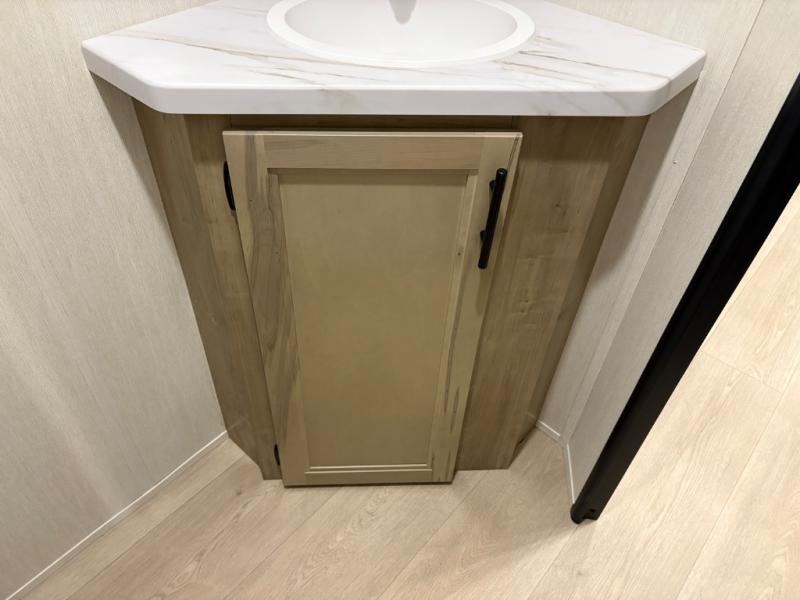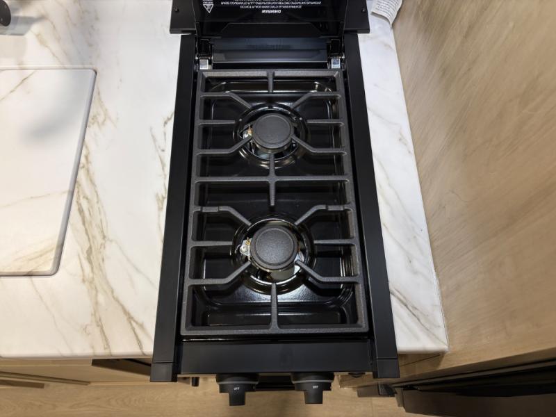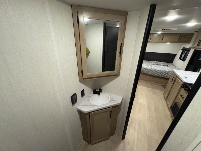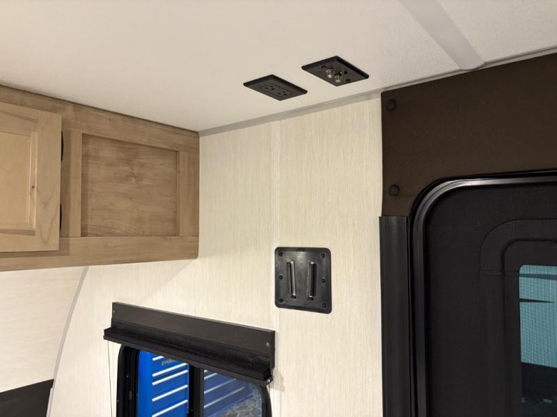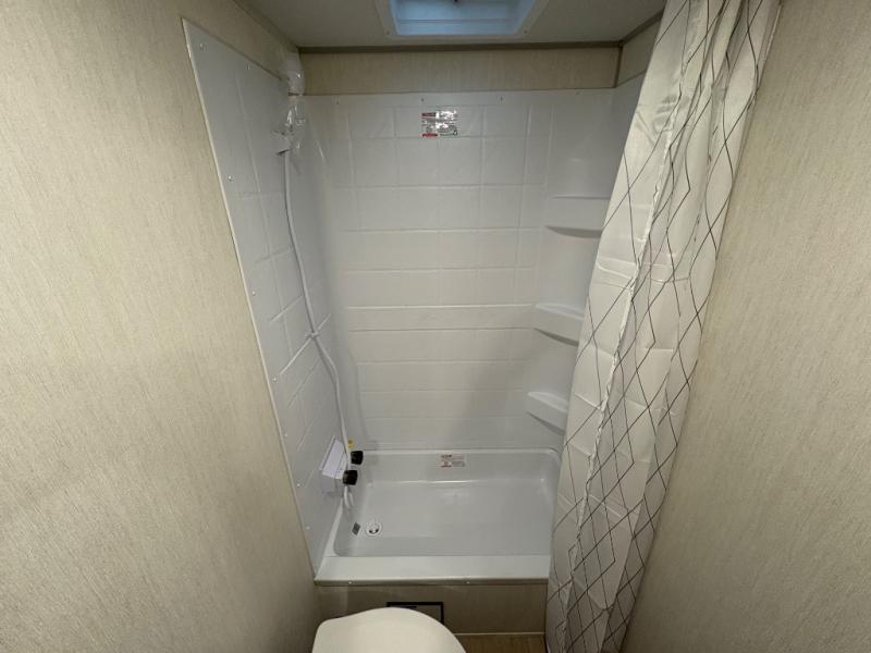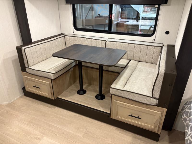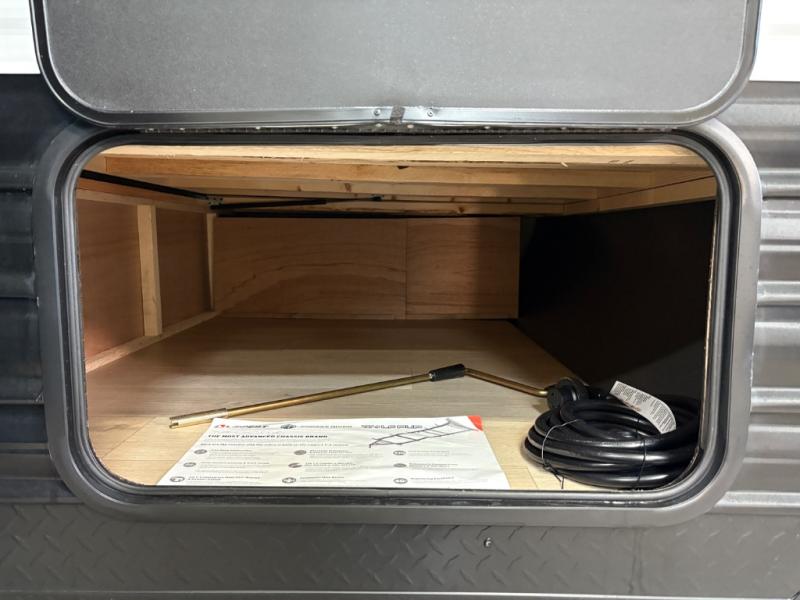 This family travel trailer is ready to head to the campground whenever you are! The kiddos can sleep on the set of double-size bed bunks, and you can sleep on the front queen bed, plus the U-shaped dinette slide can also transform into an extra sleeping space when you aren't using it to enjoy a meal prepared with the cooktop. You can also prepare your delicious meals at the outside mini kitchen and stay protected by the power awning. The exterior not only has outside storage and an outside TV mount but also features an outside storage plus door for access to the storage space underneath the bottom bunk bed. The rear corner bath allows everyone to stay clean and refreshed while you camp.