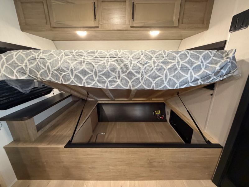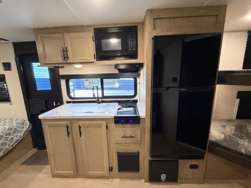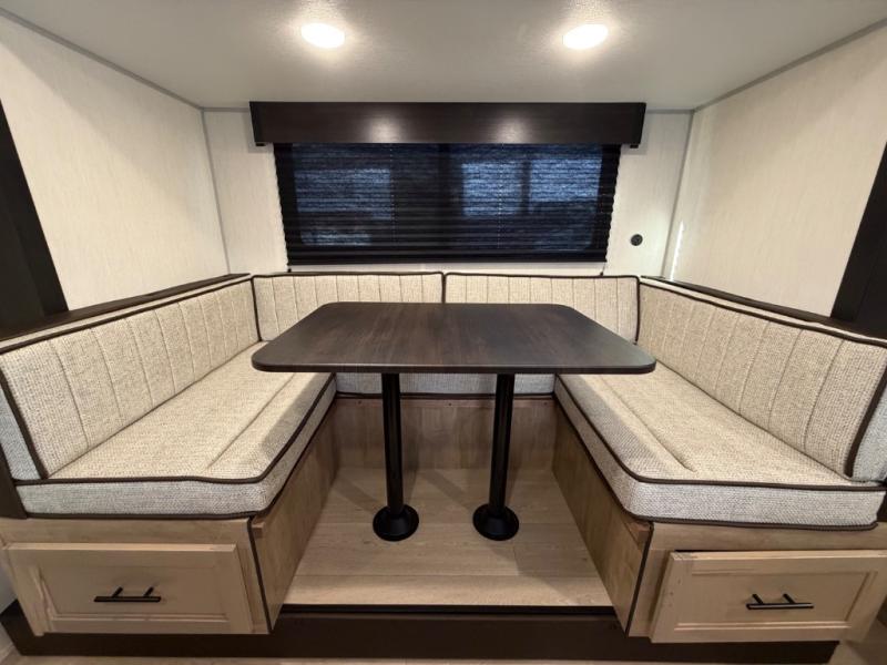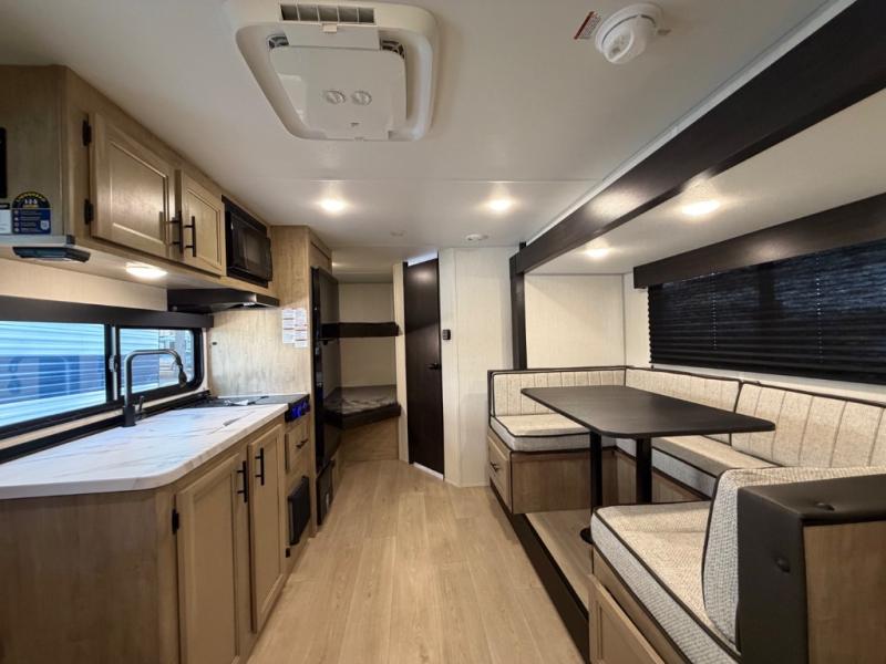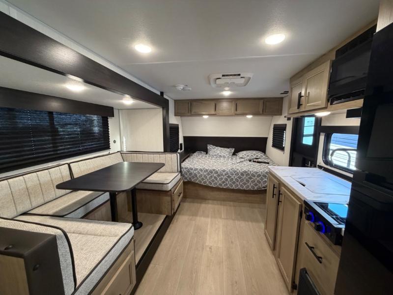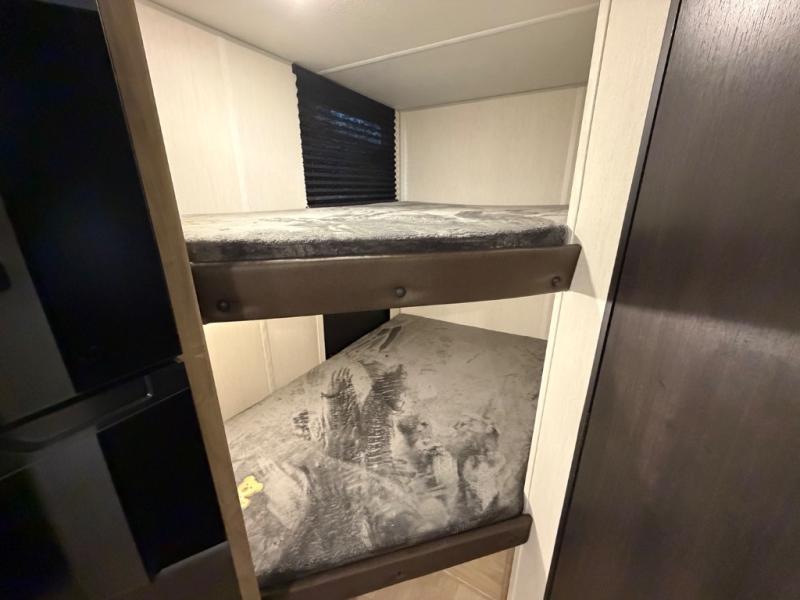 This family travel trailer is ready to head to the campground whenever you are! The kiddos can sleep on the set of double-size bed bunks, and you can sleep on the front queen bed, plus the U-shaped dinette slide can also transform into an extra sleeping space when you aren't using it to enjoy a meal prepared with the cooktop. You can also prepare your delicious meals at the outside mini kitchen and stay protected by the power awning. The exterior not only has outside storage and an outside TV mount but also features an outside storage plus door for access to the storage space underneath the bottom bunk bed. The rear corner bath allows everyone to stay clean and refreshed while you camp.