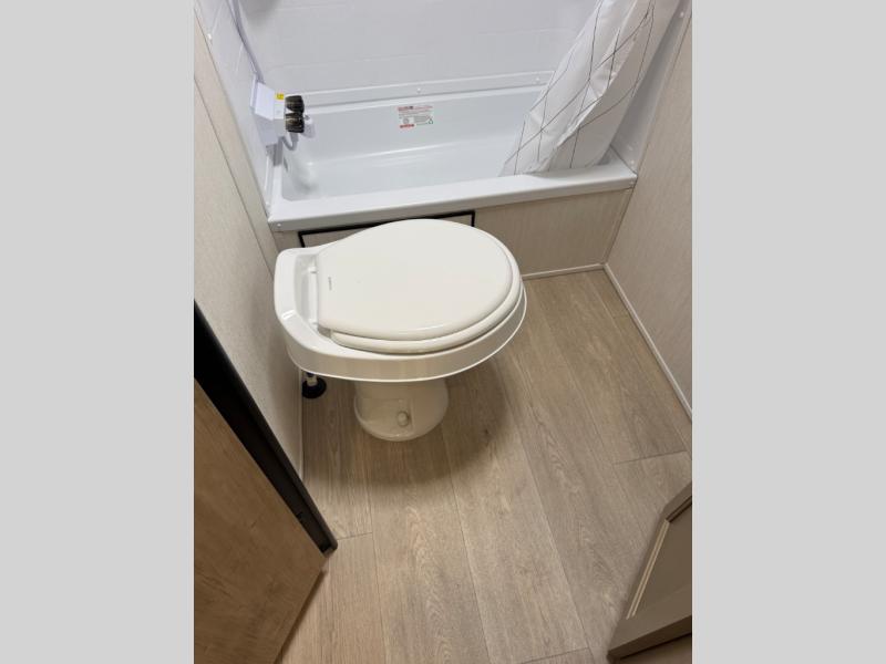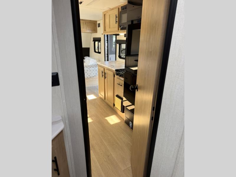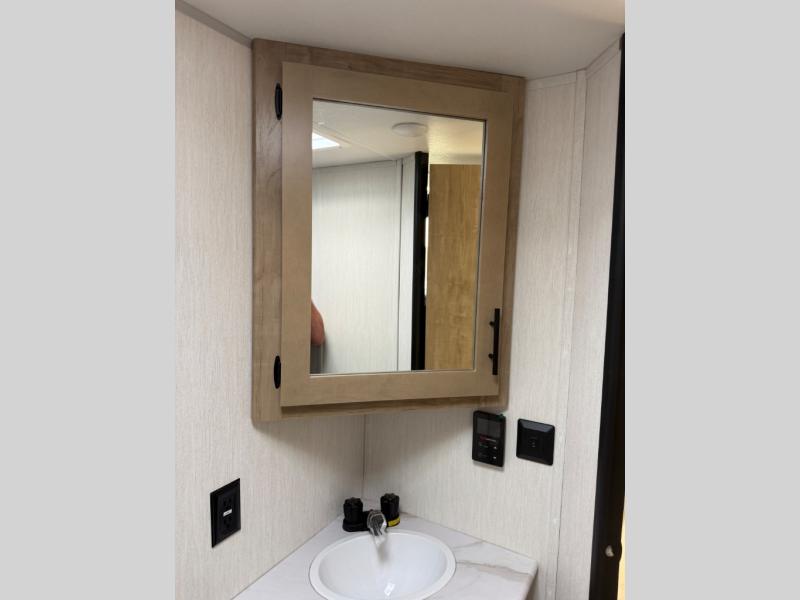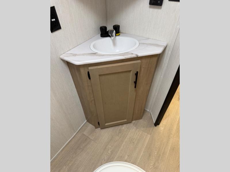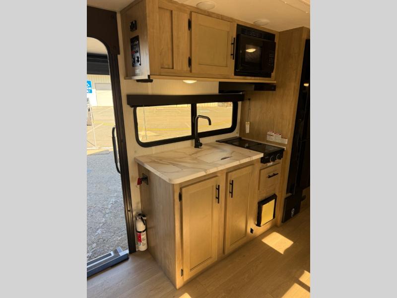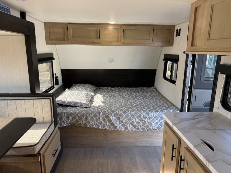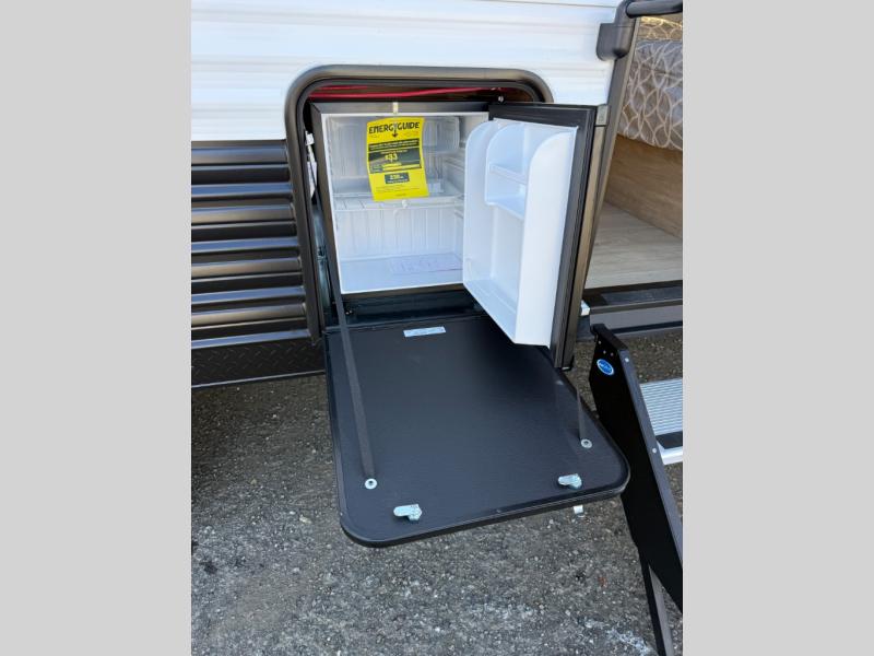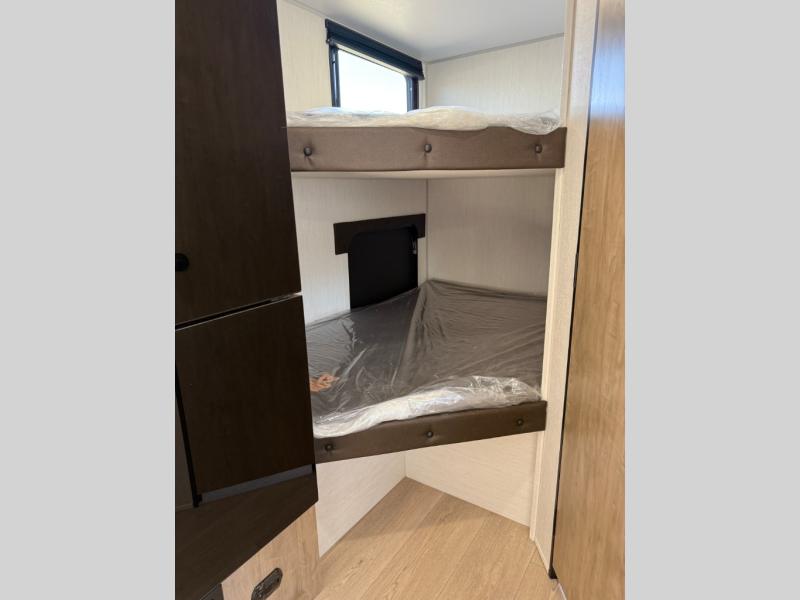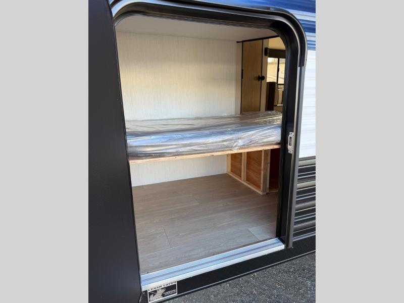 This family travel trailer is ready to head to the campground whenever you are! The kiddos can sleep on the set of double-size bed bunks, and you can sleep on the front queen bed, plus the U-shaped dinette slide can also transform into an extra sleeping space when you aren't using it to enjoy a meal prepared with the cooktop. You can also prepare your delicious meals at the outside mini kitchen and stay protected by the power awning. The exterior not only has outside storage and an outside TV mount but also features an outside storage plus door for access to the storage space underneath the bottom bunk bed. The rear corner bath allows everyone to stay clean and refreshed while you camp.