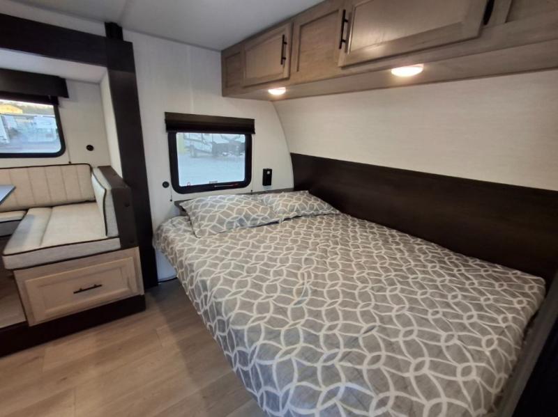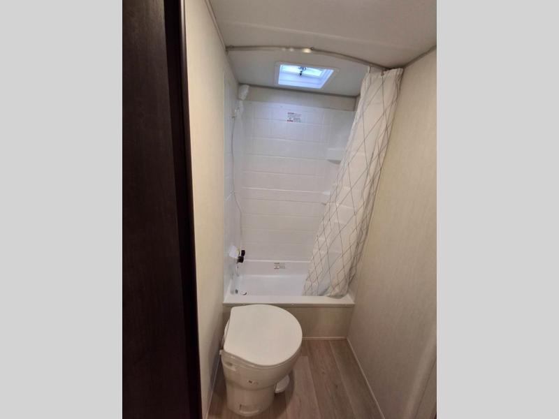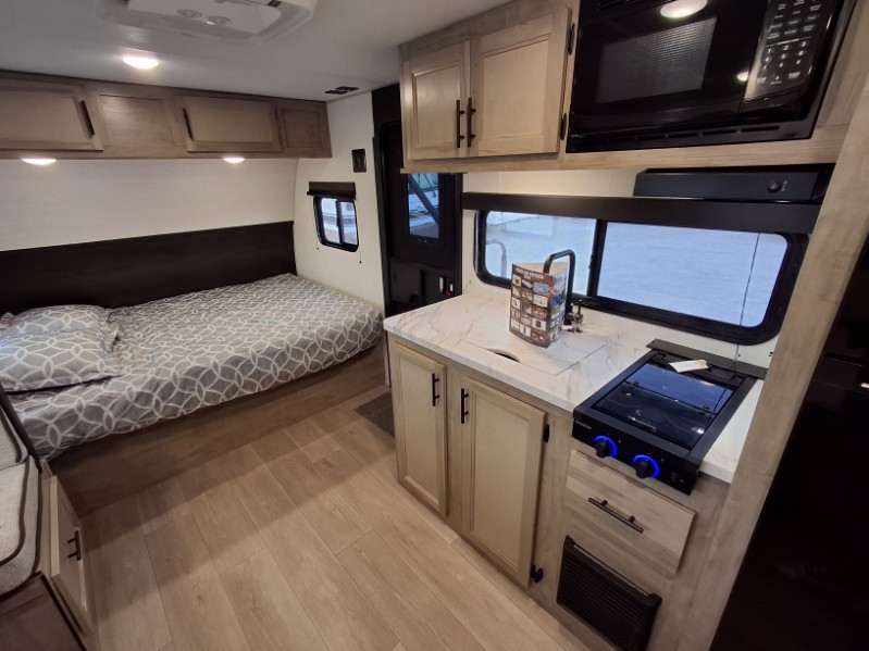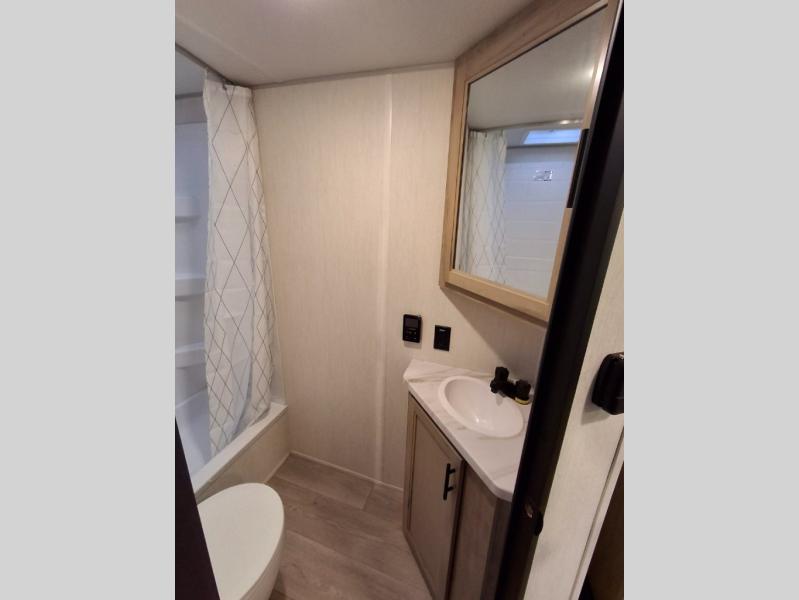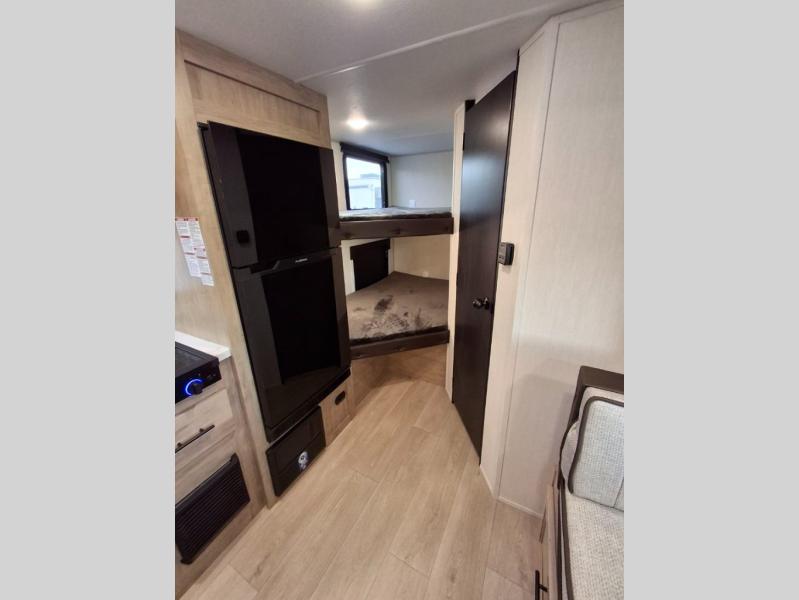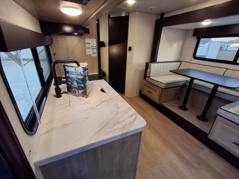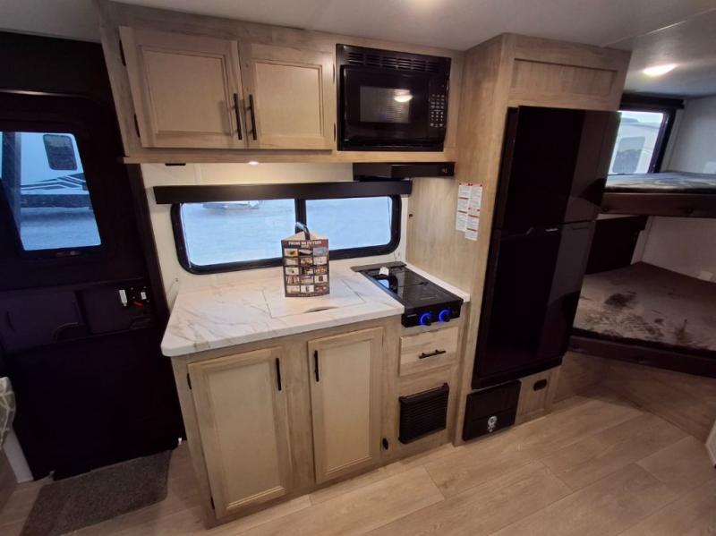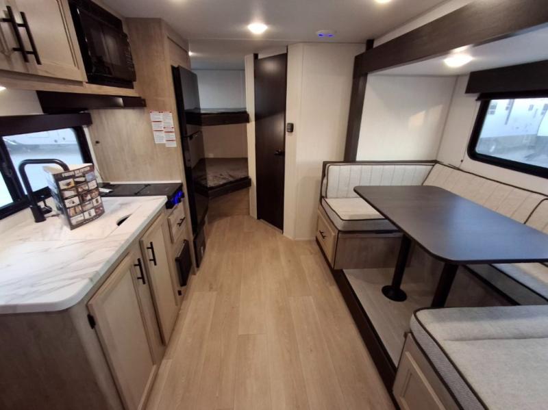 This family travel trailer is ready to head to the campground whenever you are! The kiddos can sleep on the set of double-size bed bunks, and you can sleep on the front queen bed, plus the U-shaped dinette slide can also transform into an extra sleeping space when you aren't using it to enjoy a meal prepared with the cooktop. You can also prepare your delicious meals at the outside mini kitchen and stay protected by the power awning. The exterior not only has outside storage and an outside TV mount but also features an outside storage plus door for access to the storage space underneath the bottom bunk bed. The rear corner bath allows everyone to stay clean and refreshed while you camp.