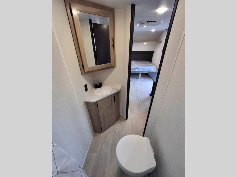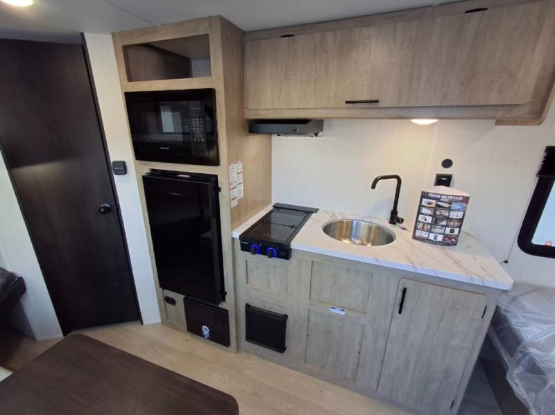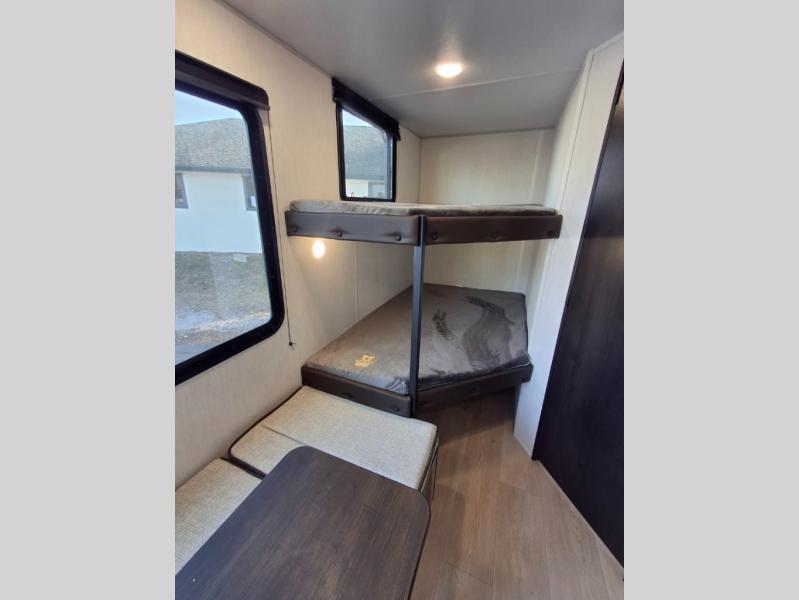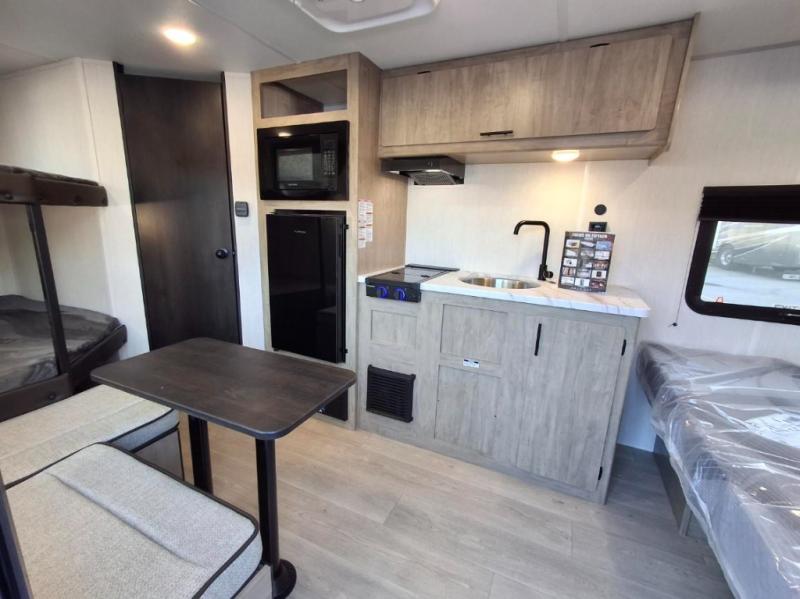 Create amazing memories in this stunning travel trailer! It is perfect for at least six people, thanks to its multiple sleeping spaces. The spacious double-sized bunk beds are ideal for kids or guests, while the plush queen-sized bed provides a restful retreat for adults. The full bathroom is equipped with everything you need for a comfortable stay, and the kitchen features a refrigerator and microwave for you to go wild in the kitchen. You can also gather around the dinette for meals and snacks, or relax in the evenings under the protection of the exterior awning. In addition, ample overhead cabinets provide storage for cookware, dishes, and essentials, keeping your trailer tidy and organized.
