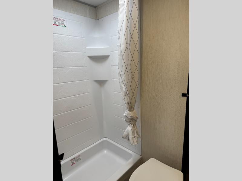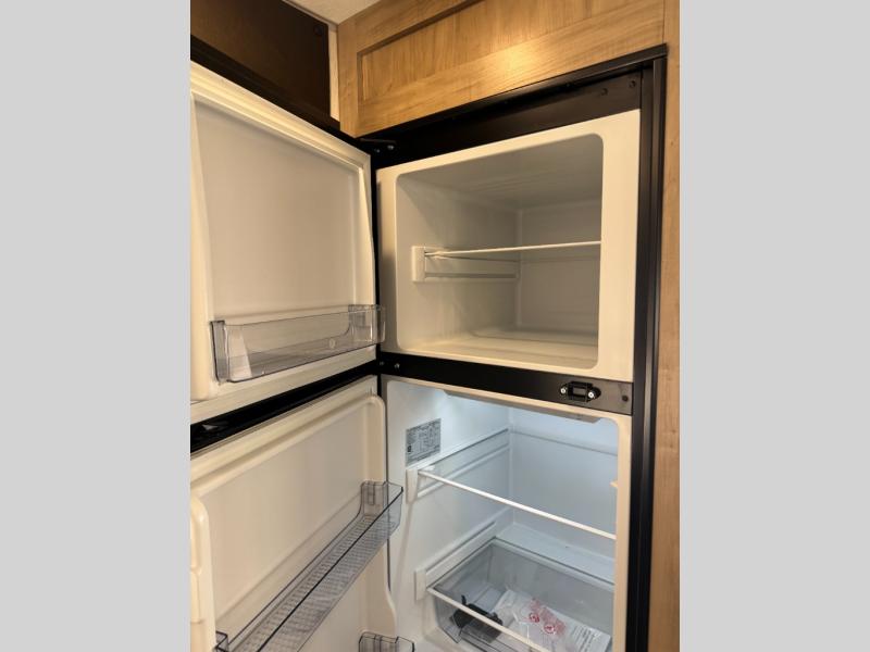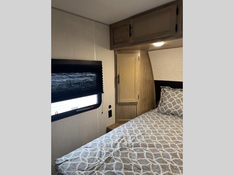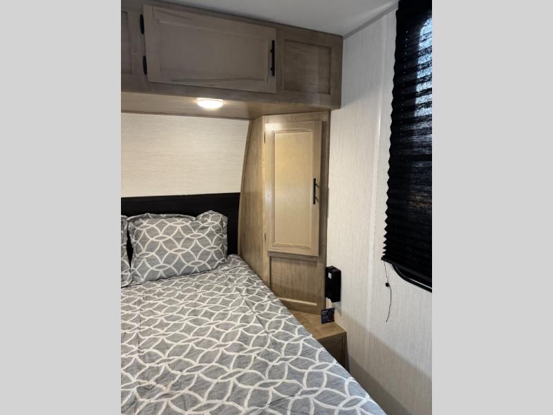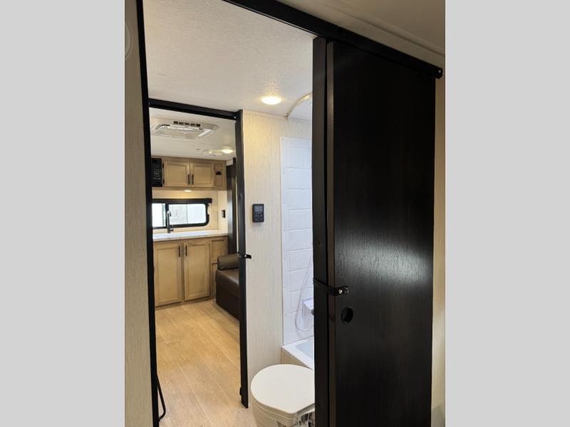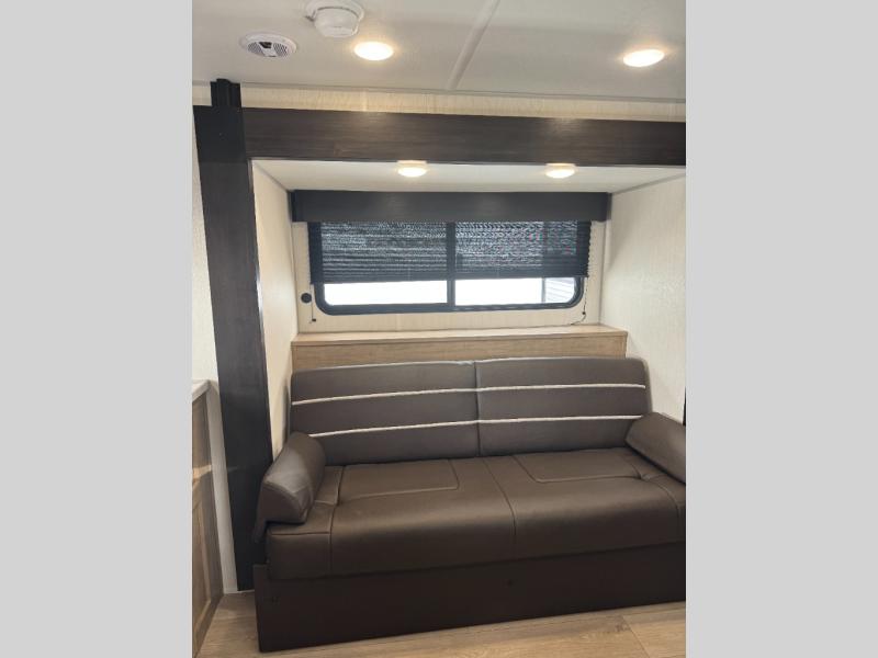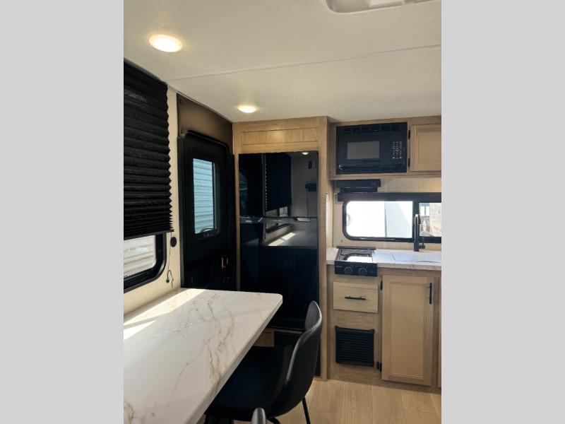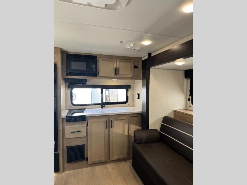 Convenient camping is found with this lightweight travel trailer! Once you arrive at your destination, put out the power awning, then make lunch on the exterior mini kitchen. Inside, you can dine at the bar top with stools, freshen up in the tub/shower, and sleep soundly on the queen bed in the master bedroom. There is also a sofa slide out to provide additional seating, sleeping, and interior space! And you're sure to find plenty of storage spaces both inside and outside, including a rear storage rack!