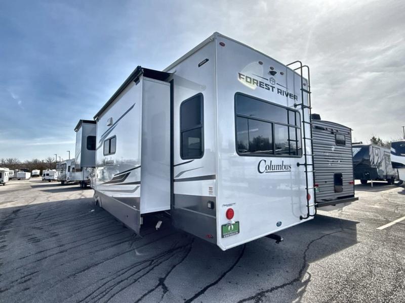 Experience a different camping life with residential furnishings and high-end features in each one of these Forest River Columbus fifth wheels! Durable construction begins with a 101" wide body, an all-welded aluminum frame superstructure, and high-gloss fiberglass vacuum bonded walls and slide out ends with dual Azdel. You will appreciate the Lippert axles, MORryde CRE 3000 suspension system, and 16" wheels with nitrogen-filled tires for a smooth tow from home to campground. Additional exterior features include a tire pressure monitoring system, a heated utility convenience center, an outside sprayer, and slam latch on all the storage doors. Inside, you'll be met with many luxurious amenities, including residential style crown molding throughout, roller day/night shades, upgraded true solid surface countertops in the bath and kitchen, plus solid wood steps.