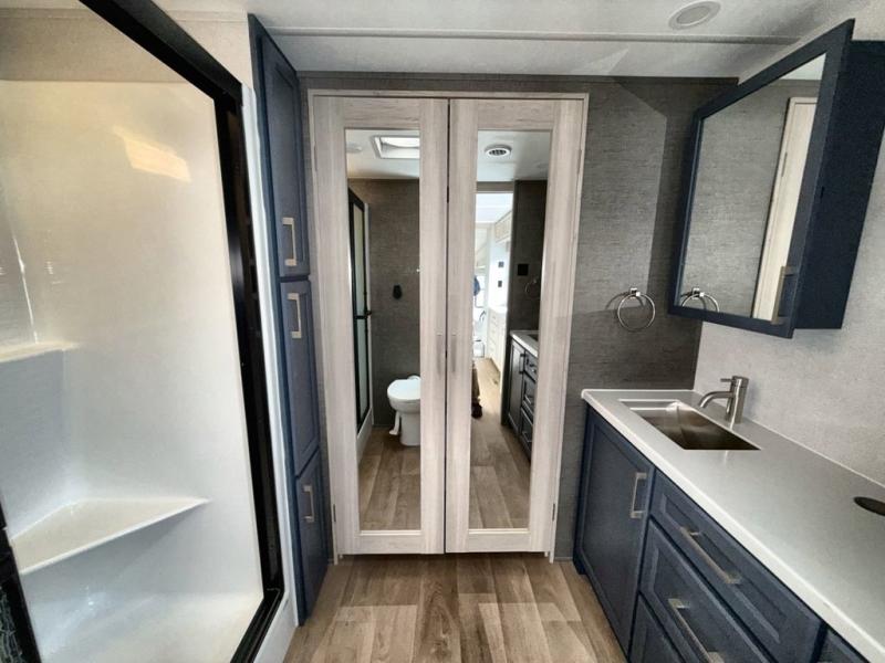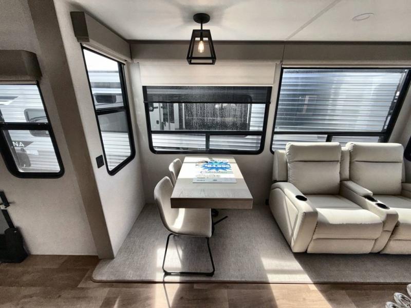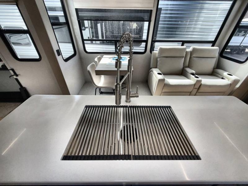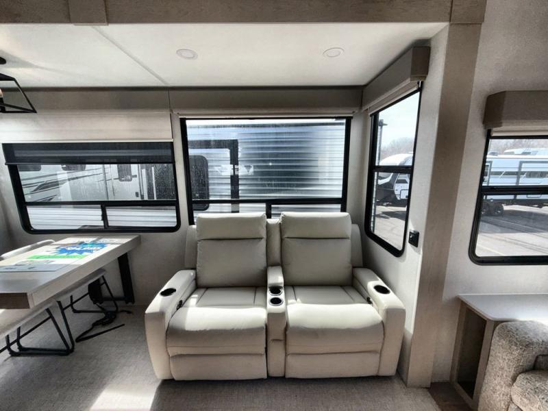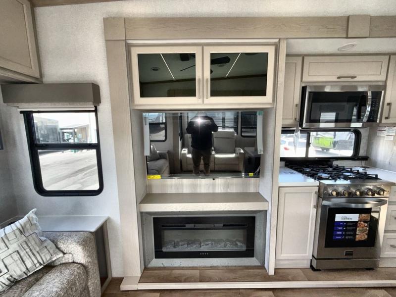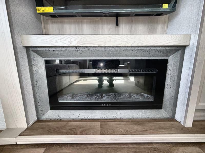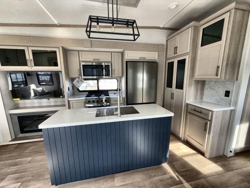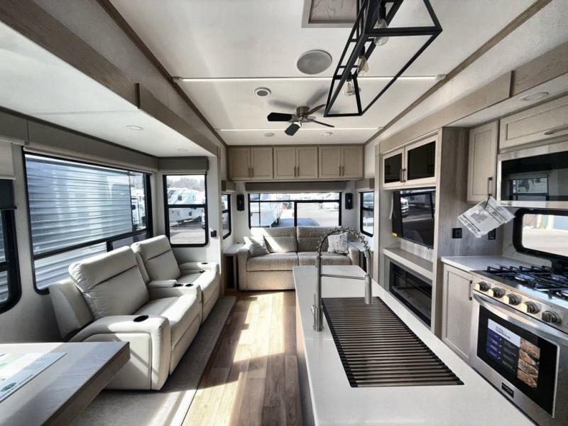 Everyone will stay clean with a bath and a half in this fifth wheel! The kitchen has a pantry big enough for everyone's favorite snacks, a gas cooktop, and a kitchen island to prepare your best meals. You can have game night indoors at the table and chairs or set up a table and chairs underneath the two power awnings. The rear living area offers a comfortable place to watch the big game too with a sofa/sleeper and theater seating directly across from the entertainment center with a 50" Smart TV and fireplace. Two can get ready at once in the front bathroom featuring a vanity with dual sinks, and since there is washer and dryer prep, you have the option to make wash day easier!