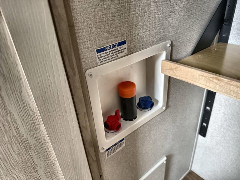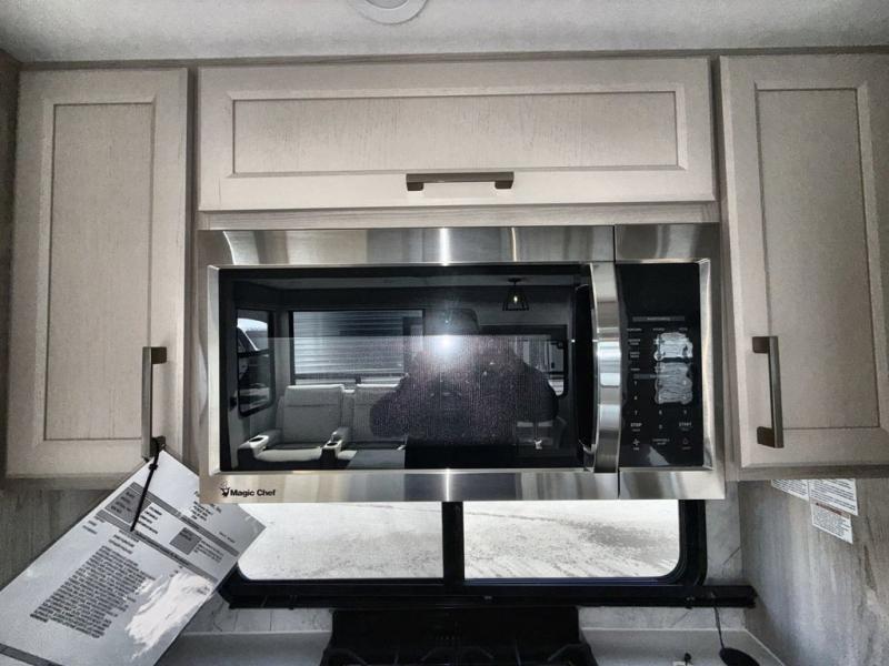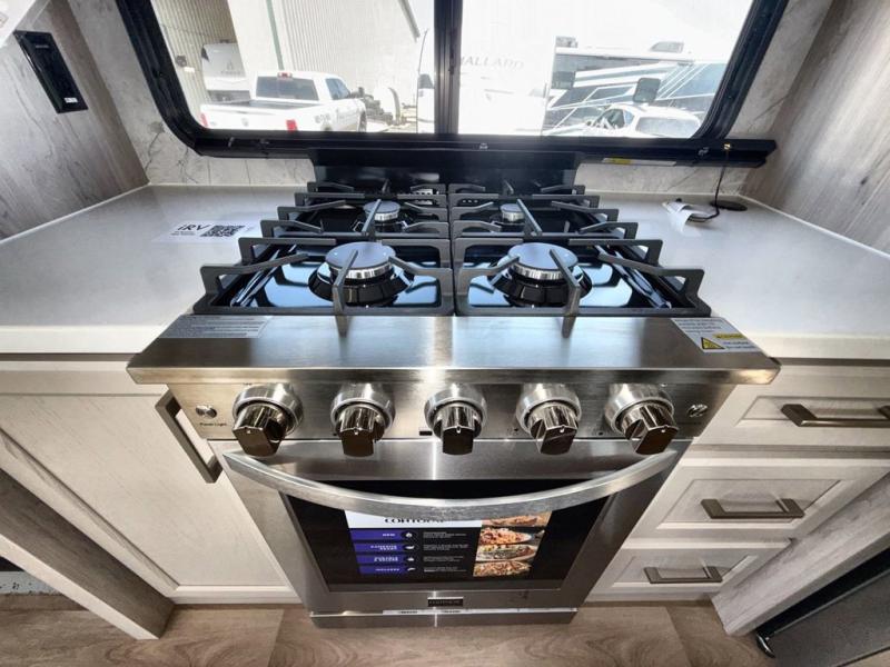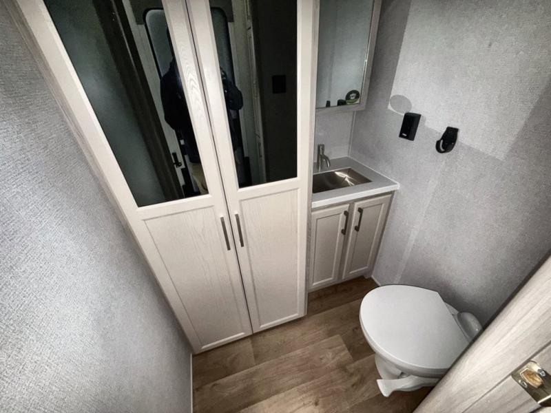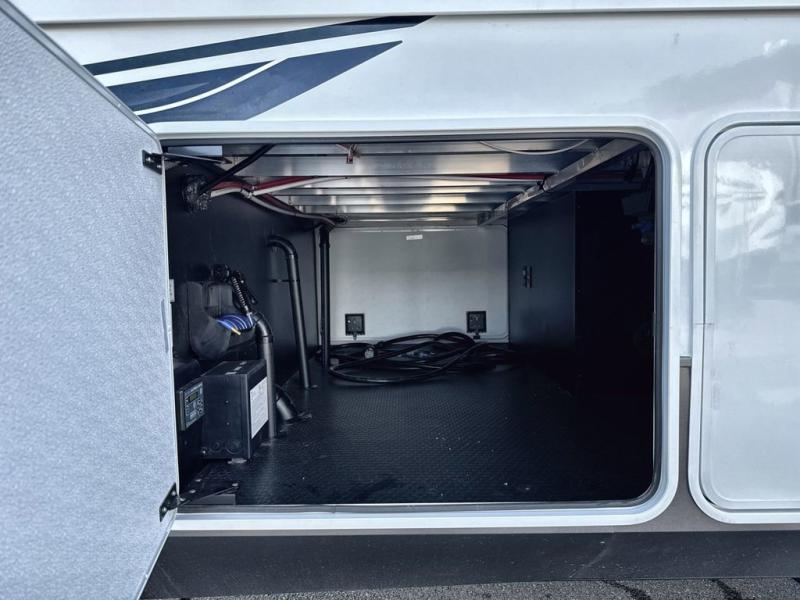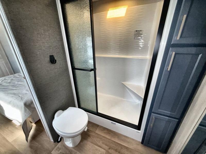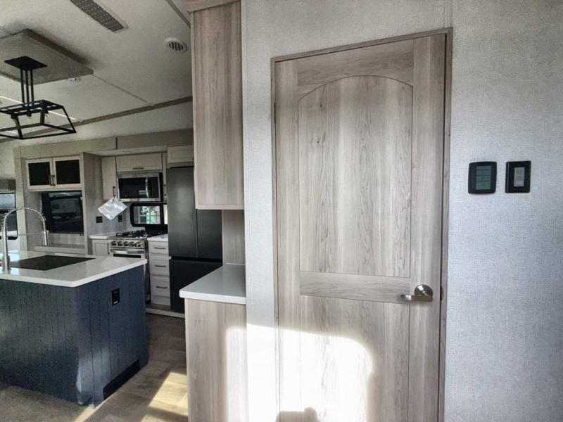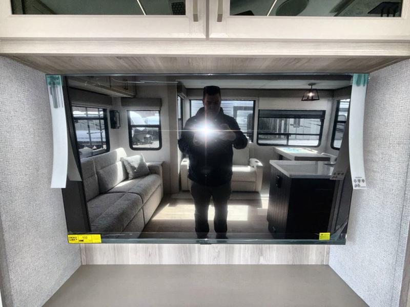 Everyone will stay clean with a bath and a half in this fifth wheel! The kitchen has a pantry big enough for everyone's favorite snacks, a gas cooktop, and a kitchen island to prepare your best meals. You can have game night indoors at the table and chairs or set up a table and chairs underneath the two power awnings. The rear living area offers a comfortable place to watch the big game too with a sofa/sleeper and theater seating directly across from the entertainment center with a 50" Smart TV and fireplace. Two can get ready at once in the front bathroom featuring a vanity with dual sinks, and since there is washer and dryer prep, you have the option to make wash day easier!