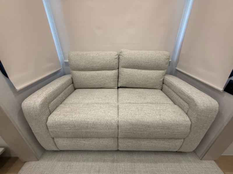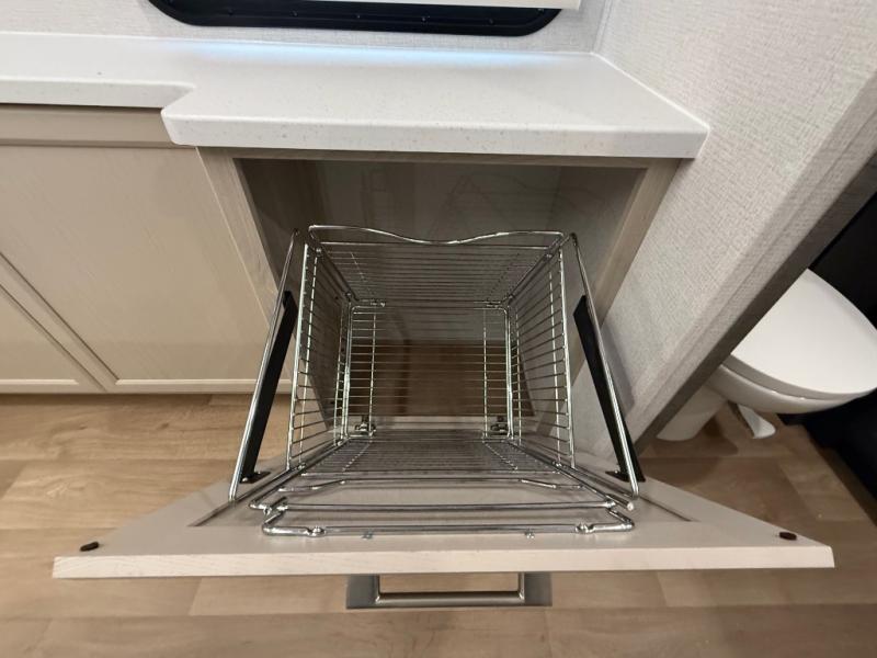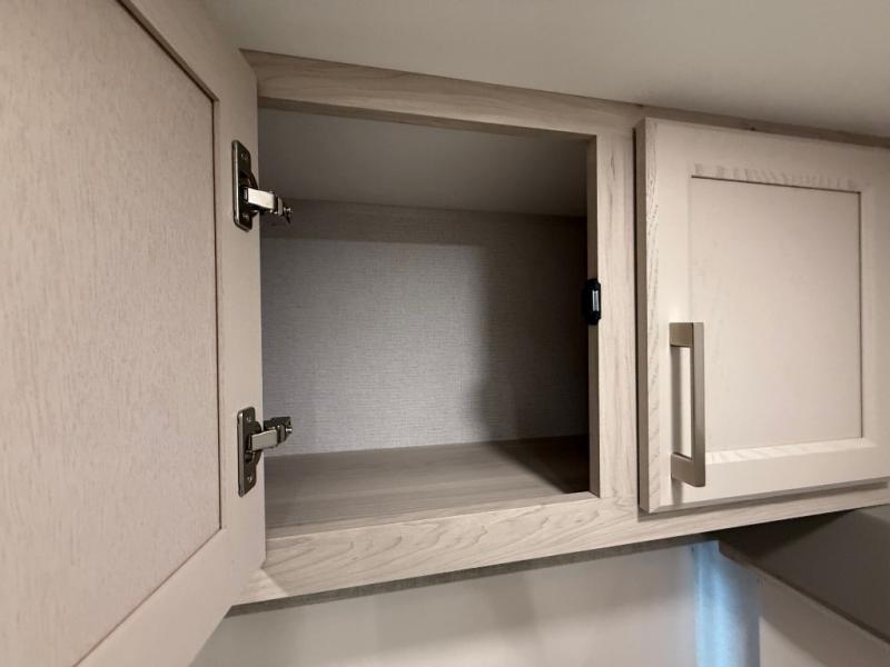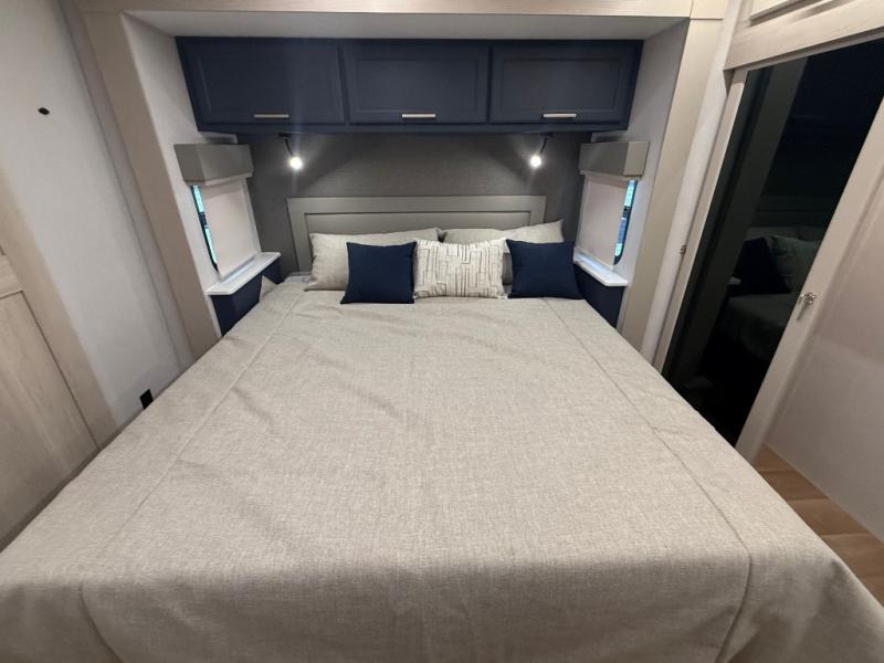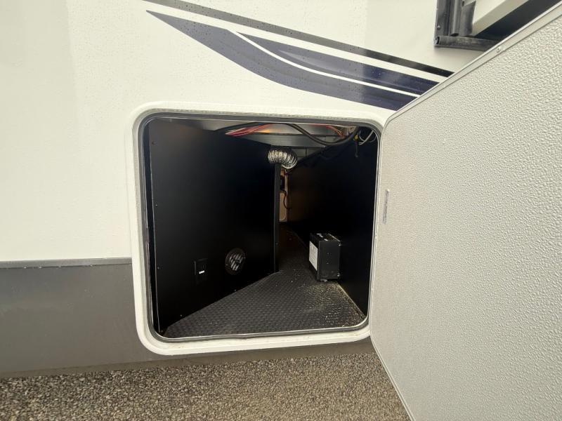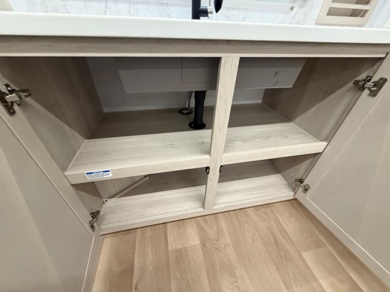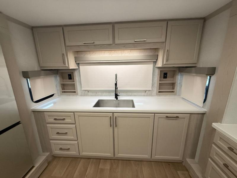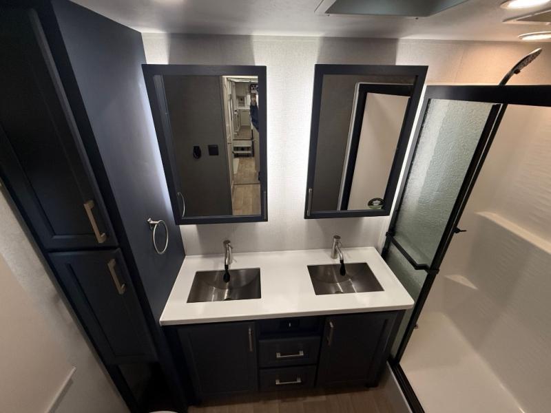 The front kitchen in this fifth wheel is a chef's dream come true while camping! There is generous counter space up front and beside the range, plus a pantry and 12V refrigerator with an ice maker. There is also a hi-top table with two bar stools that overlooks the living area. Inside the living area there are opposing sofa sleeper slides and power theater seating across from an entertainment center with a 50" Smart TV. A mid-coach half bath is easily accessible, and the full rear bath with dual bath sinks will create a master bedroom you are sure to love. There is a king bed slide out, a wardrobe, hamper, and a TV/storage.
