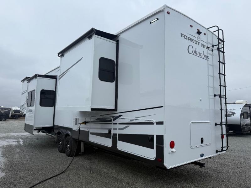 Experience a different camping life with residential furnishings and high-end features in each one of these Forest River Columbus fifth wheels! Durable construction begins with a 101" wide body, an all-welded aluminum frame superstructure, and high-gloss fiberglass vacuum bonded walls and slide out ends with dual Azdel. You will appreciate the Lippert axles, MORryde CRE 3000 suspension system, and 16" wheels with nitrogen-filled tires for a smooth tow from home to campground. Additional exterior features include a tire pressure monitoring system, a heated utility convenience center, an outside sprayer, and slam latch on all the storage doors. Inside, you'll be met with many luxurious amenities, including residential style crown molding throughout, roller day/night shades, upgraded true solid surface countertops in the bath and kitchen, plus solid wood steps.
