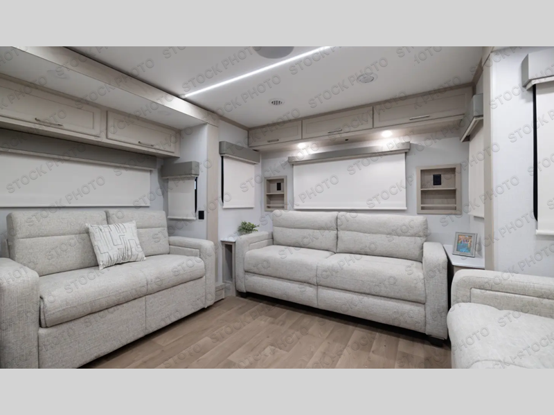 Comfort is found at every turn in this spacious fifth wheel! The front living area will be a favorite place to hang out with its dual 60" split tri-fold sofas, 78" sofa, and entertainment center with a fireplace. The chef of your group will find a middle kitchen, complete with a counter peninsula, a gas cooktop, a stainless-steel oven, plus a 12V stainless-steel residential style refrigerator with an ice maker. There is also a table and chairs where you can dine together each day. As you head to the rear of the unit, you'll find a half bath, which is convenient for all, and you're sure to enjoy your own space in the master bedroom. There is a king bed slide out here, a hamper, TV with storage, and a full rear bath with dual bath sinks; how convenient!