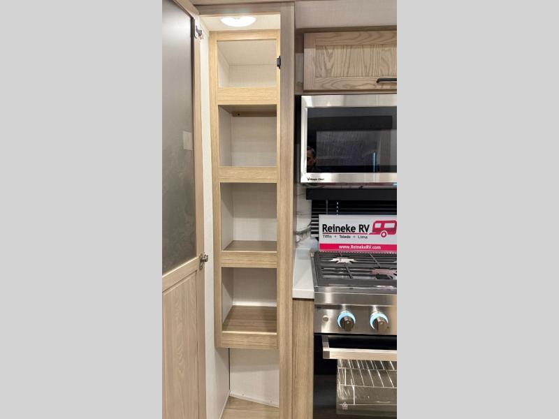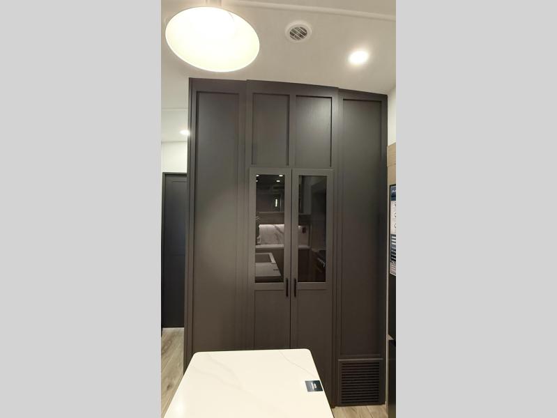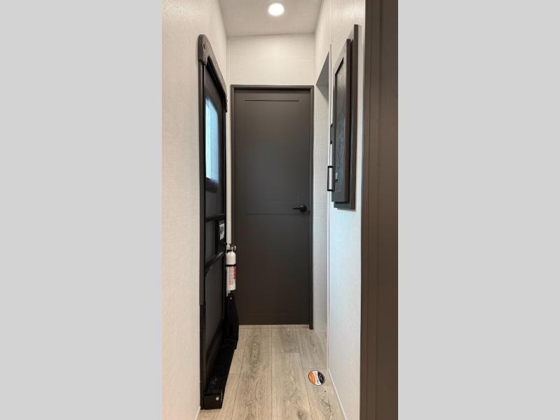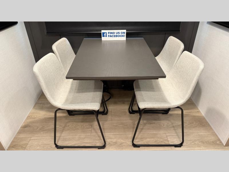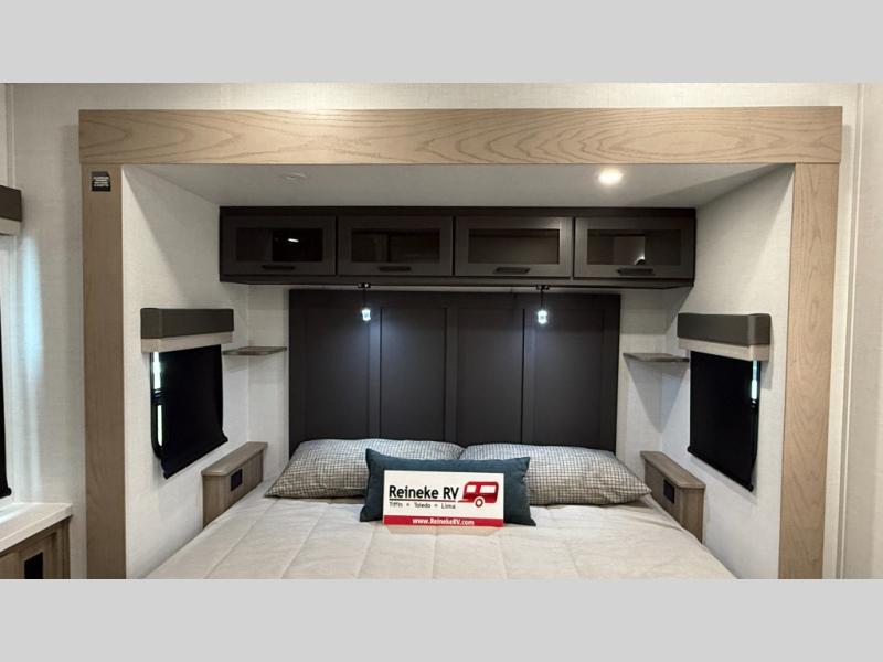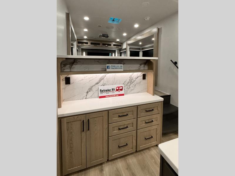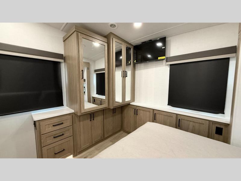 With five slide outs, a rear bedroom, and a front living area that can double as a guest bedroom, this fifth wheel is perfect for six campers! There are dual hide-a-bed sofas in the living room, along with a front theater seat across from a fireplace and televator TV. The middle kitchen includes two pantries and a 12V refrigerator for food storage, plus a rotating table and chairs to dine at. A full bath will let everyone freshen up after a day outdoors, and the rear bedroom will have you feeling right at home with its king bed slide out. There is also a wardrobe here, along with a TV option and washer/dryer prep!