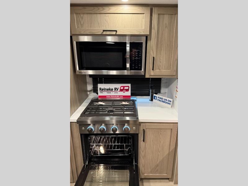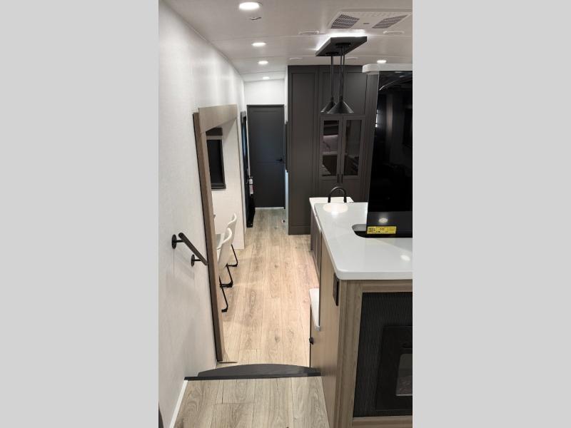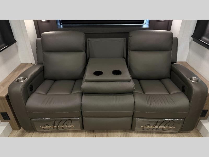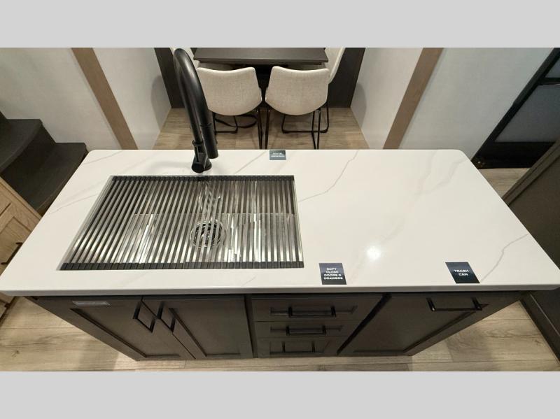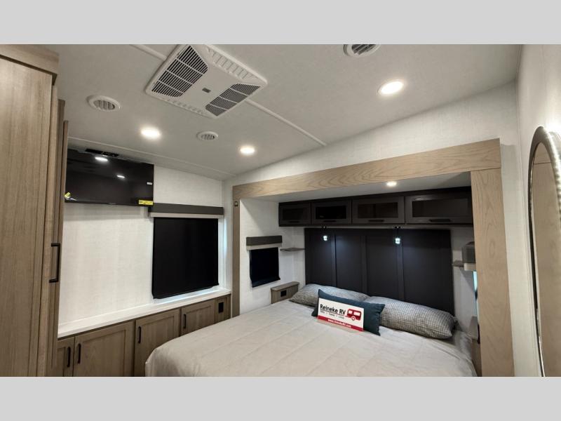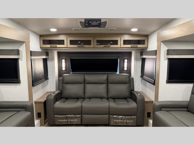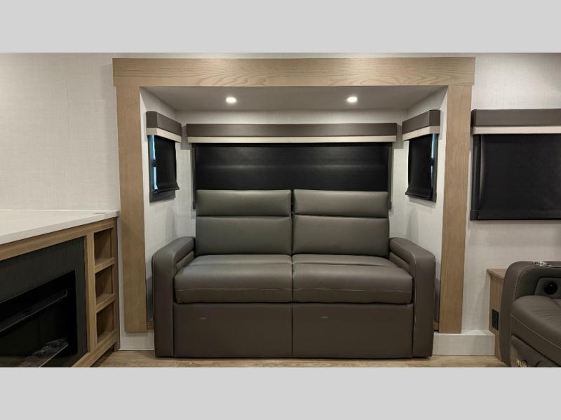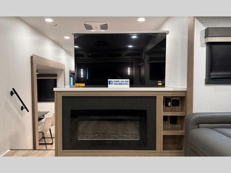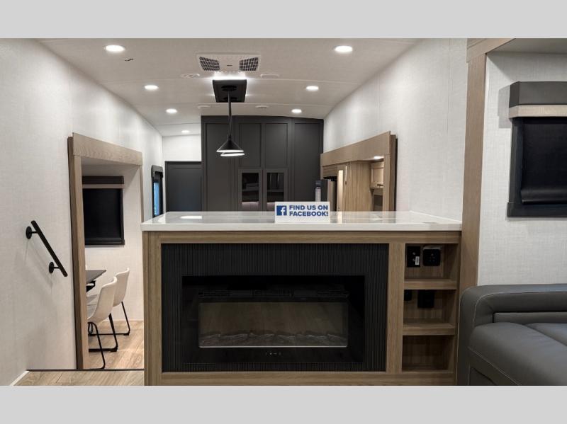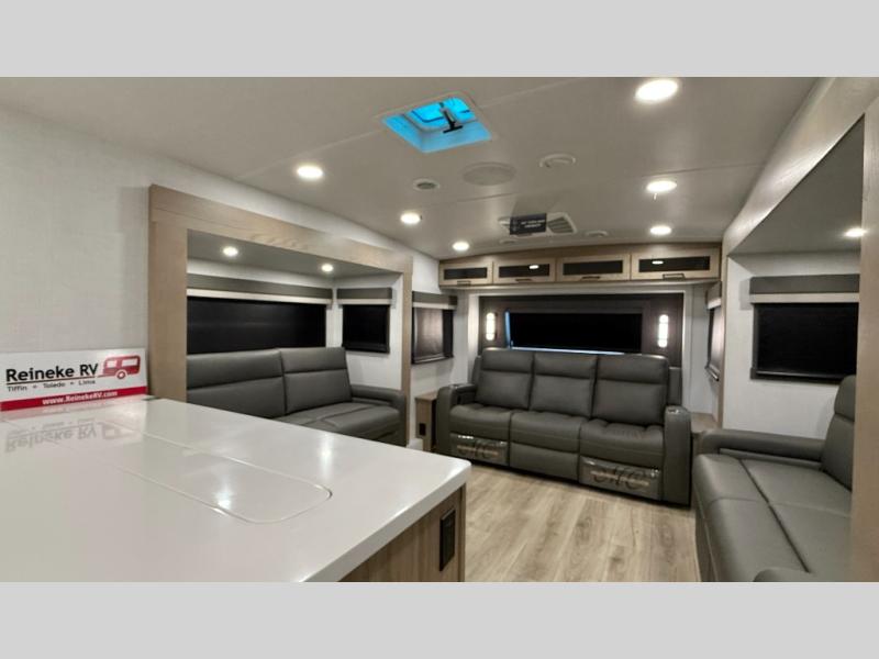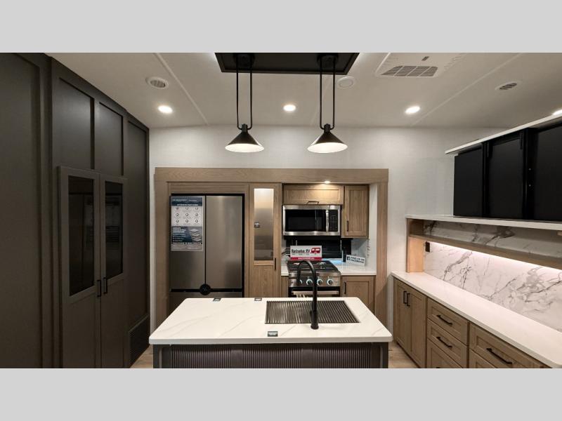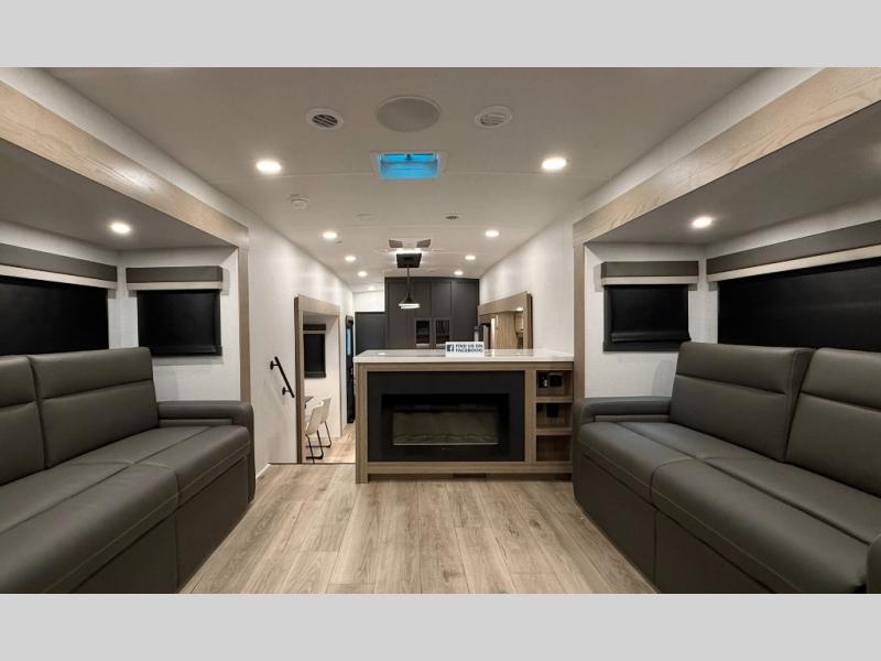 W/ Upgrade 4 Slide Toppers, 3rd 15K A/C & Bedroom TV. King Bed Slide, Front Living, 200W Solar, 5 Slideouts, 2 Power Awnings, Kitchen Island, Rotating Dinette Table & Chairs, 2 Hide A Bed Sofas, Theater Seat, 2 Pantries, Fireplace, Washer Dryer Prep & More