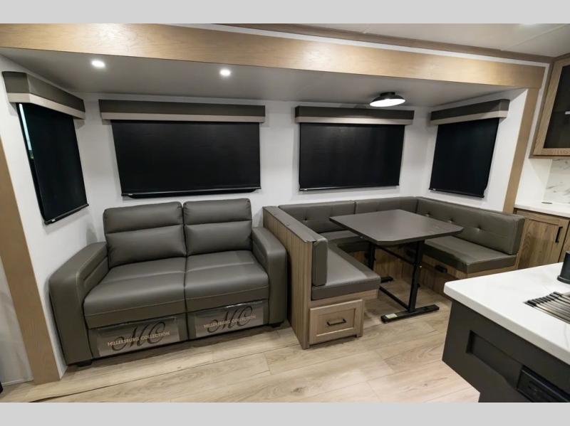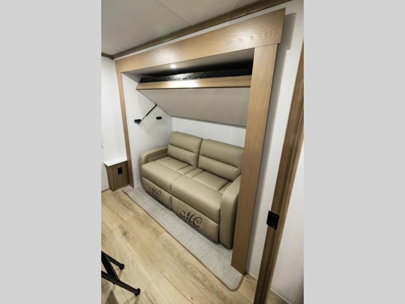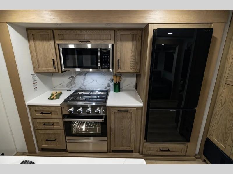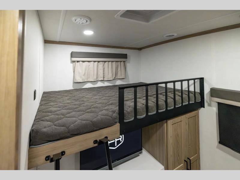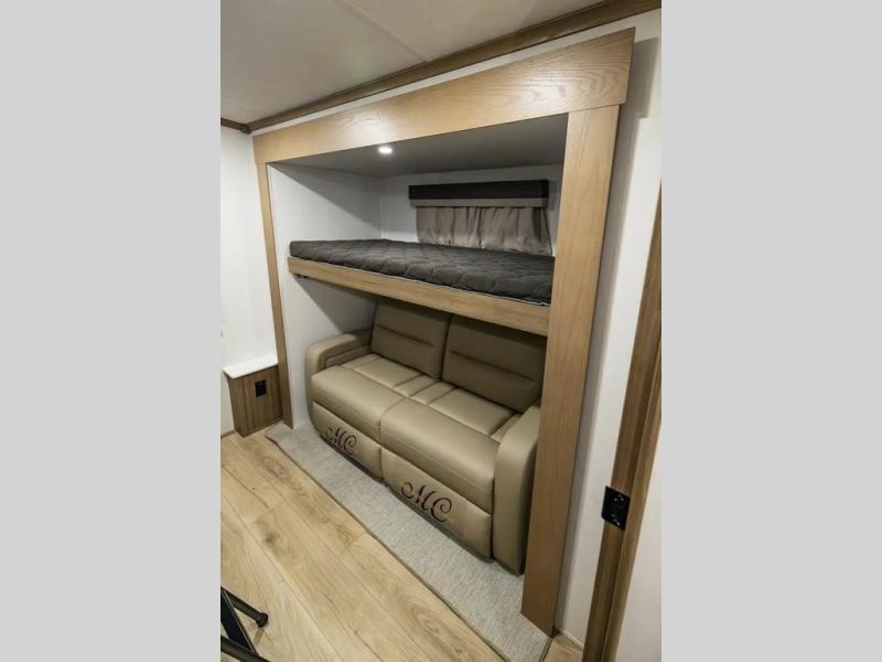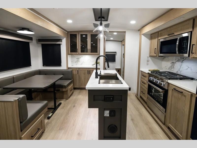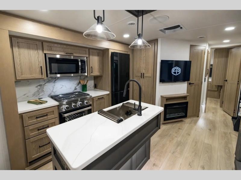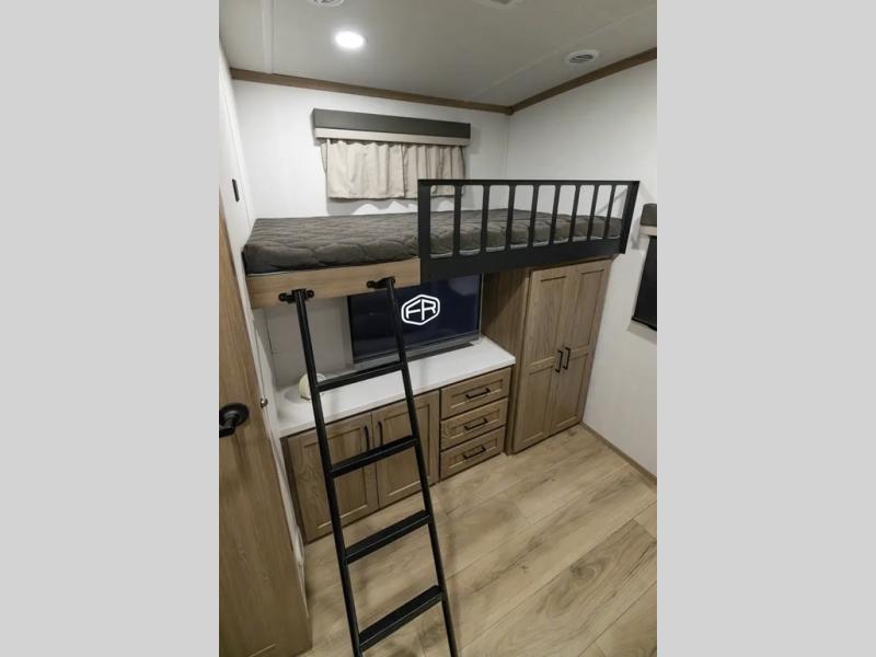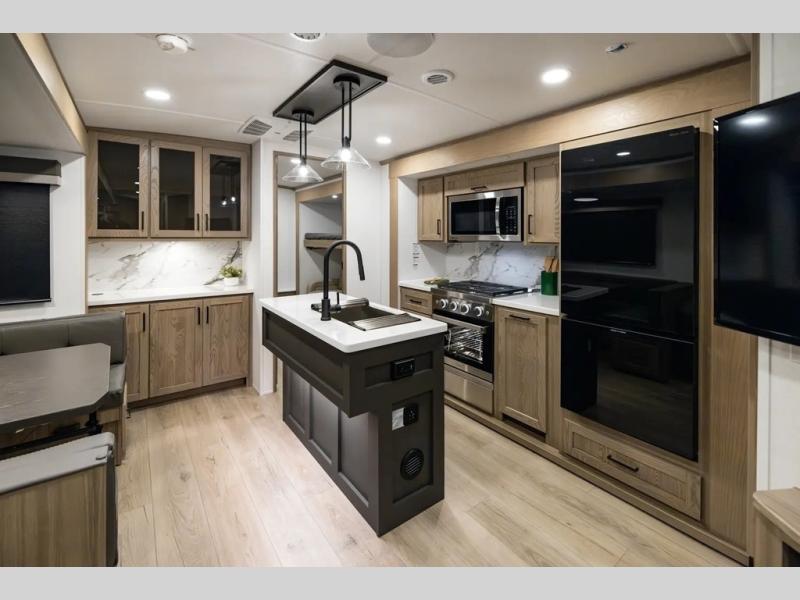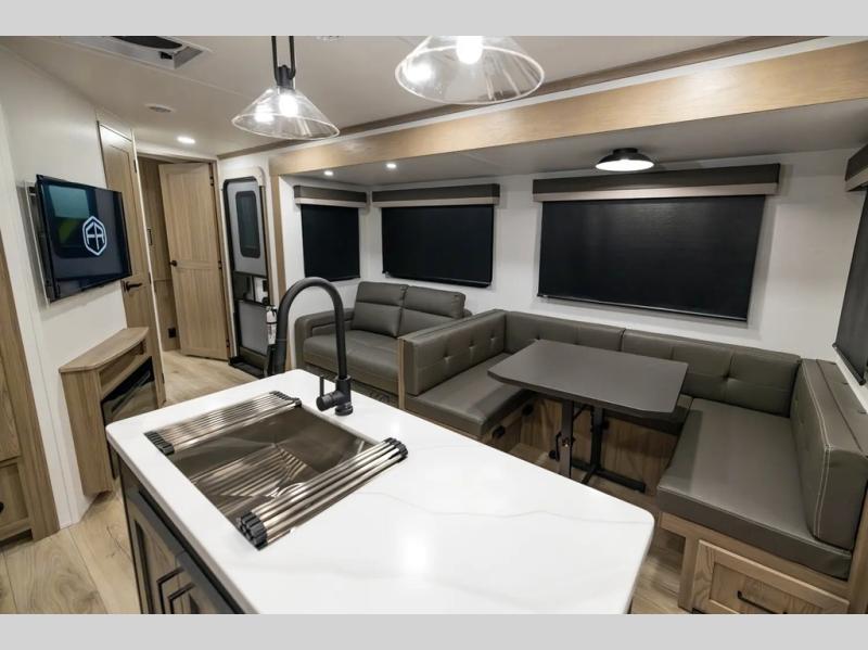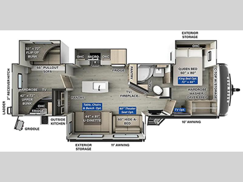 The whole family will love camping in this travel trailer! The kids have their own privacy within the rear bunkhouse that features a 42" x 72" upper bunk with a TV option below it along the curbside, and a flip-up bunk with a 68" pull-out sofa below it along the roadside. After you have prepared a delicious home-cooked meal with the three-burner cooktop and kitchen island, you can head to the 44" x 81" U-shaped dinette where everyone can gather around. You could even prepare dinner at the outside kitchen, set up a table and chairs, and eat underneath one of the two power awnings. The 60" hide-a-bed sofa is the perfect place to sit while enjoying the fireplace or watching your favorite movie on the Smart TV. A dual-entry bathroom makes it easy for everyone to access especially those staying in the front private bedroom!