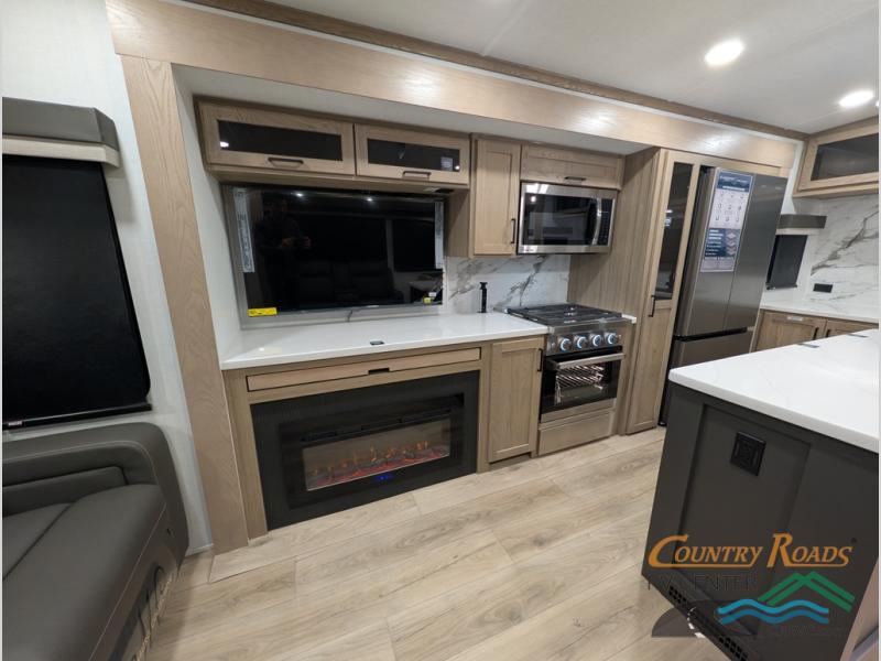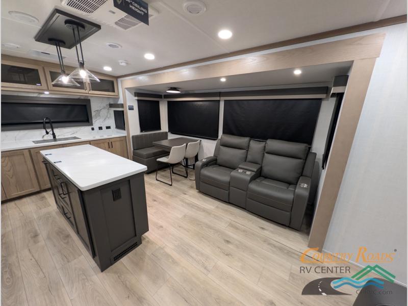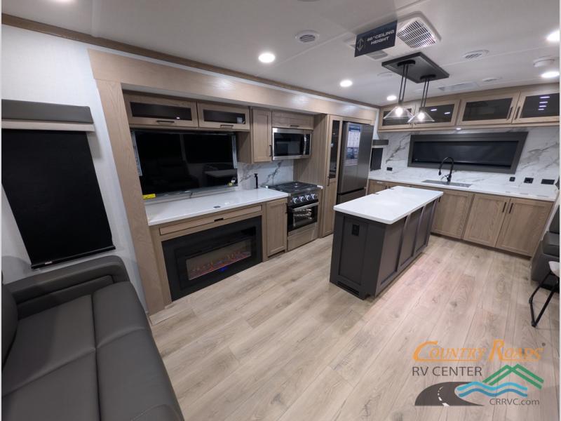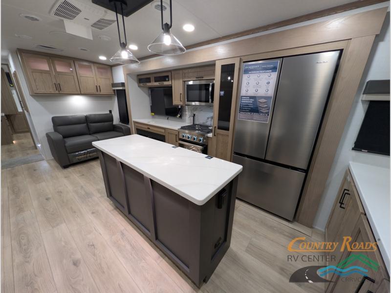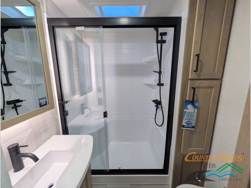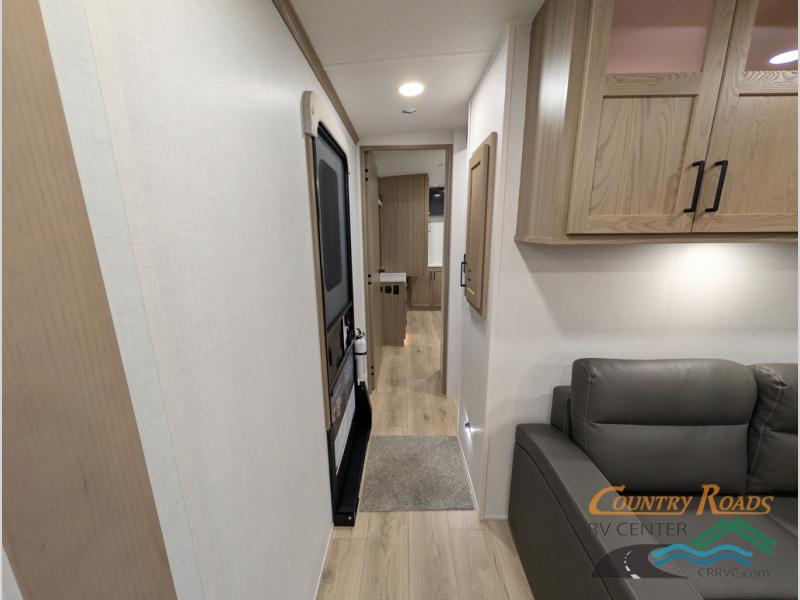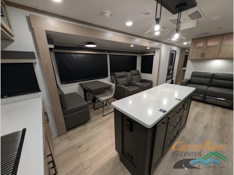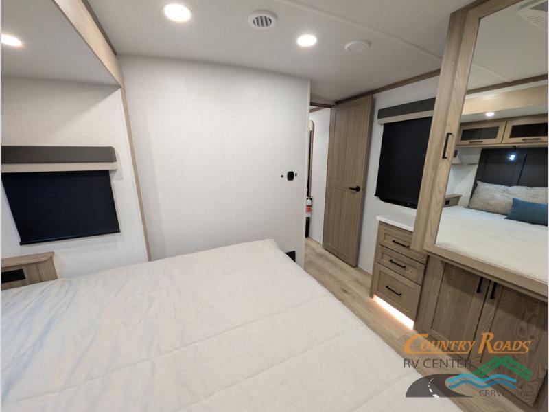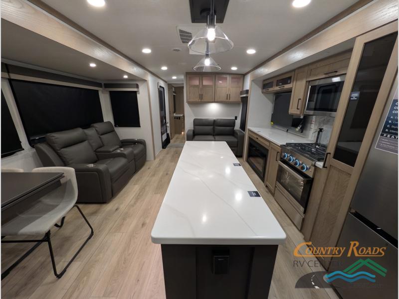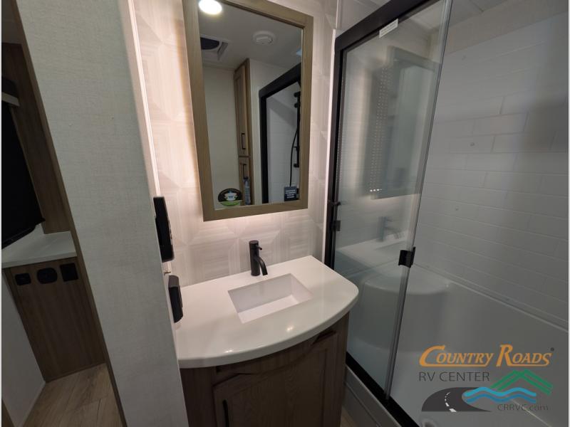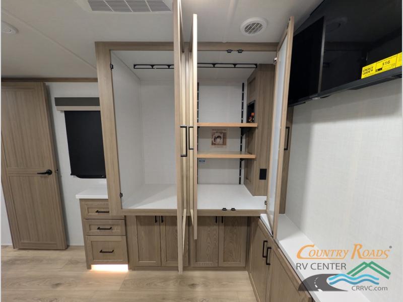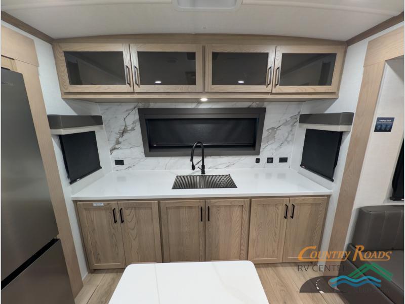 Pack your bags and head for the campground in this spacious travel trailer for four! There are dual opposing slides in the combined kitchen and living room plus a third slide out in the rear bedroom. You're sure to get a great night's rest on the king bed, and you can keep your room picked up thanks to the dresser and wardrobe. There is even washer and dryer prep if you choose to add those appliances. There are plenty of spaces to relax, including a theater seat and a hide-a-bed sofa, which will double as your guests' sleeping space. A large kitchen island and generous counter space lets the chef of your group whip up their best meals, and there is a table, chairs and a bench for dining space.