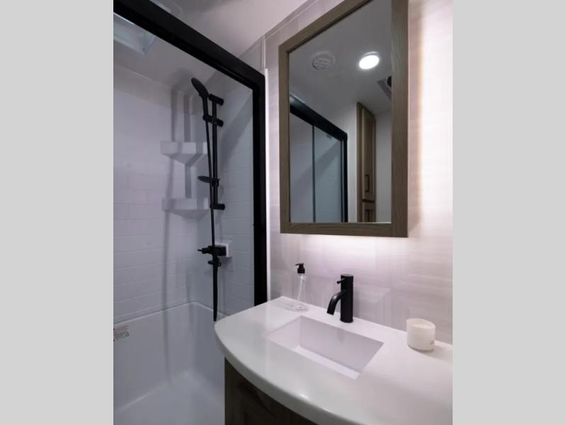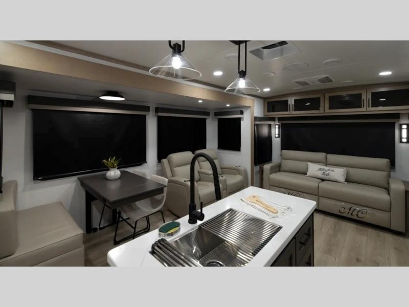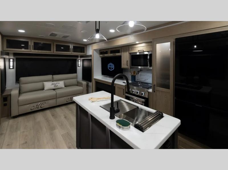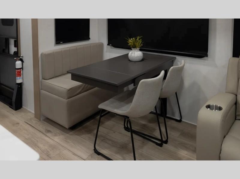 The large windows in the rear and door side slide will bring nature's scenery indoors with this travel trailer! Everyone can relax together in the rear living area featuring a 78" hide-a-bed sofa and 60" theater seating across from the entertainment center with a fireplace. Meal prepping will be even easier with the kitchen island, and the table and chairs with a bench is a comfortable place to enjoy your meals. The full bathroom has a shower with a seat and a linen closet to keep your towels close. You will feel well rested each morning after sleeping on the king bed slide in the front private bedroom which also has a wardrobe with washer and dryer prep and an area to add an optional TV!