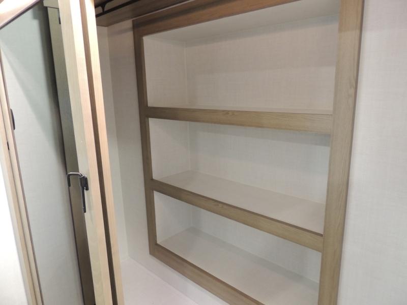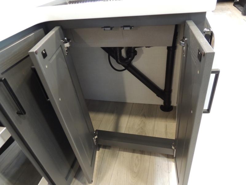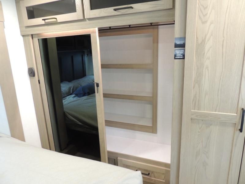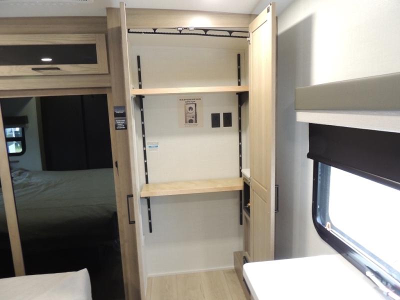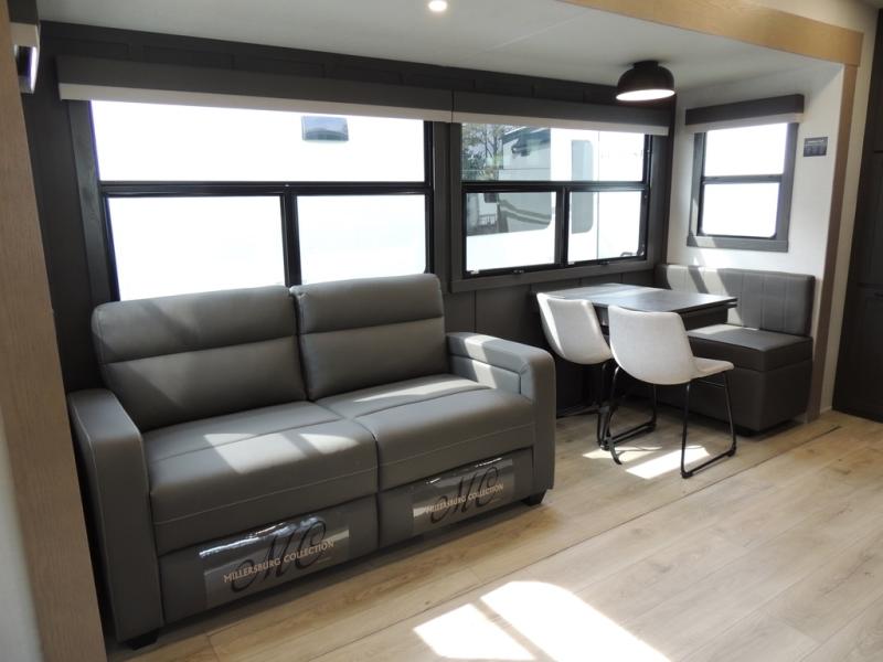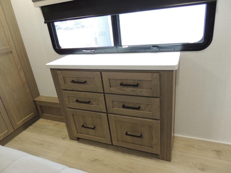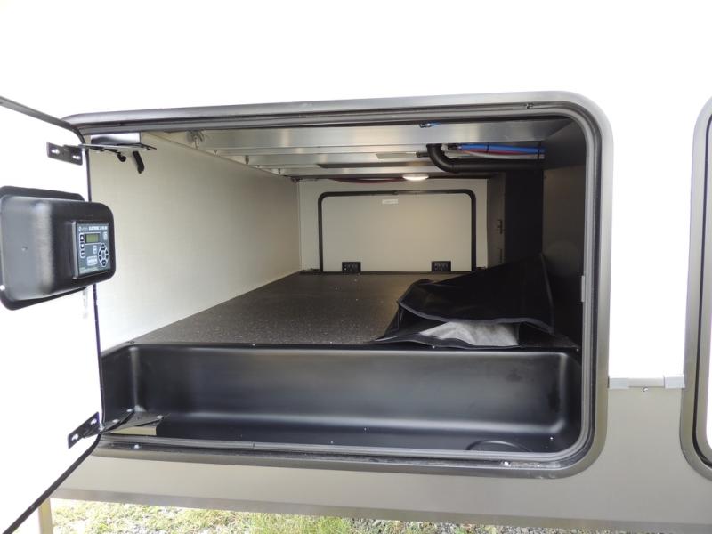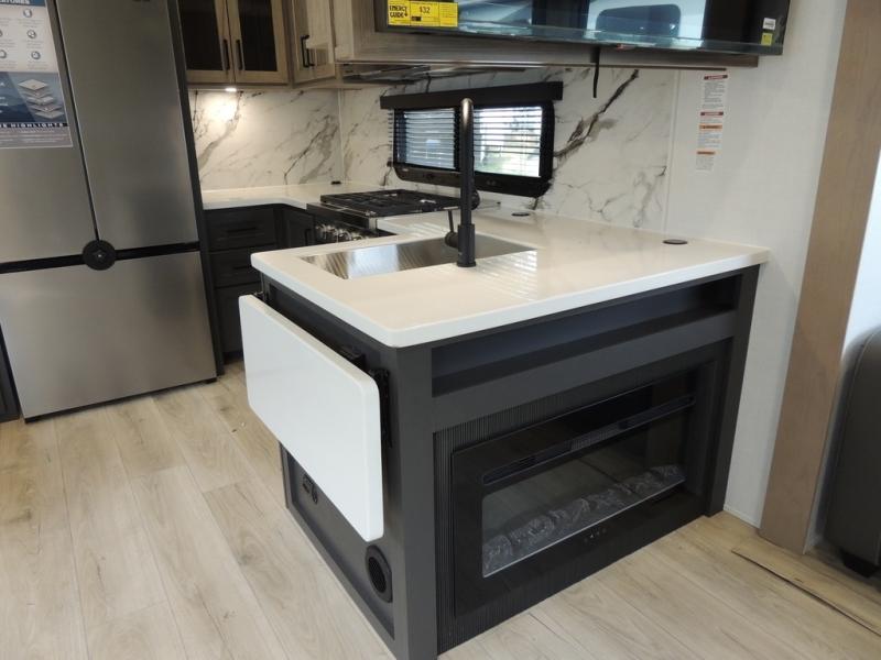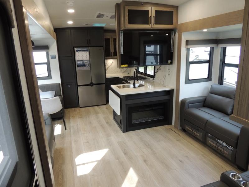 This fifth wheel has everything and then some! The front private bedroom has a queen bed slide with an optional king bed that can replace it and a front wardrobe with washer and dryer prep. Freshen up each morning in the full bathroom featuring a shower with a seat then head to the rear kitchen and scramble up some eggs on the three burner cooktop. You can enjoy your morning coffee and eggs at the table and chairs with a bench. In the middle living area there is a 60" theater seat across from an entertainment center with a fireplace and opposing hide-a-bed sofa slides. Outside, you'll find two power awnings, multiple exterior storage compartments and a pass-thru storage for fishing poles, camp gear and more!