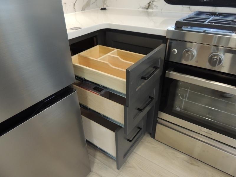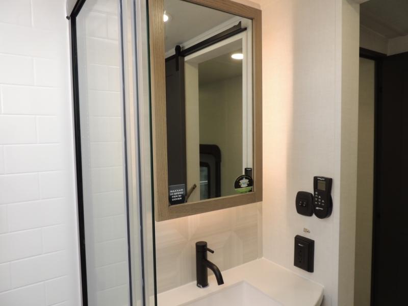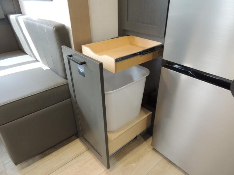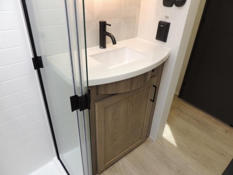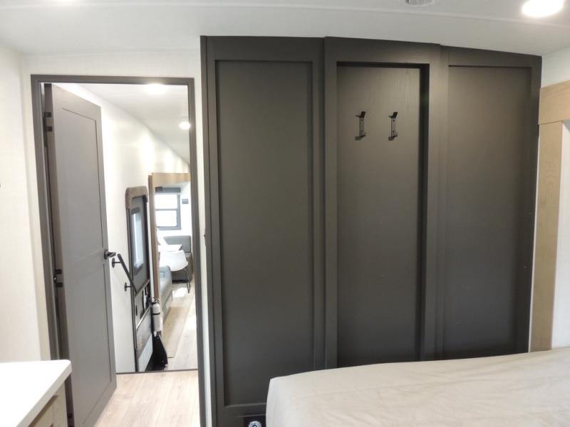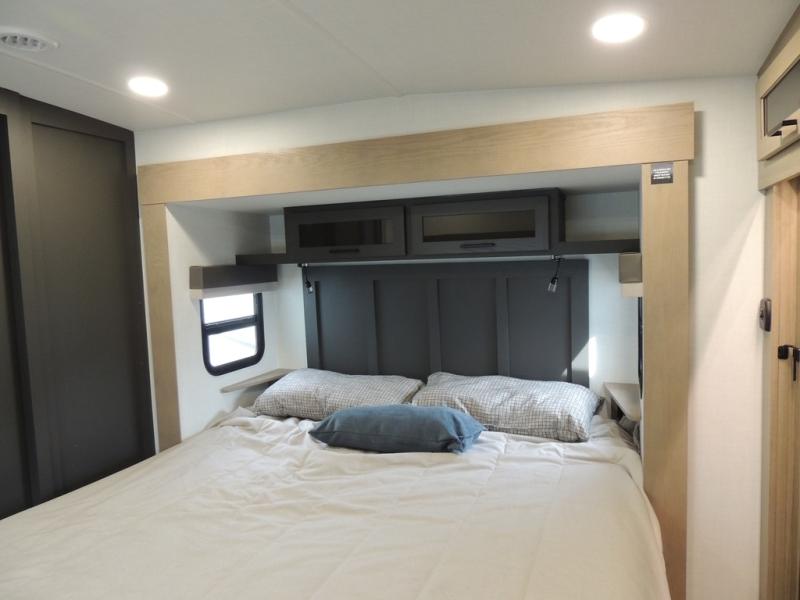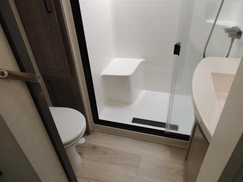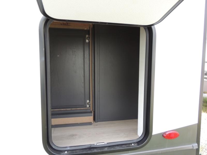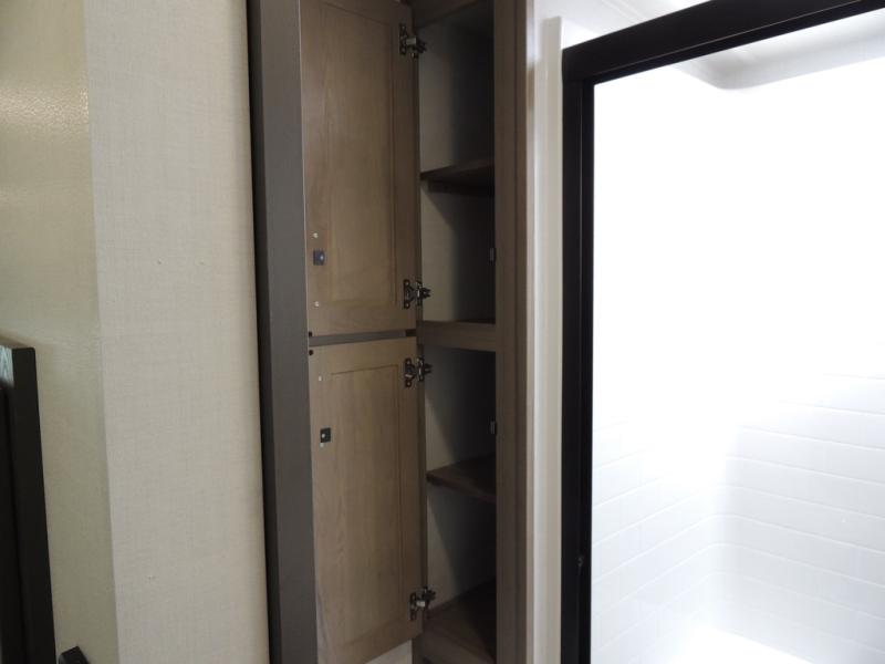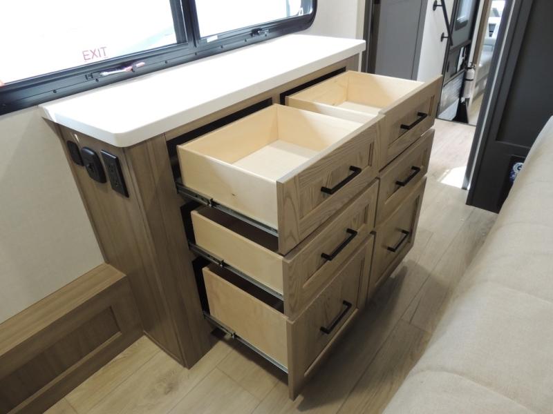 This fifth wheel has everything and then some! The front private bedroom has a queen bed slide with an optional king bed that can replace it and a front wardrobe with washer and dryer prep. Freshen up each morning in the full bathroom featuring a shower with a seat then head to the rear kitchen and scramble up some eggs on the three burner cooktop. You can enjoy your morning coffee and eggs at the table and chairs with a bench. In the middle living area there is a 60" theater seat across from an entertainment center with a fireplace and opposing hide-a-bed sofa slides. Outside, you'll find two power awnings, multiple exterior storage compartments and a pass-thru storage for fishing poles, camp gear and more!