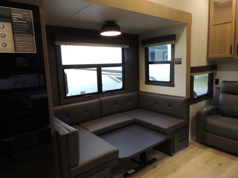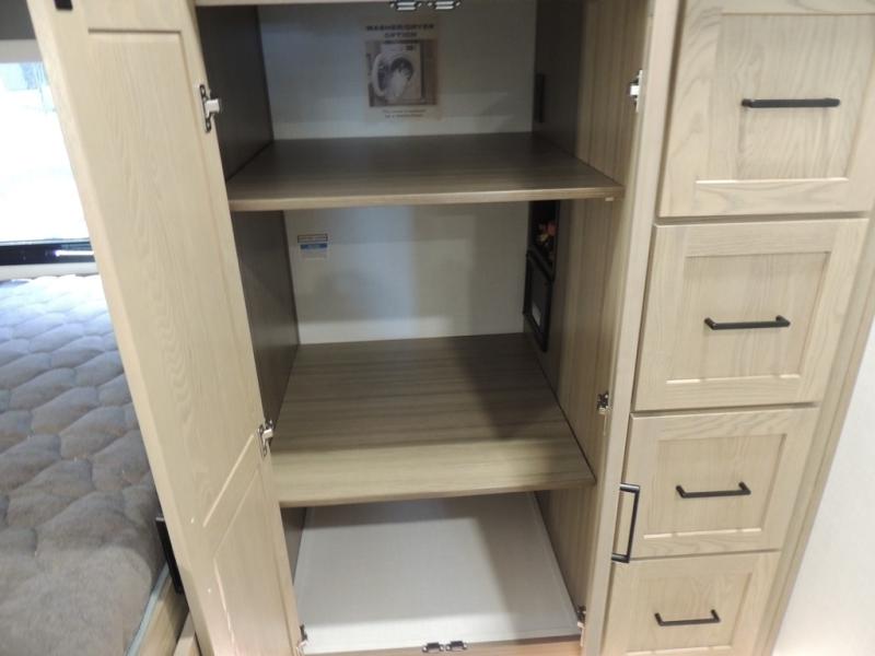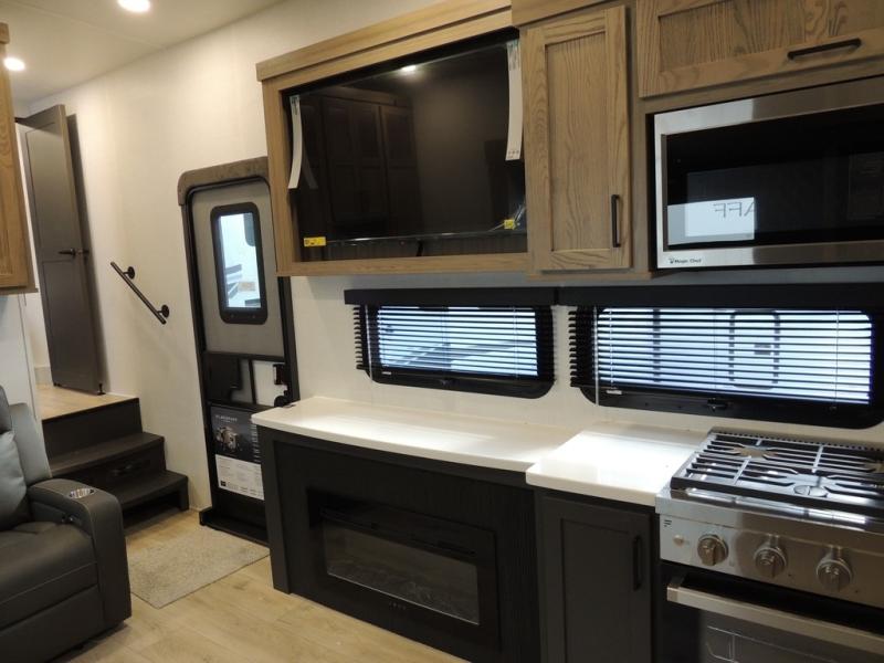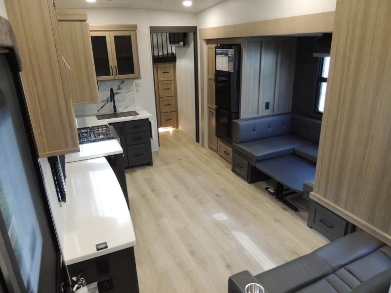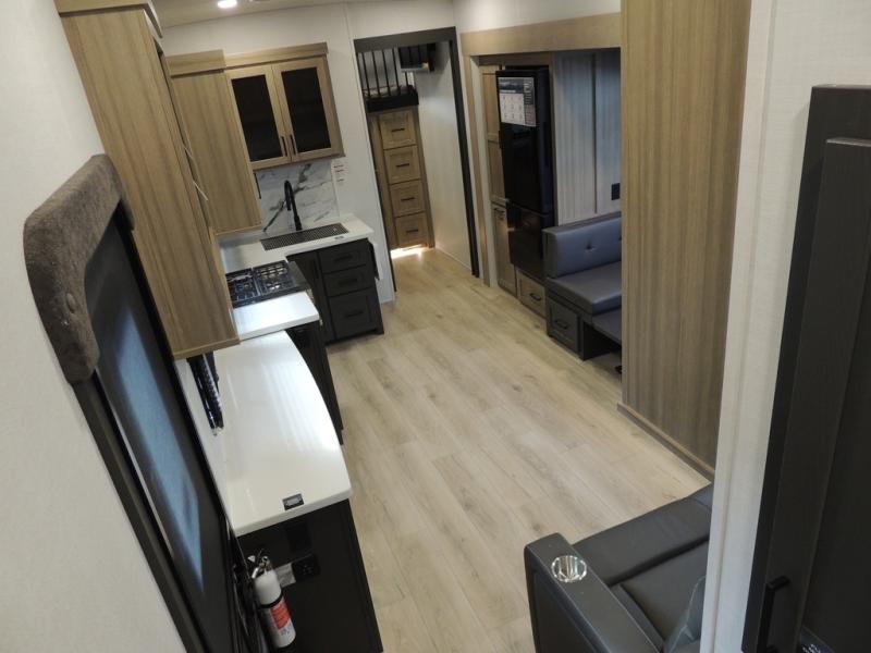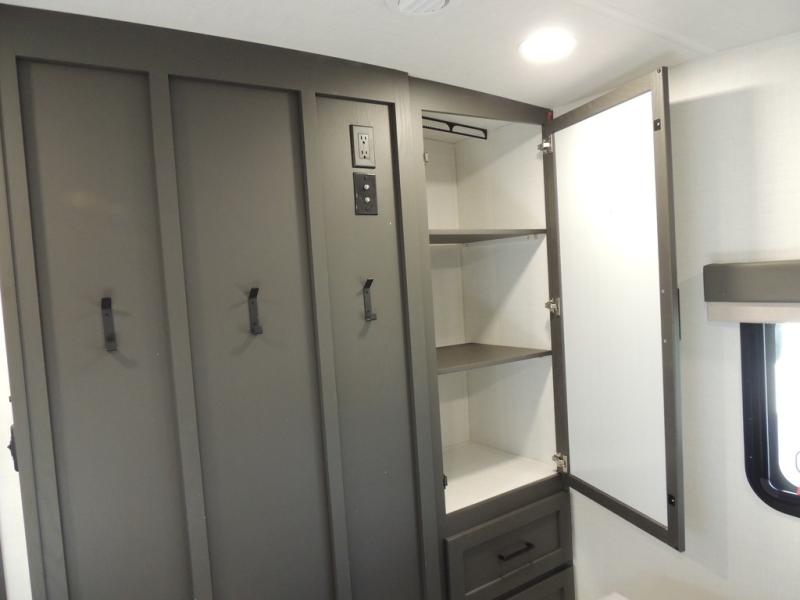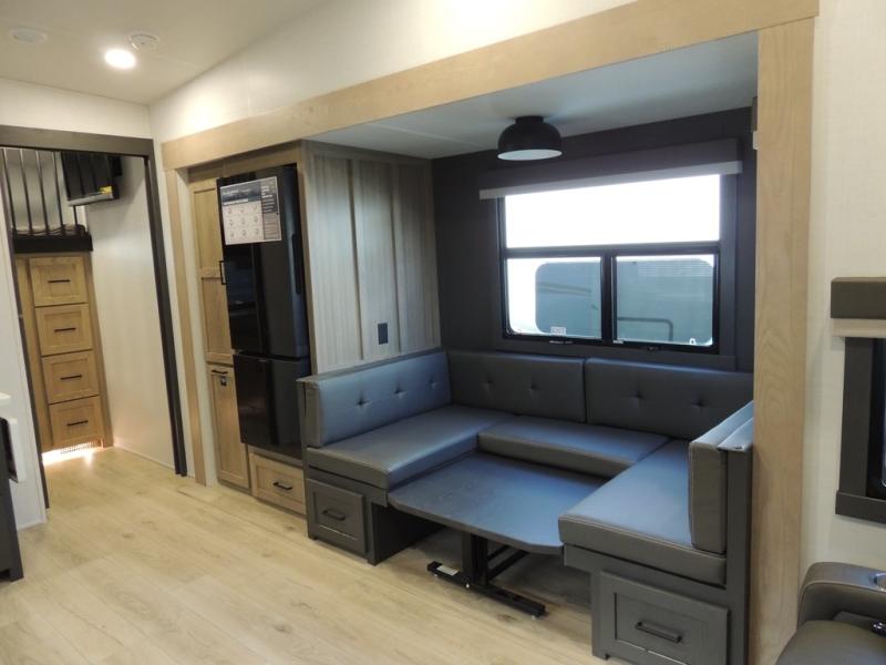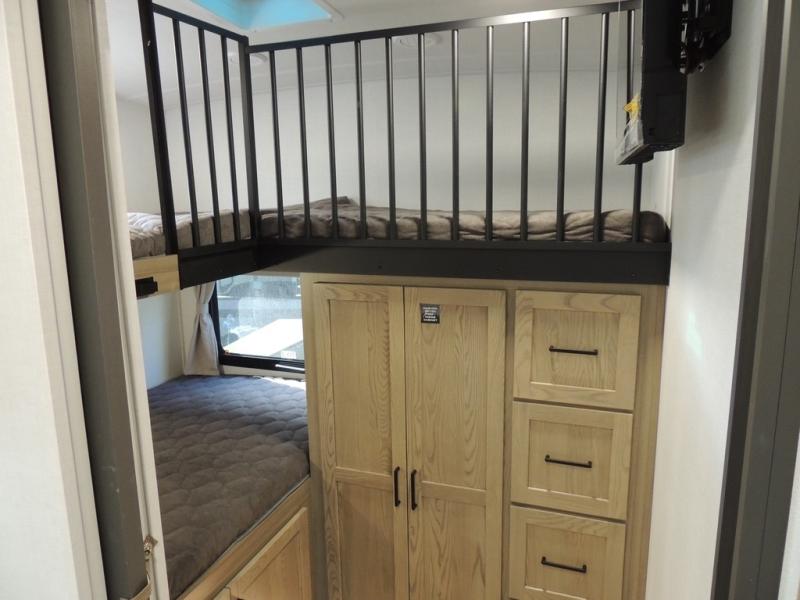 If you have a larger family or friend group this fifth wheel will allow you to bring everyone with sleeping space for eight campers. The kids or your guests will have privacy in the rear bunkhouse which offers a single 32" top bunk, and a 42" x 72" bunk over a 47" x 72" lower bunk, plus washer and dryer prep if you want to add those appliances. You will have privacy on the opposite side of the RV in the front bedroom which offers a queen bed with a king bed option, a wardrobe and an optional TV if you like to watch movies in bed. And don't forget about all the kitchen amenities and the living area furniture which includes a theater seat and a king U-shaped dinette, Smart TV and fireplace. Outside, you will find pass-through storage, two power awnings, an outside kitchen, and additional outside storage for even more camp gear!