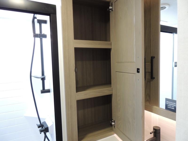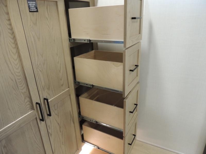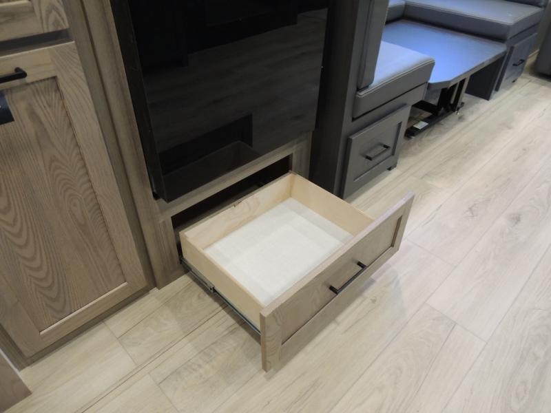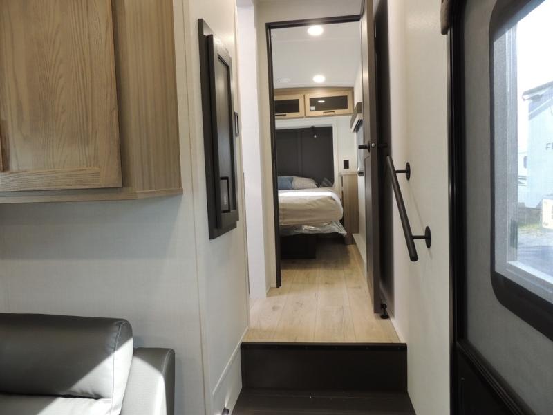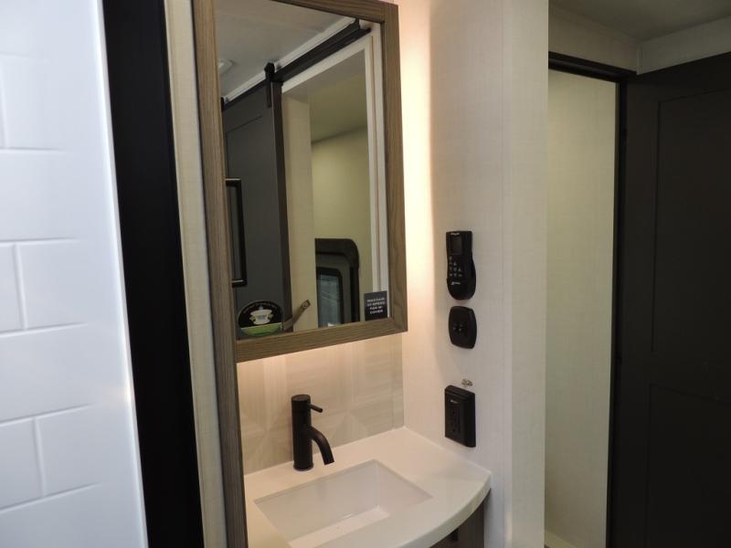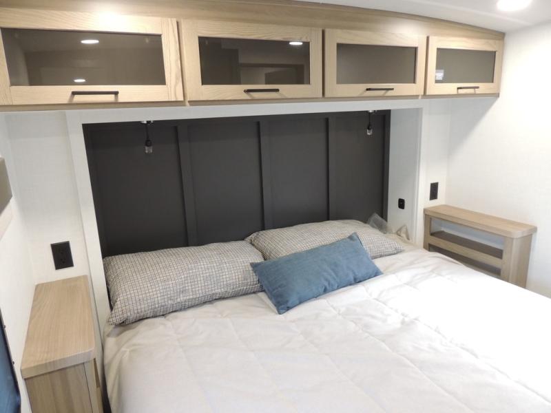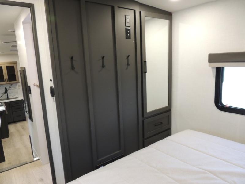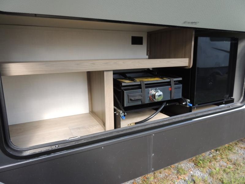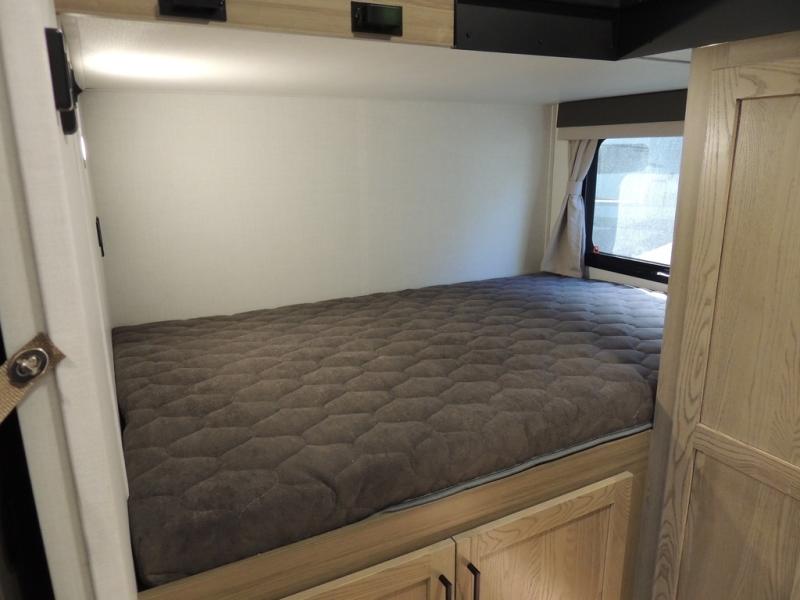 If you have a larger family or friend group this fifth wheel will allow you to bring everyone with sleeping space for eight campers. The kids or your guests will have privacy in the rear bunkhouse which offers a single 32" top bunk, and a 42" x 72" bunk over a 47" x 72" lower bunk, plus washer and dryer prep if you want to add those appliances. You will have privacy on the opposite side of the RV in the front bedroom which offers a queen bed with a king bed option, a wardrobe and an optional TV if you like to watch movies in bed. And don't forget about all the kitchen amenities and the living area furniture which includes a theater seat and a king U-shaped dinette, Smart TV and fireplace. Outside, you will find pass-through storage, two power awnings, an outside kitchen, and additional outside storage for even more camp gear!