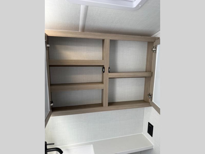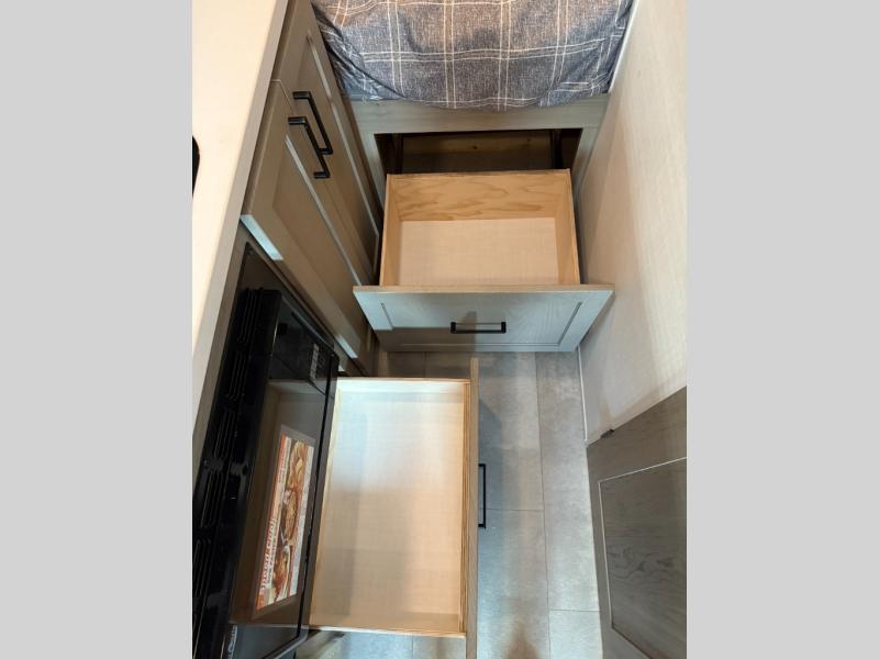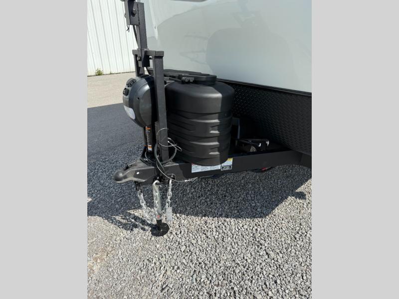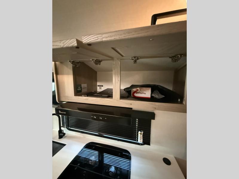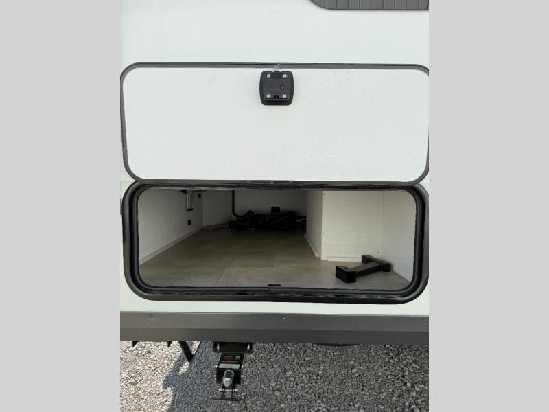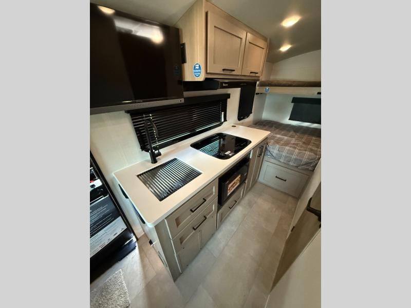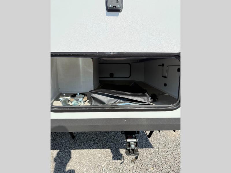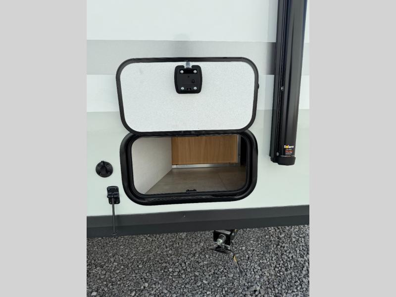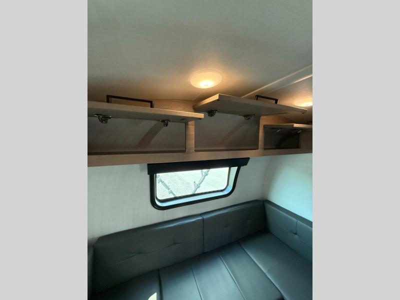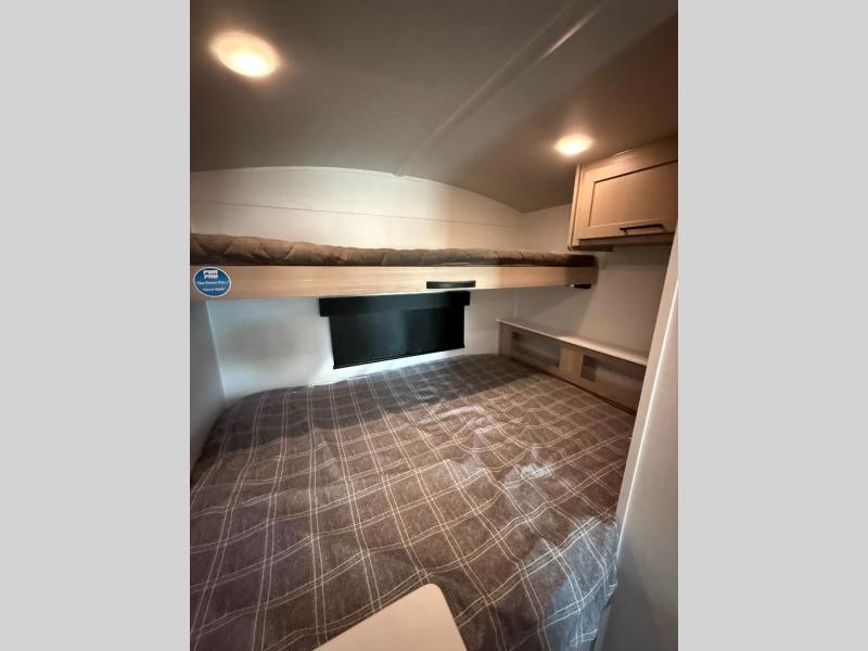 Your small family will enjoy camping in this travel trailer! The 26" x 80" flip-up bunk provides a comfortable place to sleep above the 54" x 74" full bed, as well as the front 54" x 81" U-shaped dinette once converted. You even have a 32" TV nearby to watch your favorite movies. Freshen up in the full bathroom each morning and warm up a cinnamon roll in the microwave or grab some eggs from the 12V refrigerator then fry them up on the recessed three burner cooktop. There is also an outside griddle underneath the 15' power awning, and the pass-thru storage will be perfect for fishing poles!