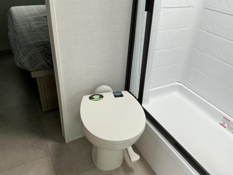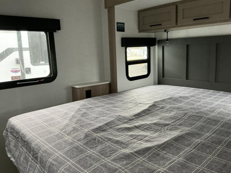Unwind and relax in style, with plenty of storage space to keep you organized. The rear bedroom is a peaceful retreat, featuring a queen bed, spacious wardrobe, desk, and TV. The walkthrough bathroom is a practical and refreshing space, with a linen closet to keep your towels and toiletries tidy. Plus, the kitchen is equipped with a fridge, convection microwave, dinette, sink, and overhead cabinets, so you can prepare delicious meals and snacks with ease and enjoy quality time with loved ones.