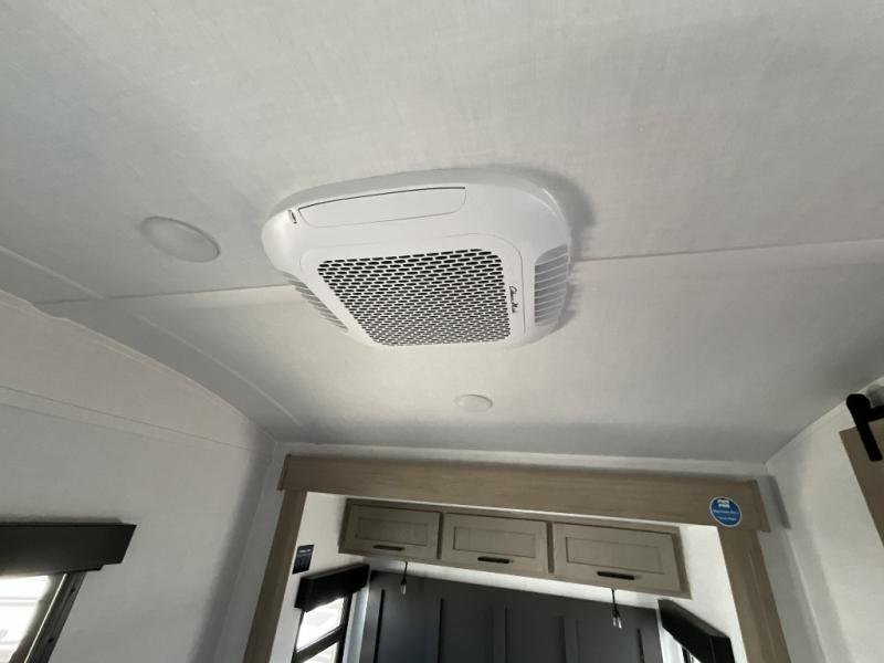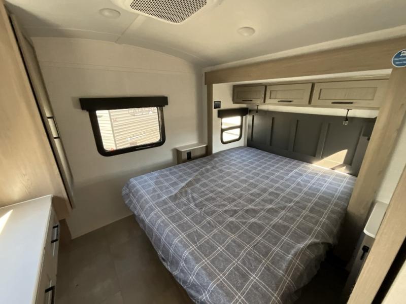 Unwind and relax in style, with plenty of storage space to keep you organized. The rear bedroom is a peaceful retreat, featuring a queen bed, spacious wardrobe, desk, and TV. The walkthrough bathroom is a practical and refreshing space, with a linen closet to keep your towels and toiletries tidy. Plus, the kitchen is equipped with a fridge, convection microwave, dinette, sink, and overhead cabinets, so you can prepare delicious meals and snacks with ease and enjoy quality time with loved ones.
