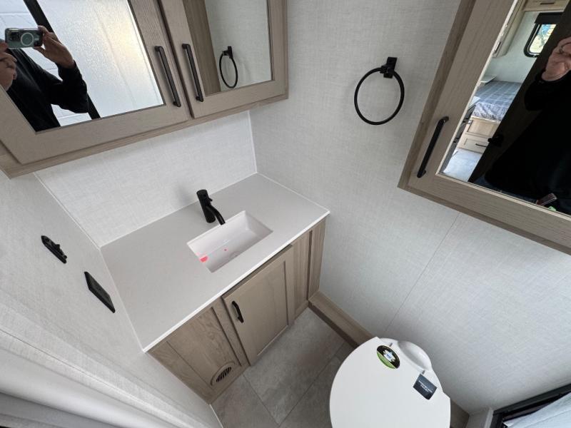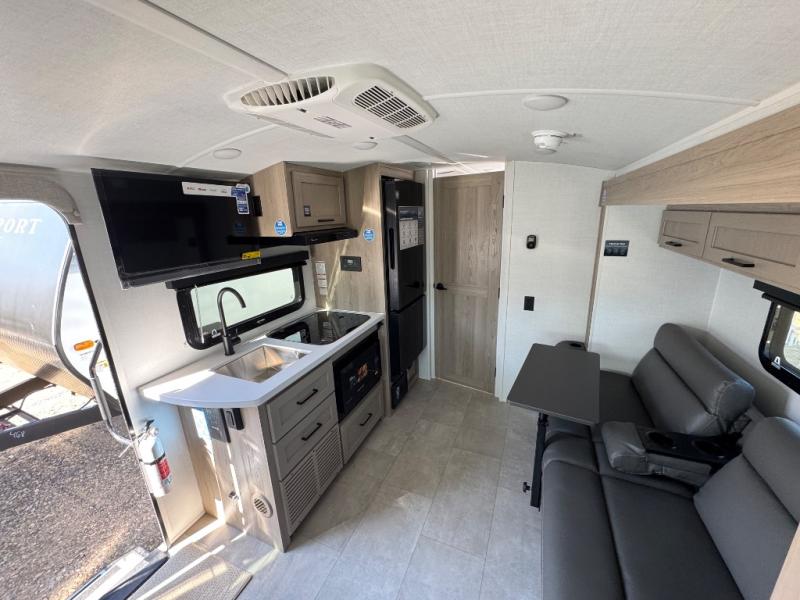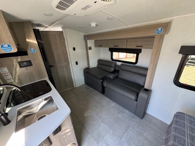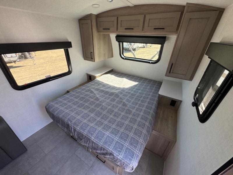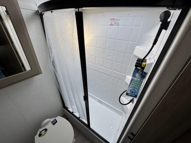 Get ready for a spacious and comfortable trip in this trailer, plus you will have a convenient rear full bathroom with an oversized shower and linen storage to utilize instead of using the campground's facilities. The walk-around full bed gives you two sides with wardrobes to claim as your own. And the kitchen offers full amenities to make meals. You can relax, dine, or even work from the slide out sofa with a 30" x 15" table and watch the TV. You will find storage along the exterior for your outdoor gear, plus a 14' power awning.
