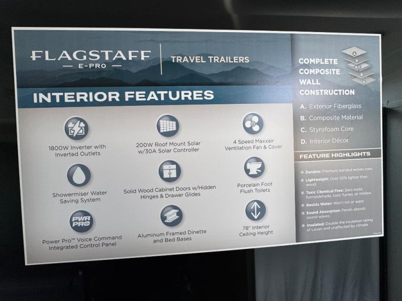 With any Flagstaff E-Pro travel trailer by Forest River, you will experience lightweight towing, style and features that will meet your needs, plus amenities that give you more than you expected! Built with interior and exterior composite sidewall construction for added strength and durability, a fully laminated roof for weather-tight protection, and aluminum truss roof bracing for enhanced stability. These trailers are equipped with Dexter leaf-spring axles for smooth towing and durable performance. The interior features an aluminum dinette, bed, and bunk, providing a strong and lightweight framework for comfortable living. Additionally, the backup camera prep ensures a safe and stress-free reversing experience. Make your selection today!