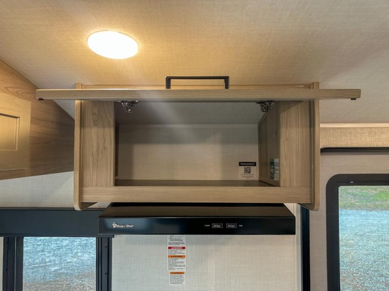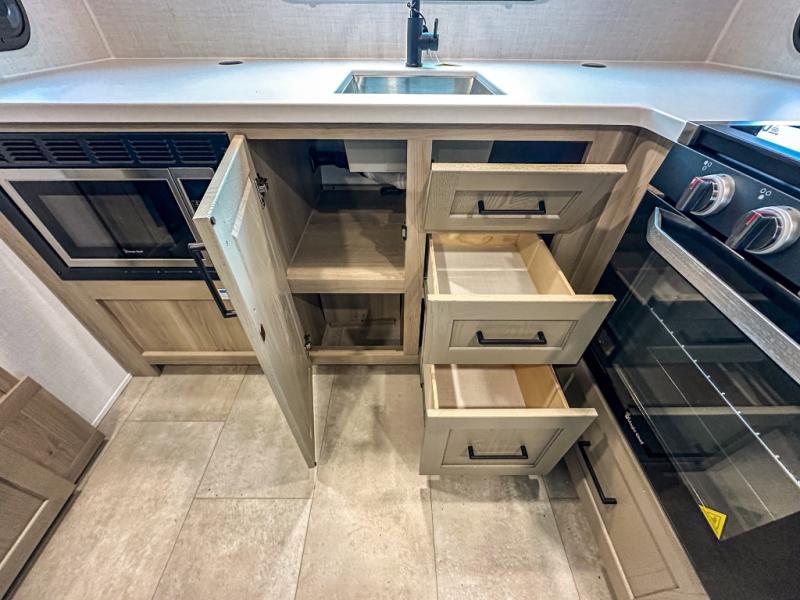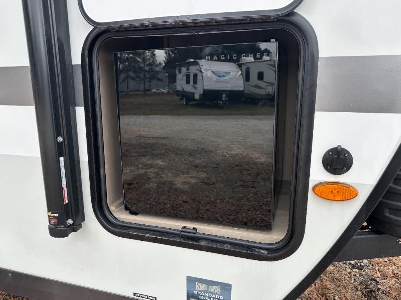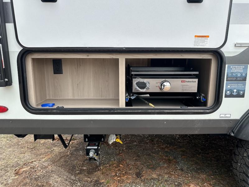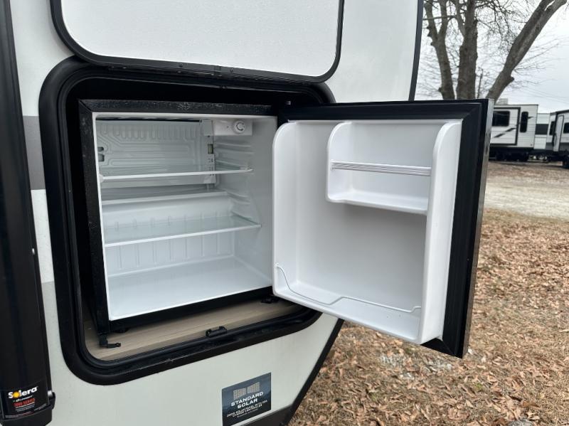 The chef will love cooking in the front kitchen of this travel trailer! It offers plenty of countertop space to meal prep and all of the essentials to cook delicious meals, plus there is even an outside kitchen with a refrigerator, a pull-out stove, and a griddle to fry what you caught that day. Enjoy all of your meals at the 72" sofa slide with a table or pull up a table and chairs under the 15' power awning. The queen bed offers a comfortable place for you to rest up each night and it even has a 26" x 80" flip-up bunk above it for a guest or two to tag along. Store all of your camping essentials in the exterior storage.
